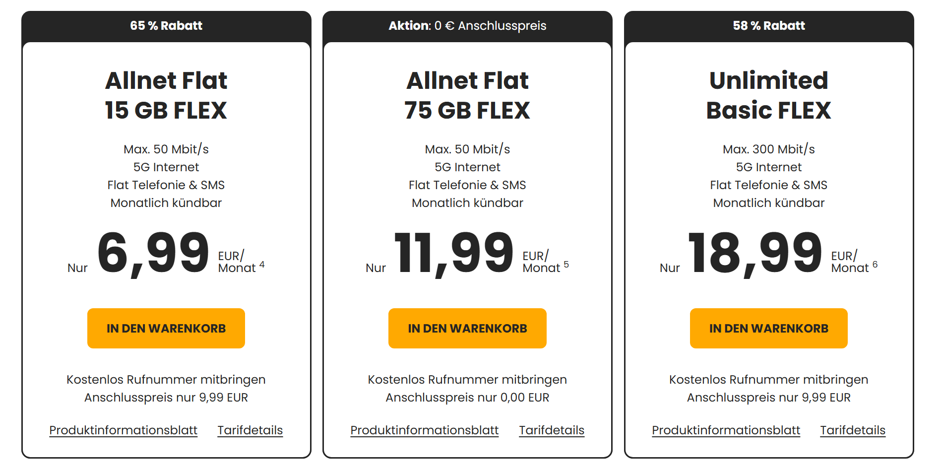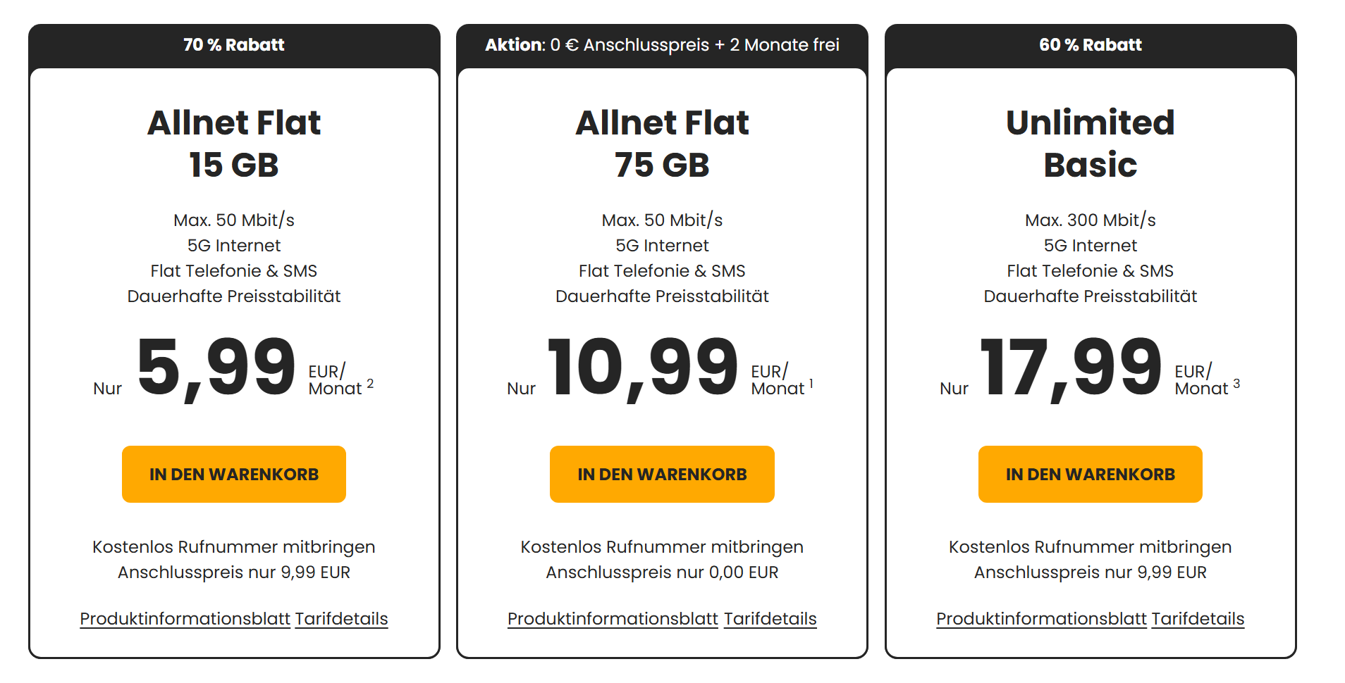 | Allnet Flat 75GB 5G | 0€ | 10,99€ (zwei Freimonate!) | 50Mbit/s |