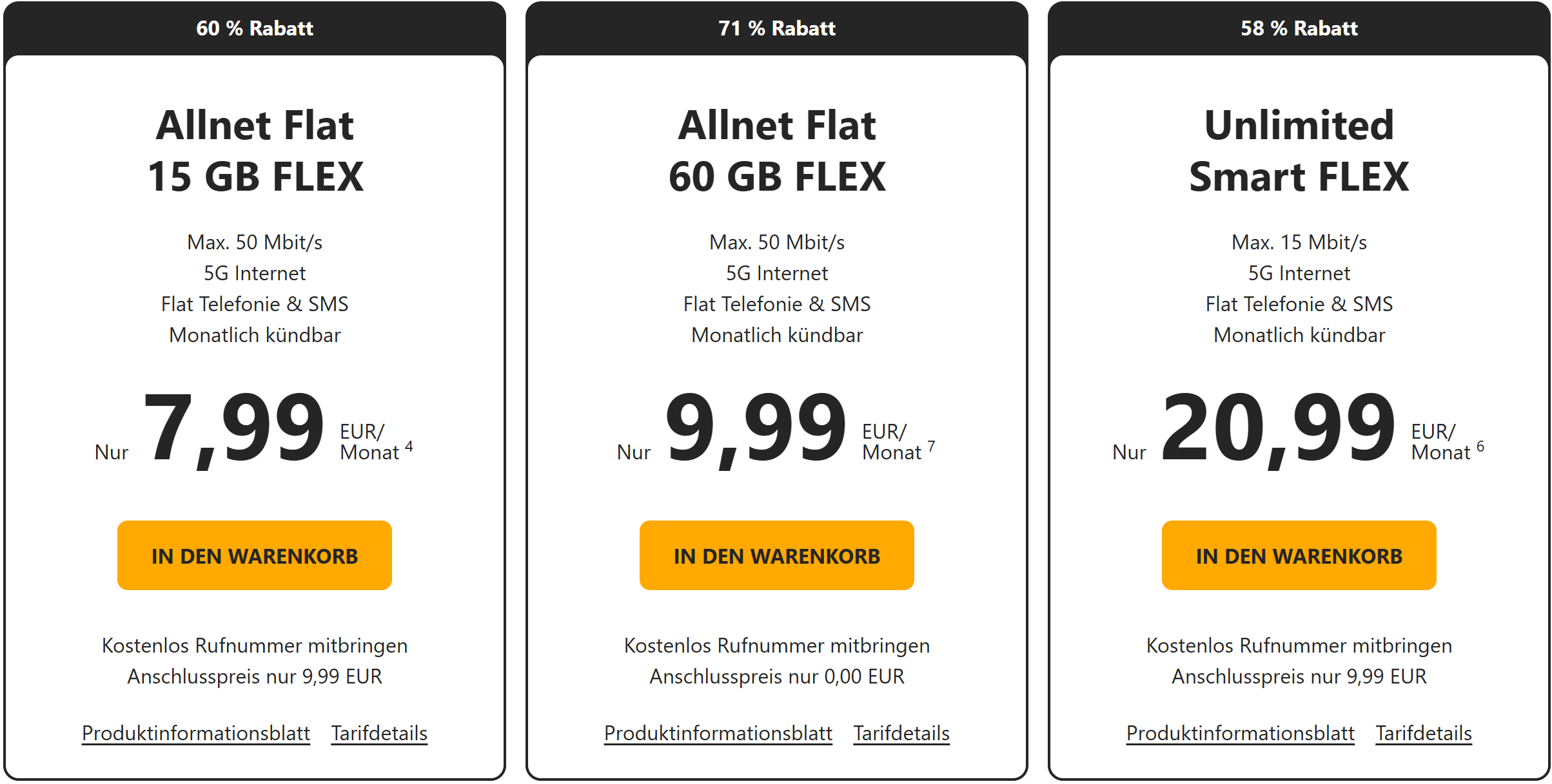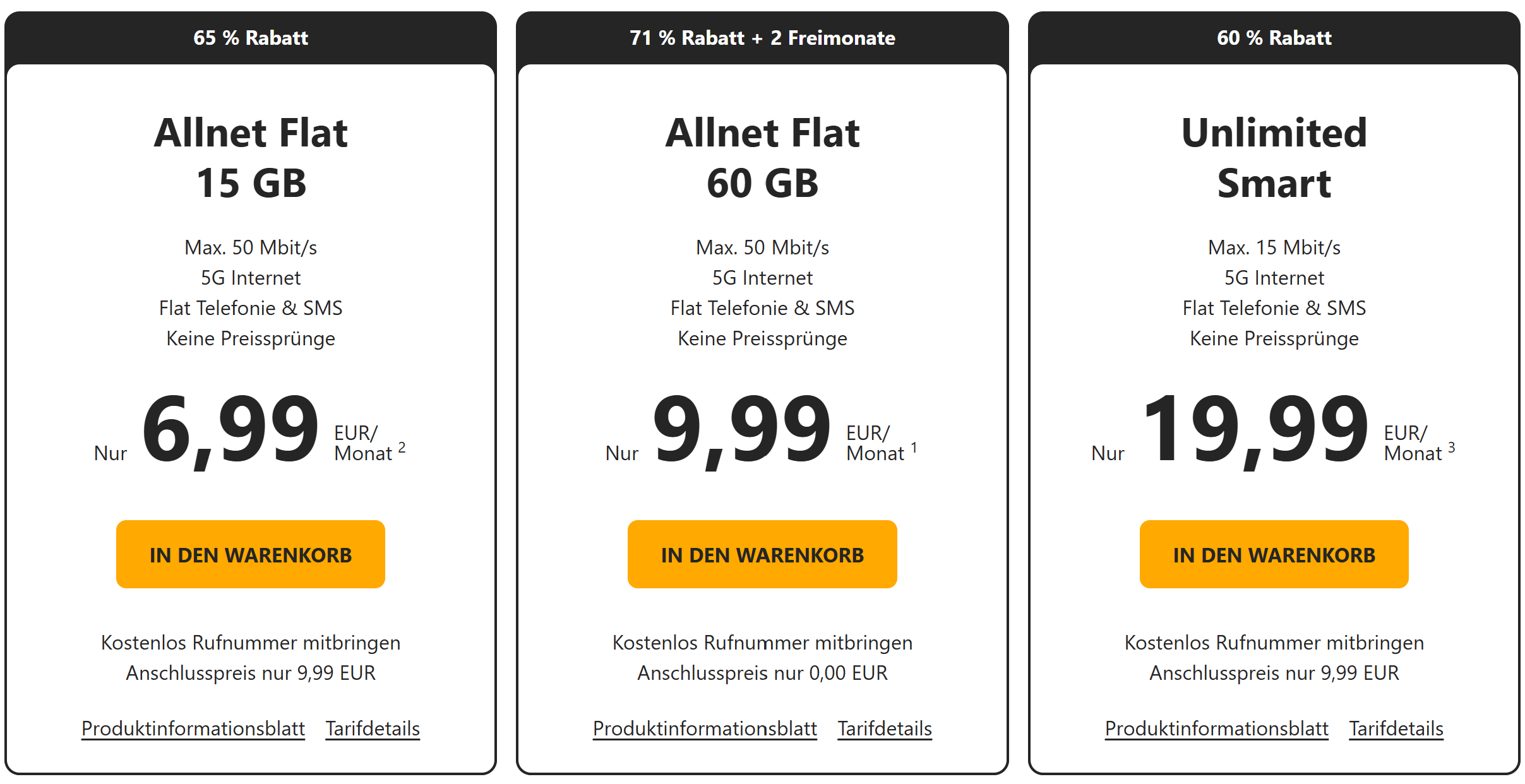 | Allnet Flat 15GB 5G | 9,99€ | 5,99€ | 50Mbit/s |
