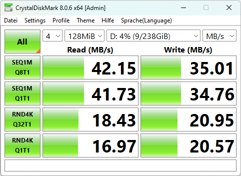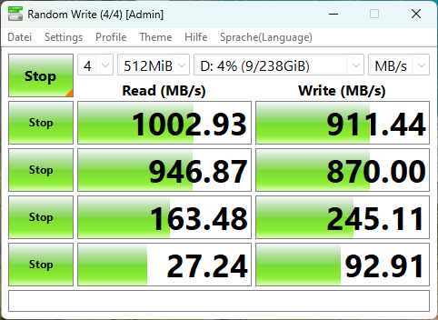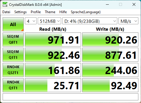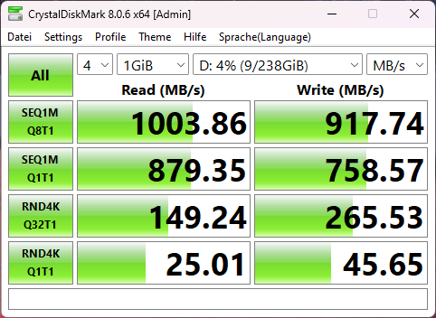 Der Ninkear M8 ist in genau einer Speicherkonfiguration erhältlich. Diese beläuft sich auf 32GB DDR5-Arbeitsspeicher und 1TB Flash-Speicher. Letzterer ist eine aktuelle PCIe 4.0 M.2-SSD. Mit 3598MB/s Lese- und 3095MB/s Schreibgeschwindigkeit bestätigen die Benchmarks diesen Standard.
