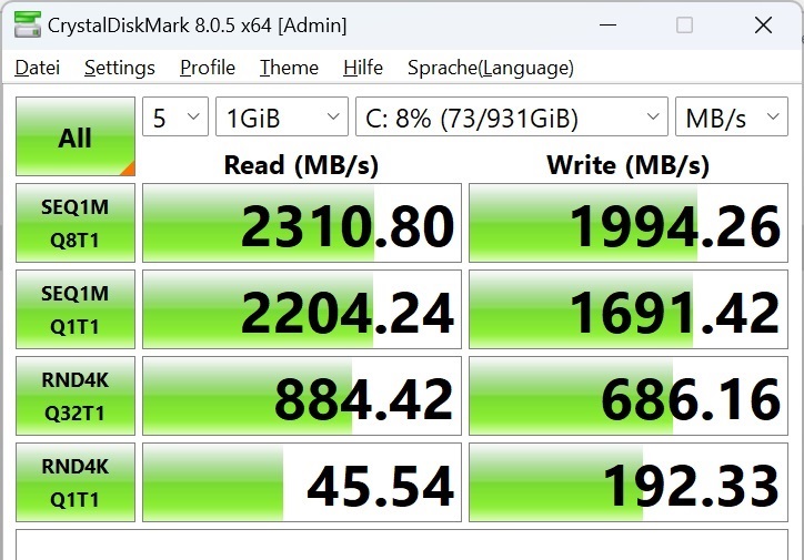 NinKear verbaut 2 DDR4-RAM Module (Dual Channel) mit einer Taktrate von 2666MHz und einer Gesamtkapazität von gewaltigen 32GB. Mit den Benchmarkergebnissen von 2310 MB/s Lese- und 1994 MB/s Schreibrate sind Daten pfeilschnell übertragen. Als ROM-Speicher kommt eine 1TB große PCIe NVMe 3.0 SSD (2280) von Derlar zum Einsatz. Wie bereits genannt, kann man den Speicher mit einer weiteren NVME SSD erweitern. Das System unterstützt NVMe SSD’s mit einer Kapazität von maximal 4 Terabyte. Im Alltag läuft Windows auf dem N16 Pro konstant flüssig und Eingaben werden blitzschnell verarbeitet. Etwaige Ruckler, auch bei vielen offenen Tabs und Programmen, sind nicht vorgekommen, was angesichts der potenten Hardware auch nicht zu erwarten war. Die Bootzeit im Kaltstart bis zum Anmeldebildschirm vom Windows beträgt ordentliche 26 Sekunden. Als GPU kommt Intels UHD Graphics mit einer maximalen dynamischen Frequenz von 1,50GHz zum Einsatz. Machen wir uns nichts vor. Zum Zocken ist das Notebook nicht wirklich geeignet, aber ältere 3D-Spiele können mit Abstrichen in der Qualität schon gespielt werden.