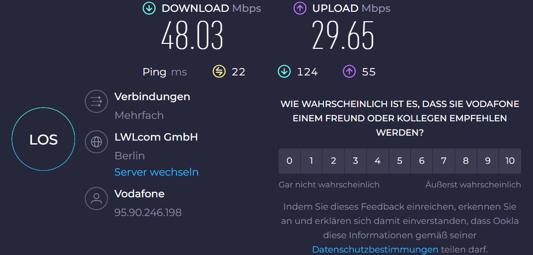In den Screenshots seht ihr die Werte an meinem Homeoffice-Arbeitsplatz, der zwar durch eine Wand, aber nur gut 3 Meter vom Router entfernt ist. Der zweite Screenshot ist von der Küche, die einen ungefähren Abstand von 10 Meter und durch 2 Wände vom Router getrennt ist. An diesem Ort ist mobiles Arbeiten ohne zusätzlichen WLAN-Repeater mit anderen Geräten teilweise nicht möglich. Selbst hier schlägt sich das N16 Pro solide.