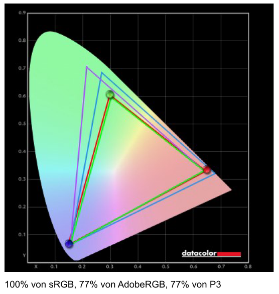 NinKear gibt eine 100-prozentige Abdeckung für den sRGB Farbraum an, was unser Test bestätigt. Im Bereich des P3- und des AdobeRGB-Farbraums ergibt unser Test eine Abdeckung von jeweils 77%. Somit ist sicheres Arbeiten zumindest im sRGB-Bereich sichergestellt.