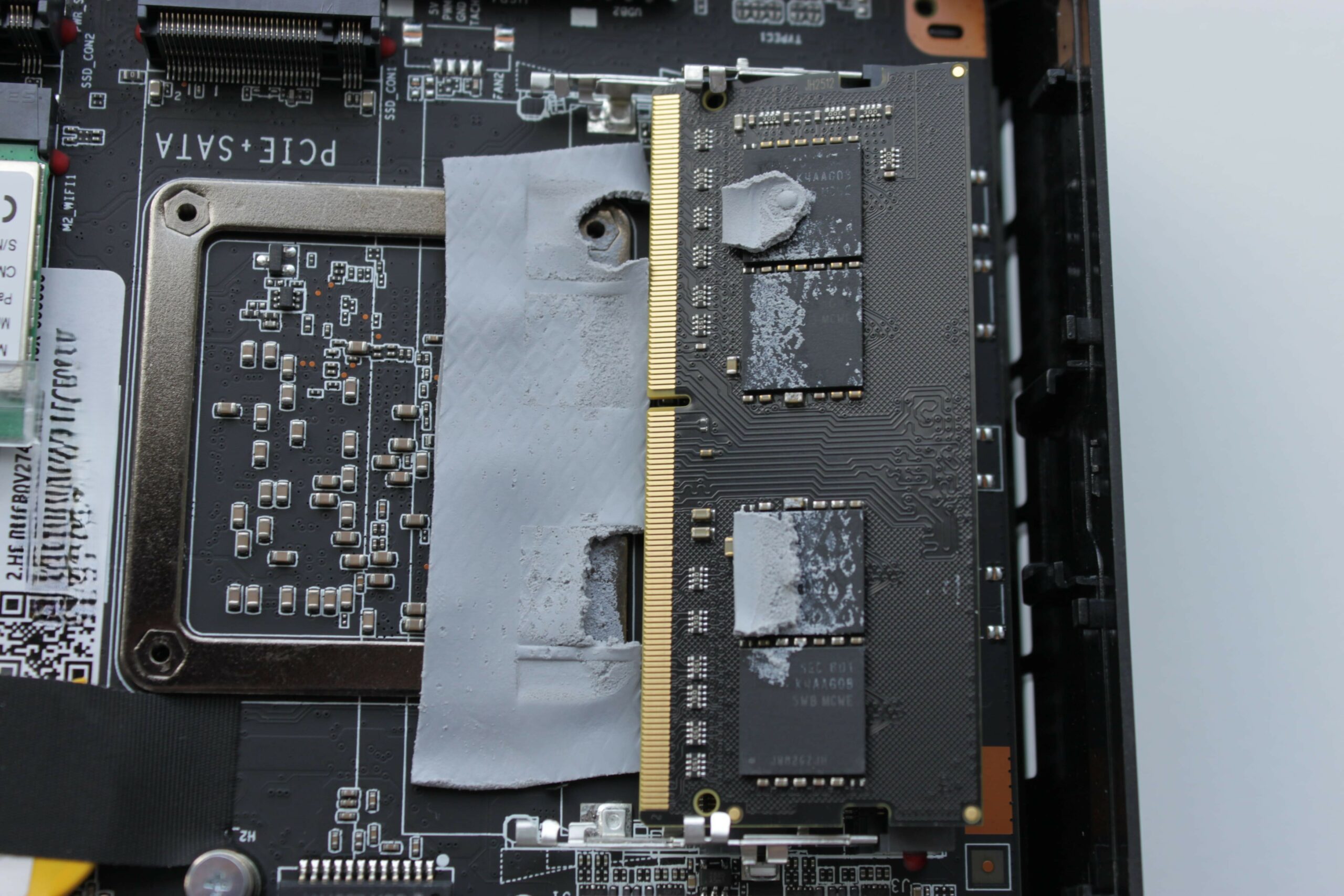 Werft ihr einen Blick in das Innere, erkennt ihr unschöne Details. Die Wärmeleitpaste fällt mangelhaft aus. Sie ist so trocken, dass sie selbst bei einem brandneuen Gerät klumpig und fest wirkt. Die aufgetragene Menge ist ebenfalls nicht optimal. Dadurch ist eine schlechte Wärmeleitung nach kurzer Nutzung vorprogrammiert. Das Wärmeleitpad unter dem RAM zerfällt bereits und bietet an dieser Stelle kaum Mehrwert.