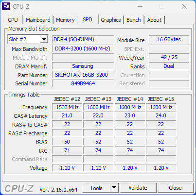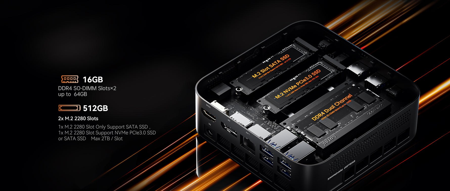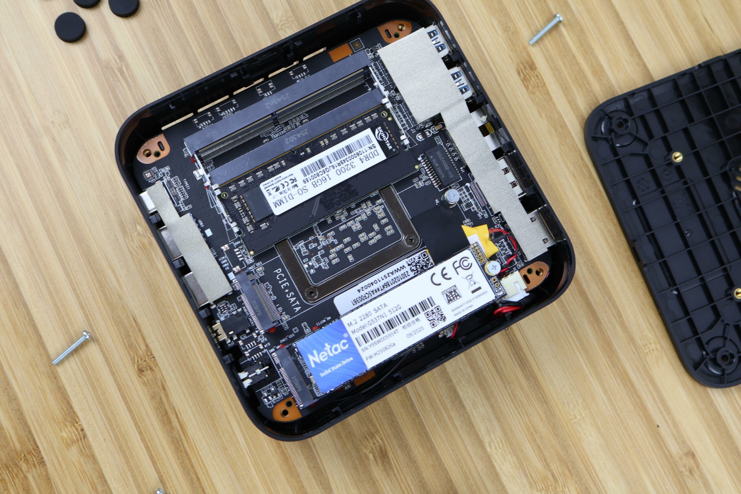 Der NiPoGi E3B ist mit großzügigen 16GB DDR4 RAM mit schnellen 3200MT/s ausgestattet. NiPoGi verbaut hier nur einen einzigen No-Name-Riegel, wodurch die Leistungsfähigkeit des schnellen Ryzen V2748 eingeschränkt wird. Cleverer wären zwei 8GB-Riegel, da AMD-Prozessoren im Dual-Channel-Modus stark davon profitieren. Dank des zweiten freien Slots ist ein Upgrade problemlos möglich. Ihr könnt jedoch auch ohne Upgrade erst einmal arbeiten. Das Aufrüsten ist zu empfehlen, auch wenn die RAM-Preise aktuell hoch sind. Gebraucht bekommt ihr 2x 8GB-Riegel für unter 50€. Maximal sind 64GB (2x32GB) möglich.