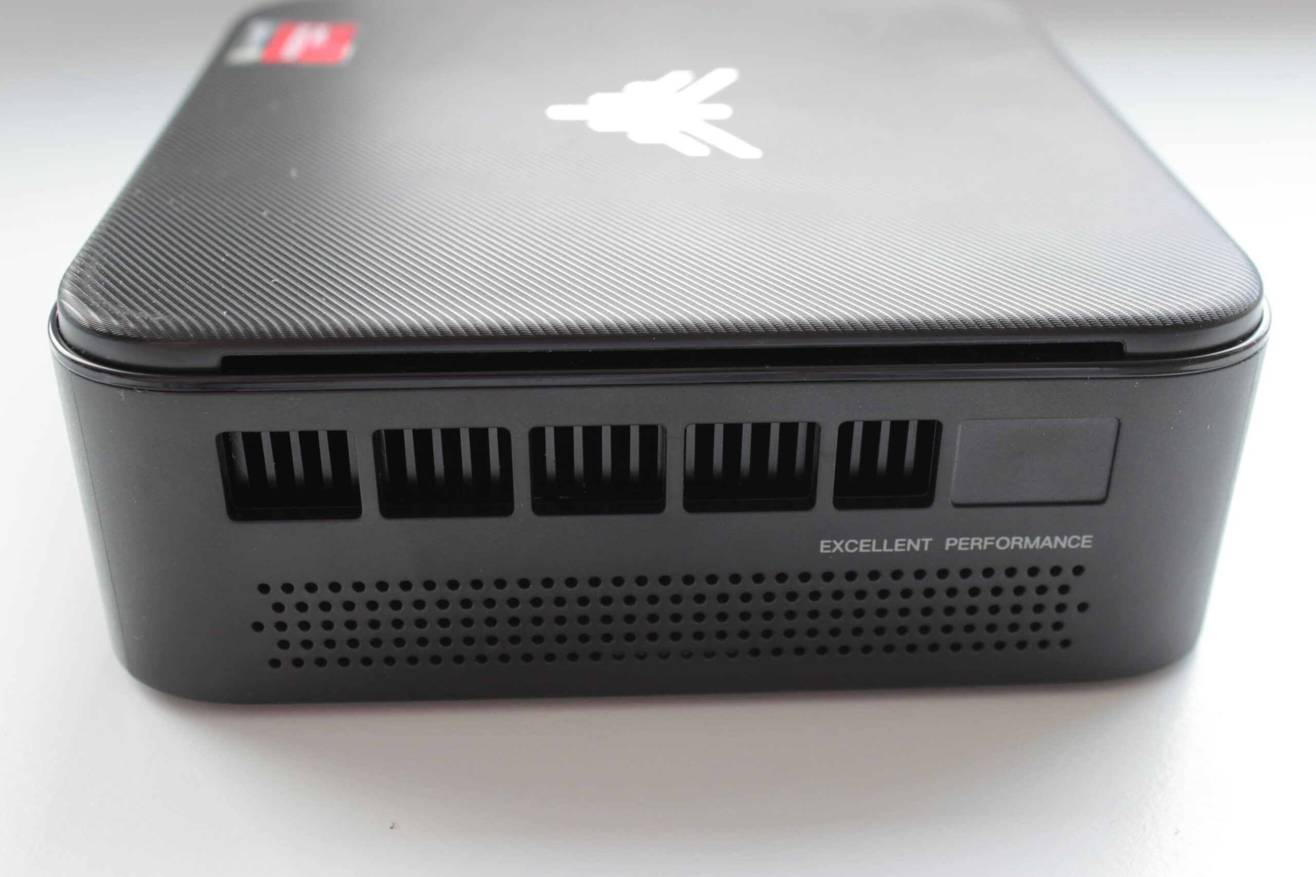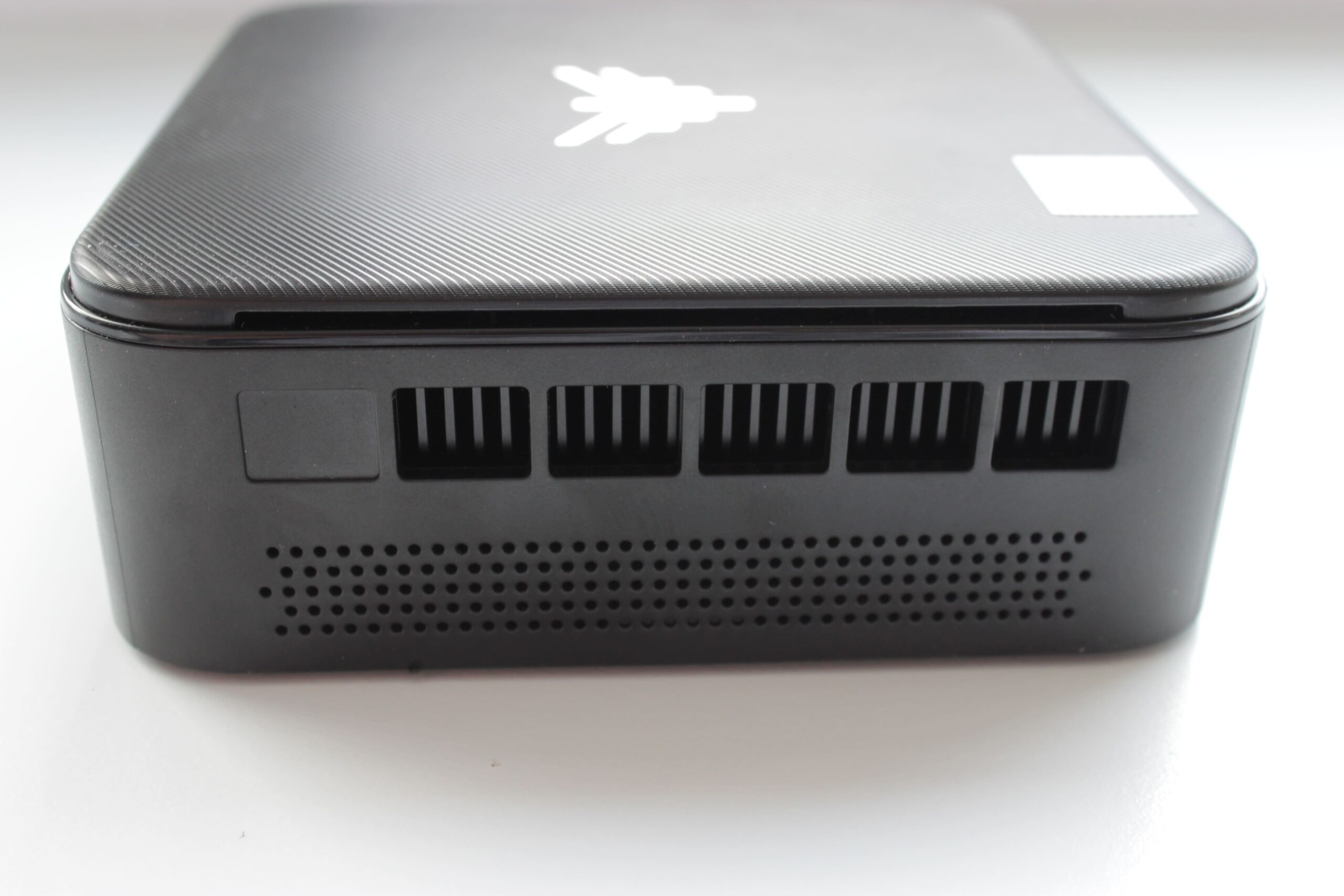Auch wenn das Material Kunststoff viele abschreckt, bietet es positive Aspekte, die bei einem Mini-PC zum Tragen kommen. Kunststoff besitzt, vom Preis abgesehen, antistatische Eigenschaften und ist sehr leicht. Einzig die Wärmeleitfähigkeit fällt gering aus. NiPoGi sorgt hier jedoch für ausreichend Kühlung, indem rund um das Gehäuse zahlreiche Lüftungslöcher in verschiedenen Größen integriert wurden. Die Vorderseite bleibt glatt und geschlossen.