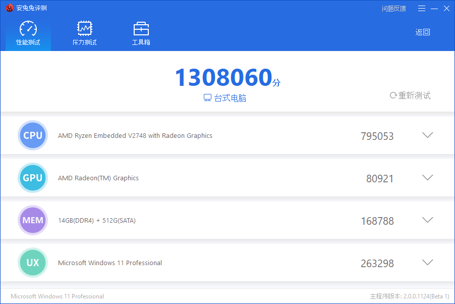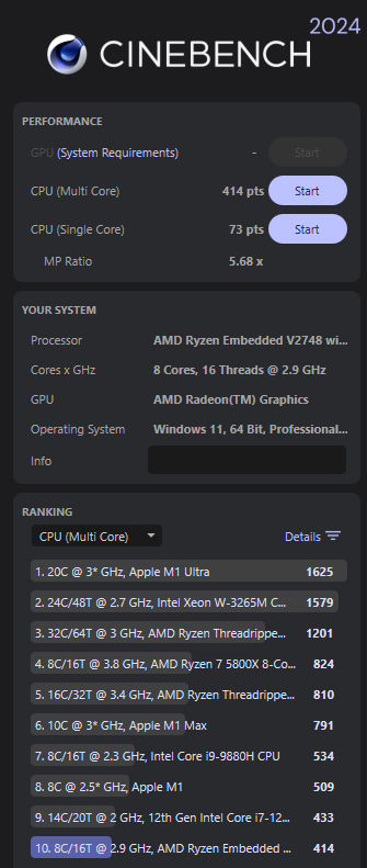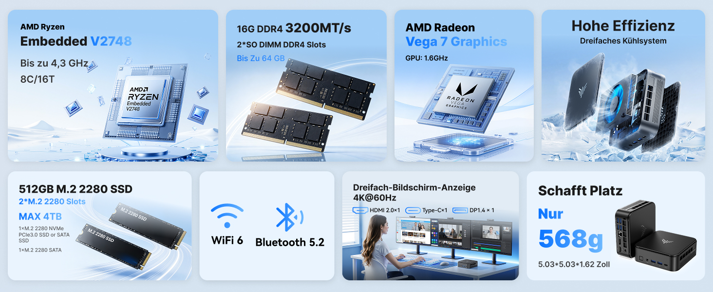 Der Ryzen Embedded V2748 ist ein industrieller Prozessor, der durch langen Support und einen sehr stabilen Lastbetrieb glänzt. Die 16GB DDR4 RAM und die 512GB SSD-Festplatte reichen für den Arbeitsbetrieb völlig aus, bieten aber Luft für Upgrades.