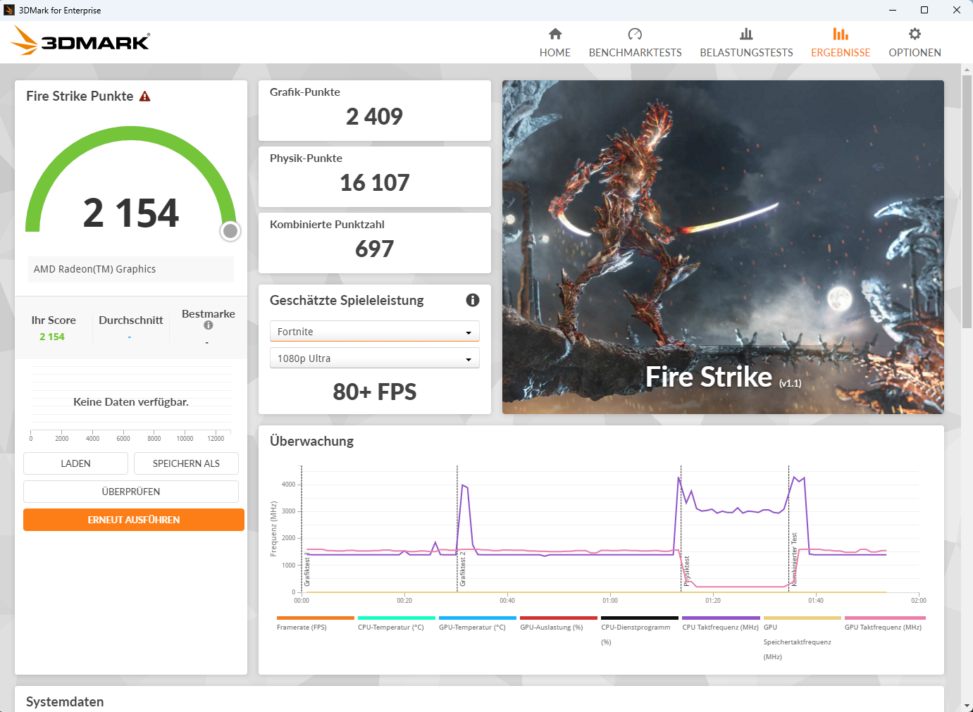 Die integrierte Radeon Vega 7 Grafik liefert solide Ergebnisse, kann bei modernen Spielen jedoch kaum punkten. Der klare Fokus liegt auf Workflows mit multiplen Displays anstatt auf hohen FPS-Werten. Die Leistung wird hierbei durch den einzelnen RAM-Riegel zusätzlich eingeschränkt.