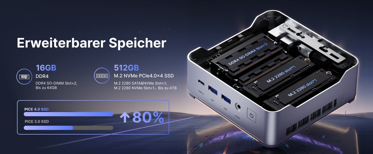 NiPoGi verbaut hier noch DDR4-Speicher. Das drückt die Performance der ohnehin schon schwachen integrierten Intel UHD Grafik weiter nach unten. Für den Office-Alltag reicht das völlig aus, aber für Gaming ist dieser Mini-PC nicht geeignet.