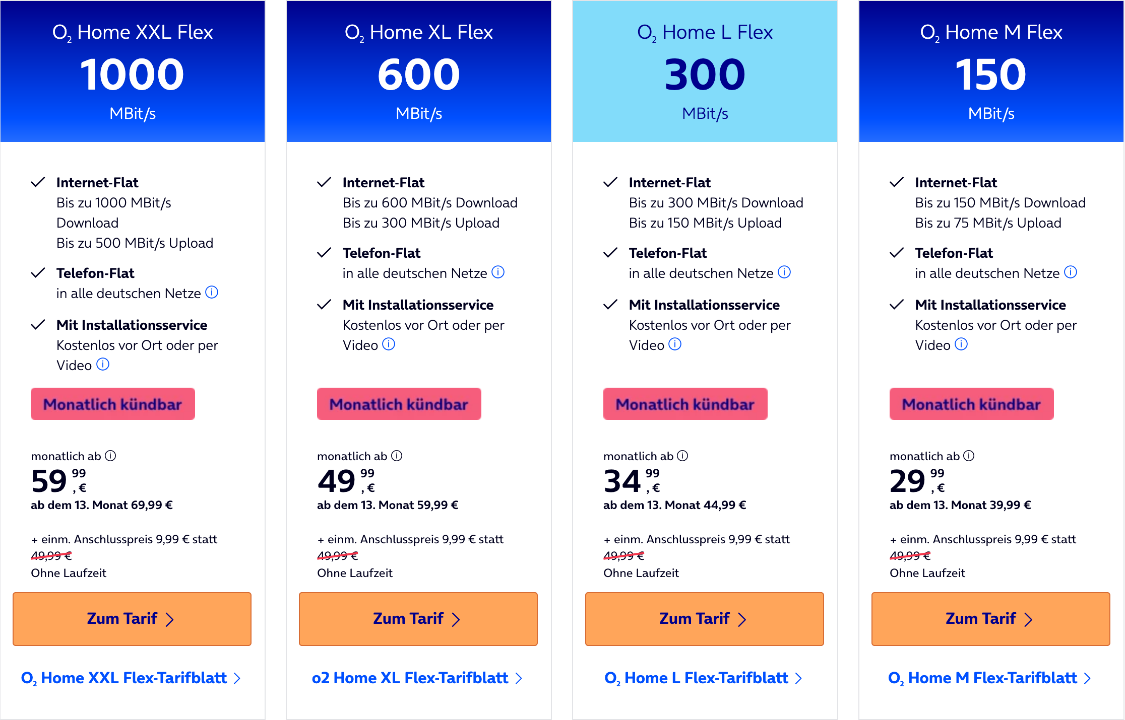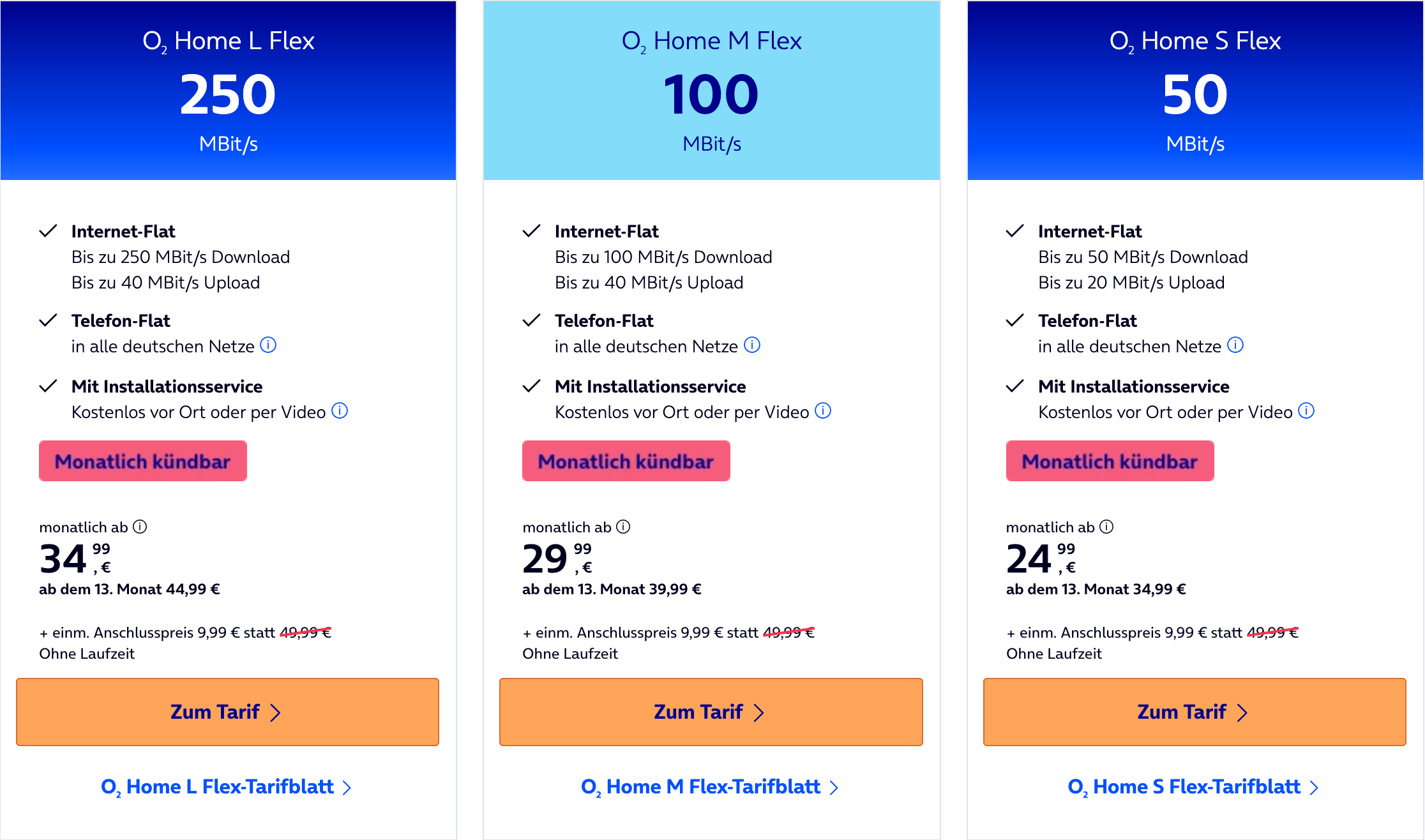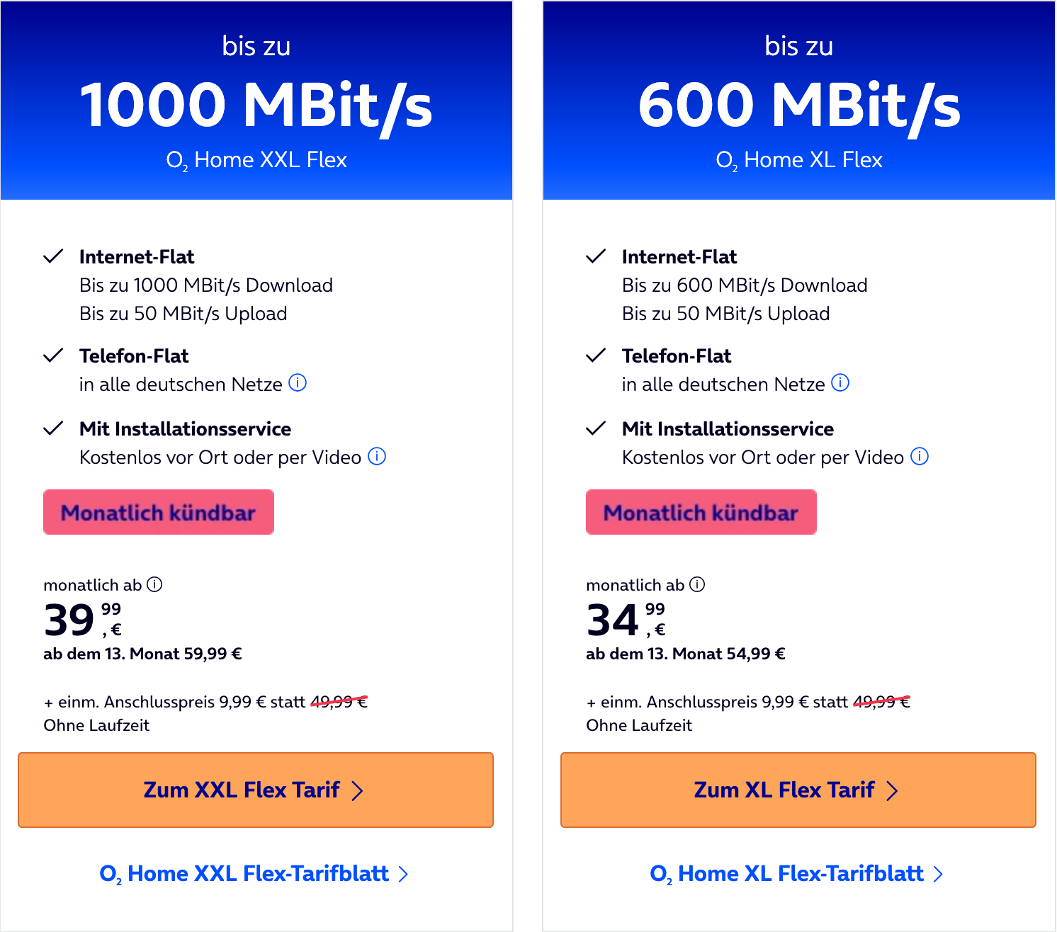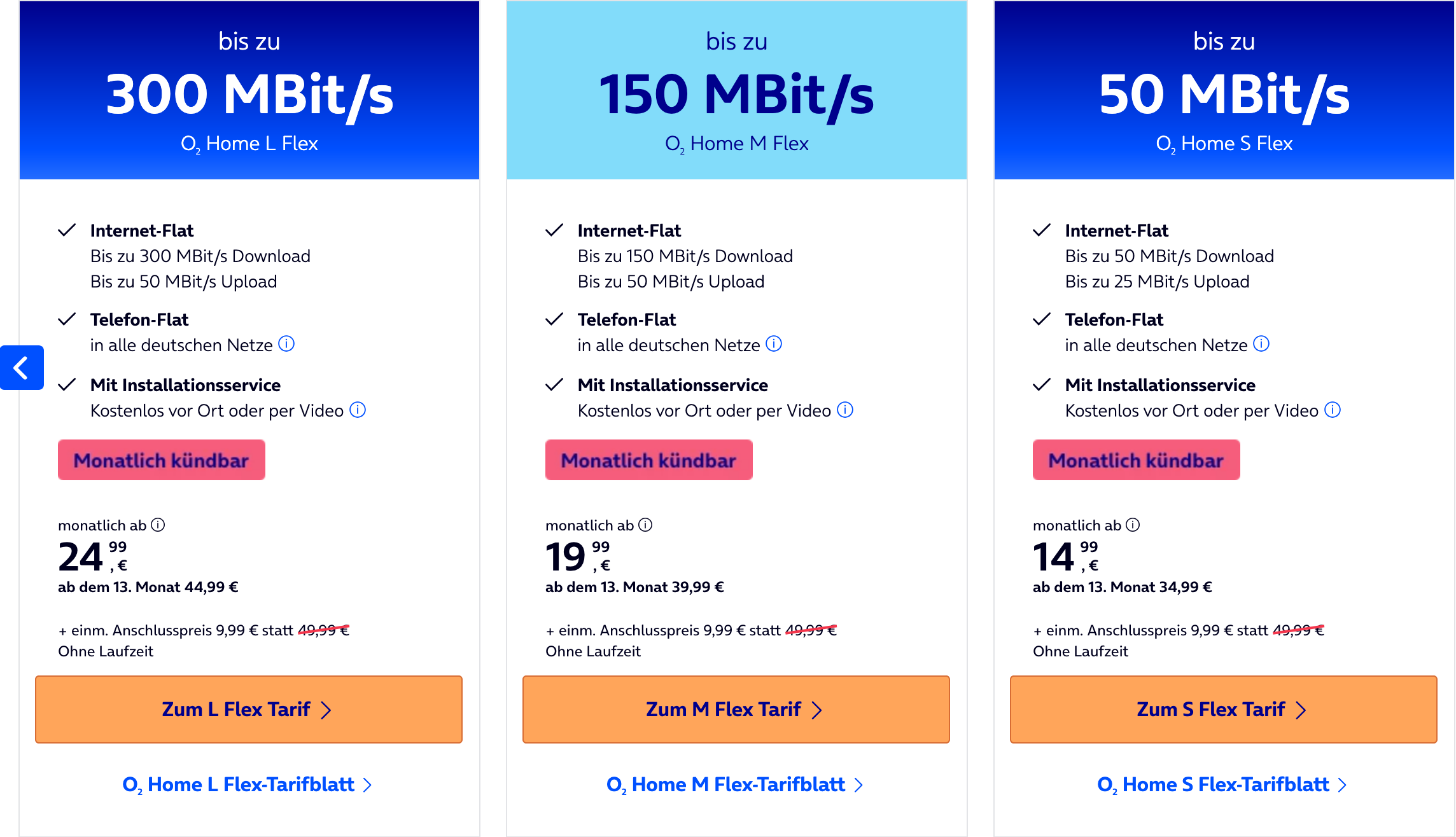 O2 bietet aktuell eine günstige Möglichkeit für monatlich kündbare Flex-Tarife. Das ist an sich nichts Besonderes, allerdings hat O2 die Anschlussgebühr von 39,99€ (49,99€ bei Internettarifen) auf nur 9,99€ gesenkt. Besonders attraktiv sind die Angebote, da die Kabel- & Internettarife in den ersten 12 Monaten stark vergünstigt sind. Damit ergibt sich in Summe ein sehr gutes Angebot, vor allem bei Kündigung innerhalb der ersten 12 Monate.