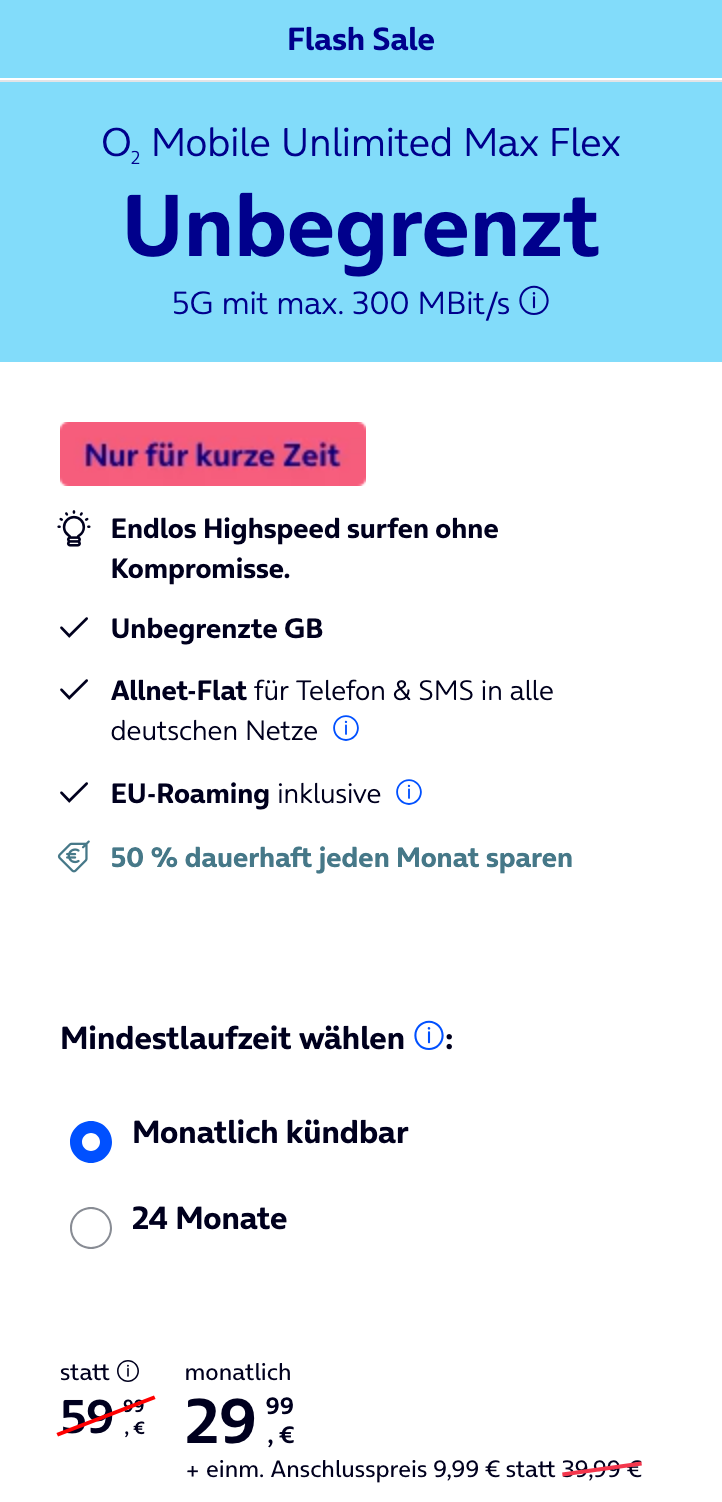 O2 Unlimited Max Flex für 29,99€/Monat