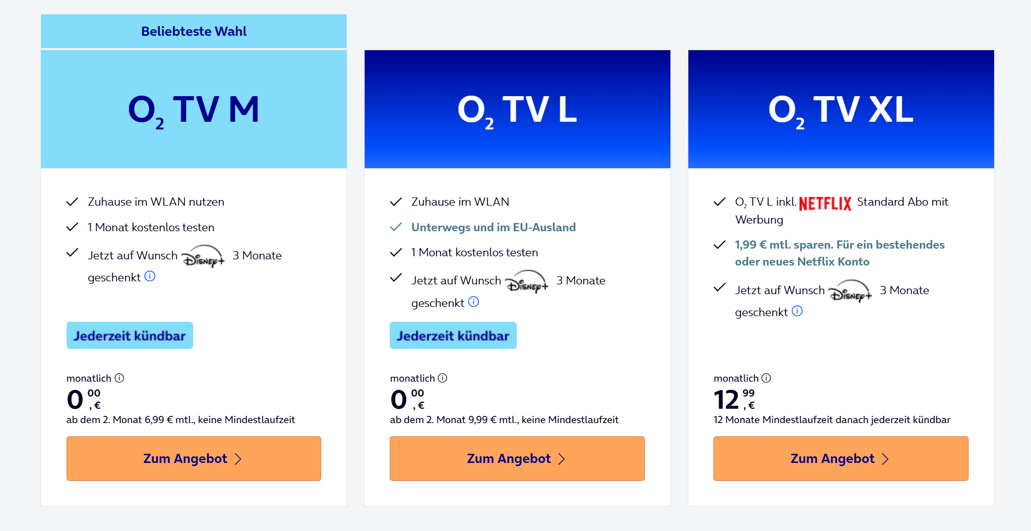 Die Anbieter erhöhen die Preise, und da ist es erfreulich, wenn ein neuer Big-Player um Kunden wirbt, wenn auch nur um die eigenen 😅. Als O2-Kunde könnt ihr den Internet-TV-Anbieter derzeit problemlos und vor allem kostenlos testen. Bei der aktuellen Aktion zahlt ihr zusammen mit Disney+ für 3 Monate nur 14€. Beachtet nur, dass ihr rechtzeitig kündigt, da sonst nach 3 Monaten die regulären Kosten anfallen. Wobei 6,99€ im Vergleich zur Konkurrenz bei O2 TV durchaus günstig sind.