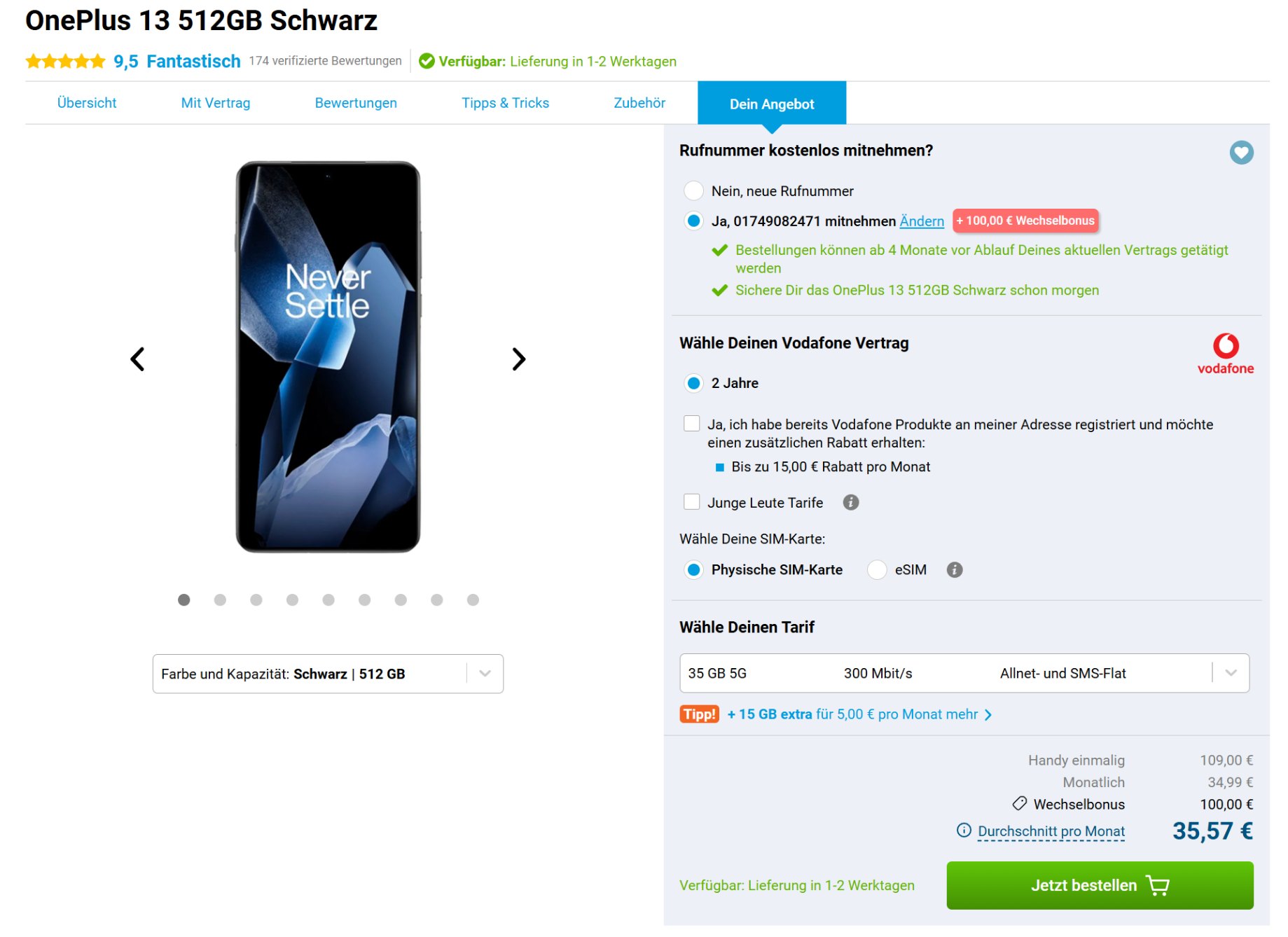 Bei Gomibo bekommt ihr das OnePlus 13 zum Top-Preis zusammen mit einem Vodafone-Tarif. Der Deal ist nur bis zum 30. September bis Mitternacht gültig. Das OnePlus 13 bekommt ihr hier zum Straßenpreis und habt dazu noch einen ordentlichen Vodafone-Mobilfunktarif. Zusammen mit dem Flagship gibt es einen Vodafone-Tarif, der 35GB Datenvolumen im 5G-Netz bei voller Geschwindigkeit bietet und eine Allnet-Flatrate. Die monatliche Grundgebühr liegt bei 35€. Der Vertragsdeal wird durch einen 100€-Rufnummermitnahmebonus versüßt.