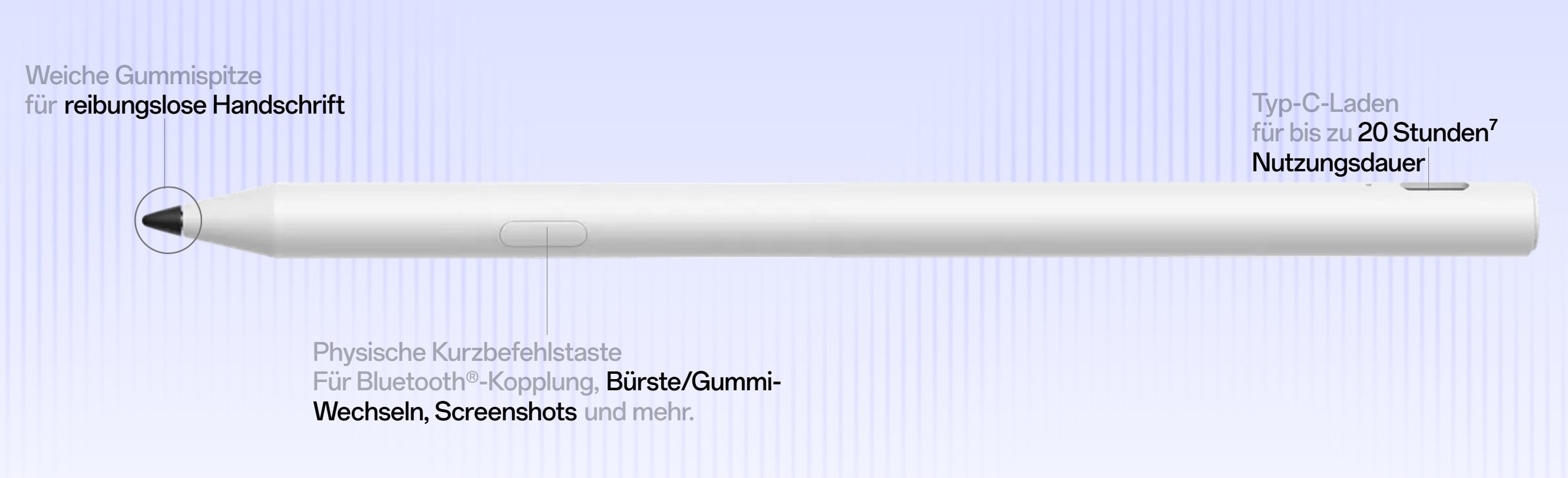 Für produktive Aufgaben bietet OnePlus den optionalen Stylo an. Es handelt sich hierbei um ein anderes Modell als beim OnePlus Pad 3. Dieser Eingabestift ermöglicht präzises Zeichnen mit geringer Latenz auf dem Bildschirm. Die USB-C-Schnellladefunktion stellt nach 10 Minuten Ladezeit Energie für einen halben Tag bereit. Ergänzend dazu gibt es ein passendes Schutz-Case, das auch als Aufsteller dient. Der Stylo kostet circa 80€, während das Case für etwa 40€ erhältlich ist.