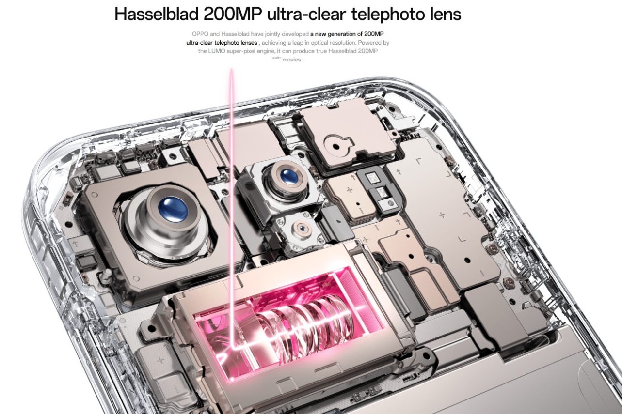 Die eigentliche Innovation stellt jedoch die Periskop-Tele-Kamera dar. Damit verzichtet Oppo auf zwei Zoomkameras. Die neue Zoomkamera nutzt einen 1/1,56 Zoll großen Sensor mit einer Auflösung von 200 Megapixeln und einer Blende von f/2.1. Die Kamera wird ebenfalls durch OIS stabilisiert und kann zusätzlich für Makro-Aufnahmen genutzt werden. Der Zoomfaktor liegt nur bei 3-fach optischer Vergrößerung (~70mm Brennweite): Damit hat man für Porträts die passende Brennweite parat, aber mit der hohen Auflösung soll auch die zusätzliche digitale Vergrößerung überzeugen.