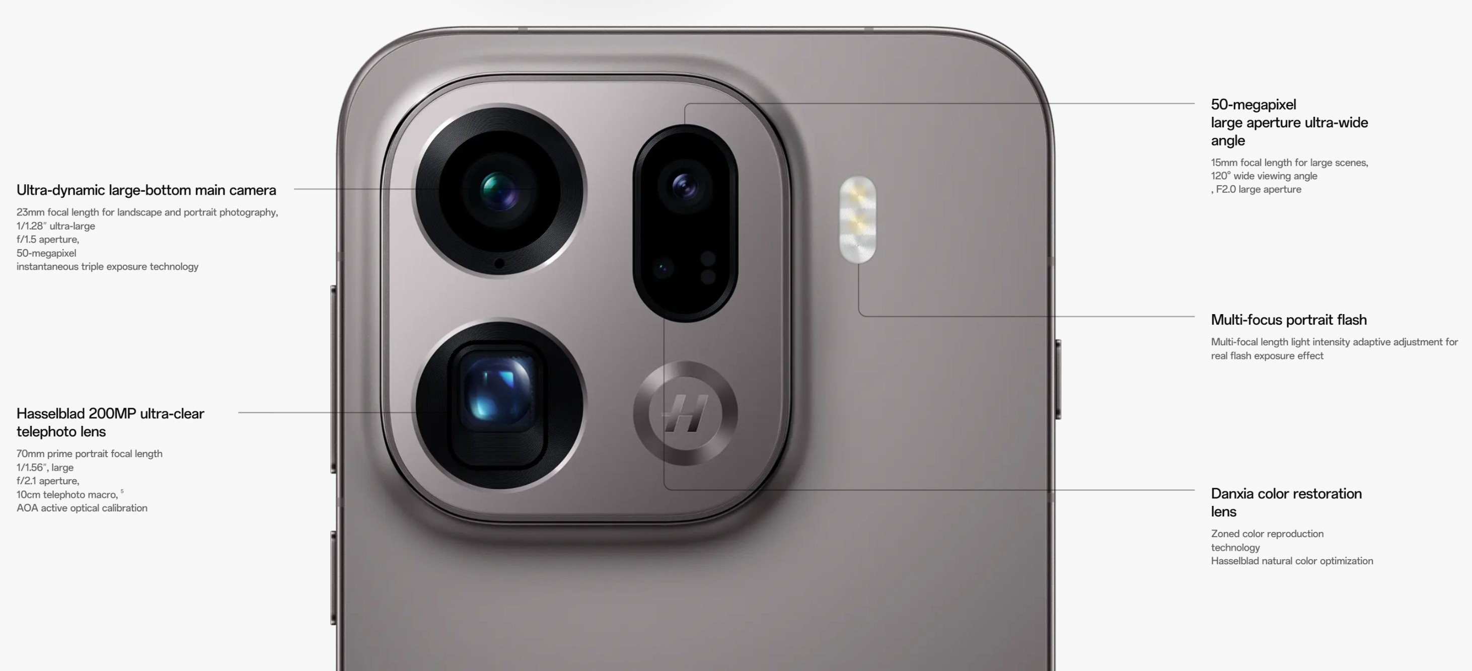 Die Software-Seite profitiert von der Hasselblad-Kooperation. Der bekannte XPan-Modus für ultrabreite Fotos im 6:2-Format ist ebenso an Bord wie der „Hasselblad Master“-Modus mit speziellen Farbfiltern. Professionelle Anwender können Fotos im 16-bit-RAW-Format speichern. Im Videobereich sind Aufnahmen in 4K mit bis zu 120 Bildern pro Sekunde sowie in 10-bit Log und Dolby Vision möglich. Als besonderes Zubehör bietet Oppo ein optionales „Hasselblad Kamera-Kit“ an, das die Zoomkamera auf 10-fache Vergrößerung erweitert.