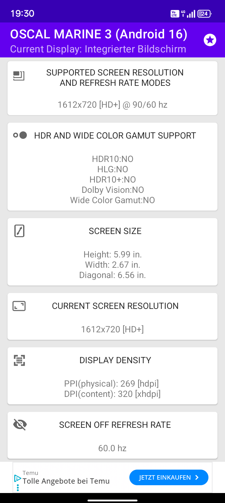 Das Oscal verfügt über ein 6,56 Zoll großes IPS-Display, das in HD, sprich mit 1612 x 720 Pixel, auflöst. Dadurch ergibt sich eine Pixeldichte von 269 Pixel pro Zoll. Der Touchscreen verarbeitet bis zu 10 Berührungen gleichzeitig. Bei der Bildwiederholungsfrequenz unterstützt das Marine 3 bis zu 90Hz.