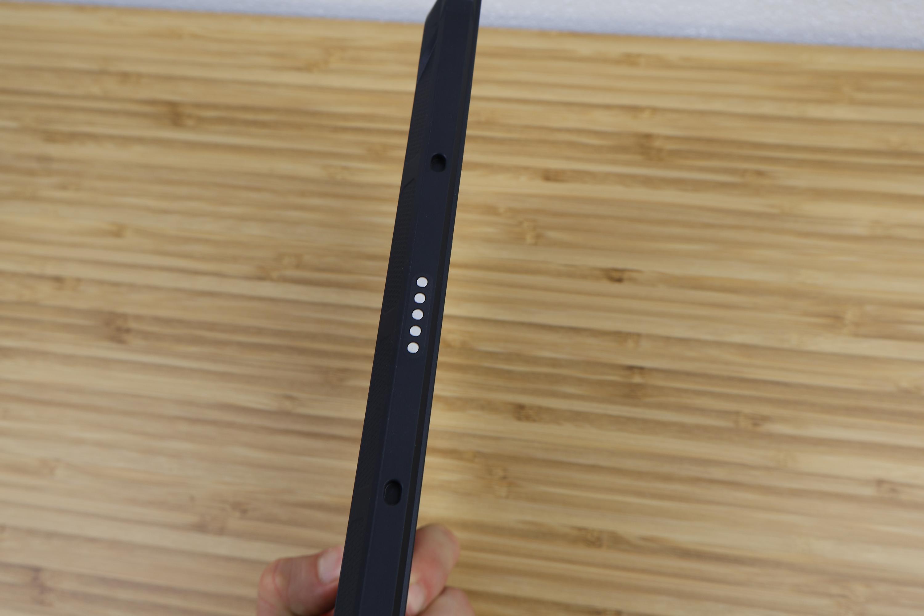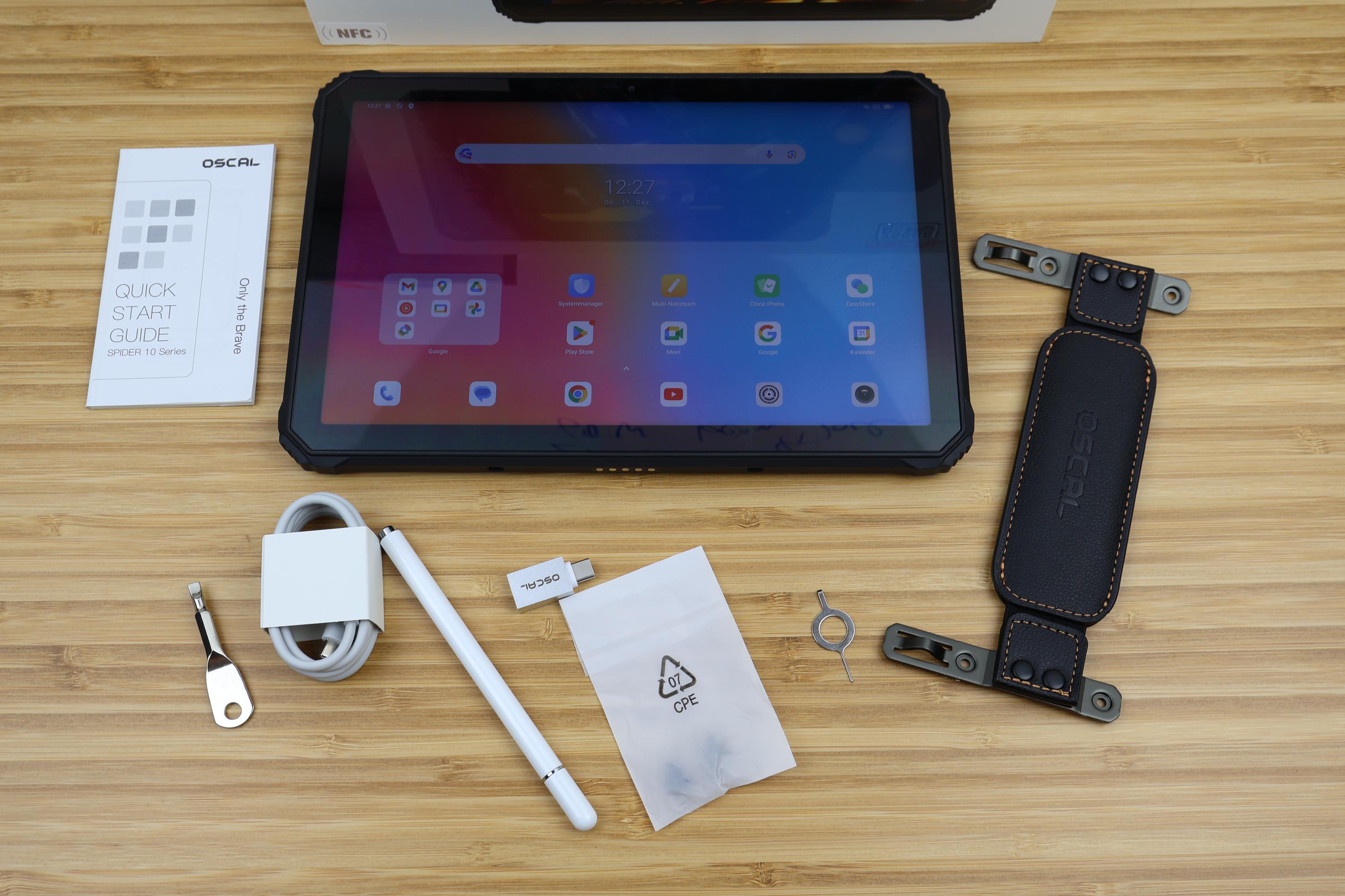 Zum Lieferumfang gehören das Tablet selbst, ein USB-C-Ladekabel, eine Handschlaufe mit Montagewerkzeug (Schlitzschraubendreher), eine SIM-Nadel, ein USB-A-zu-USB-C-Wechselstecker und ein Touch-Stift, der die Bedienung mit Handschuhen erleichtern soll. Der Stift ist nicht druckempfindlich und somit nicht als Stylus zu bezeichnen. Optionales Zubehör wie eine Tastatur ist separat erhältlich, auf der Unterseite des Oscal Spider 10 sind fünf Pins zur Konnektivität sichtbar.