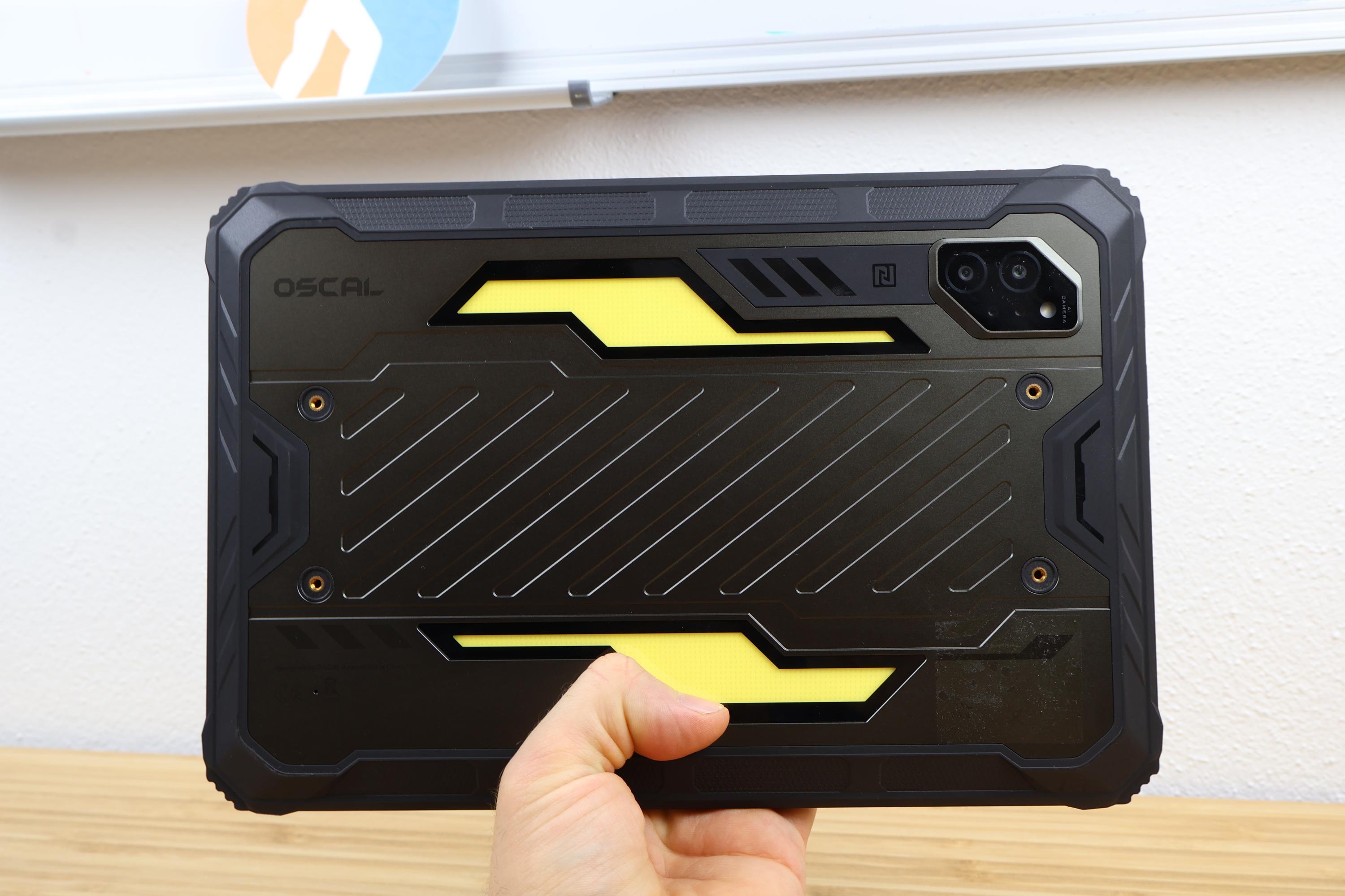 Das Oscal Spider 10 präsentiert sich mit einem massiven, sehr robust wirkenden Gehäuse. Das Design ist funktional und klar auf Widerstandsfähigkeit ausgelegt. Wir messen das Tablet mit 271 x 184 x 18,5 Millimeter, wobei die Dicke erheblich auffällt. Im direkten Vergleich zu herkömmlichen 11 Zoll Tablets seht ihr sofort, wie klobig, groß und schwer das Gerät ist. Für längeres Halten in einer Hand eignet sich das 1133 Gramm schwere Gerät kaum, dafür vermittelt es ein hohes Maß an Stabilität und Langlebigkeit. Dank der dreifachen Zertifizierung nach IP68, IP69K und MIL-STD-810H trotzt es Wasser, Staub und kleineren Stürzen, ohne dabei Schaden zu erleiden.