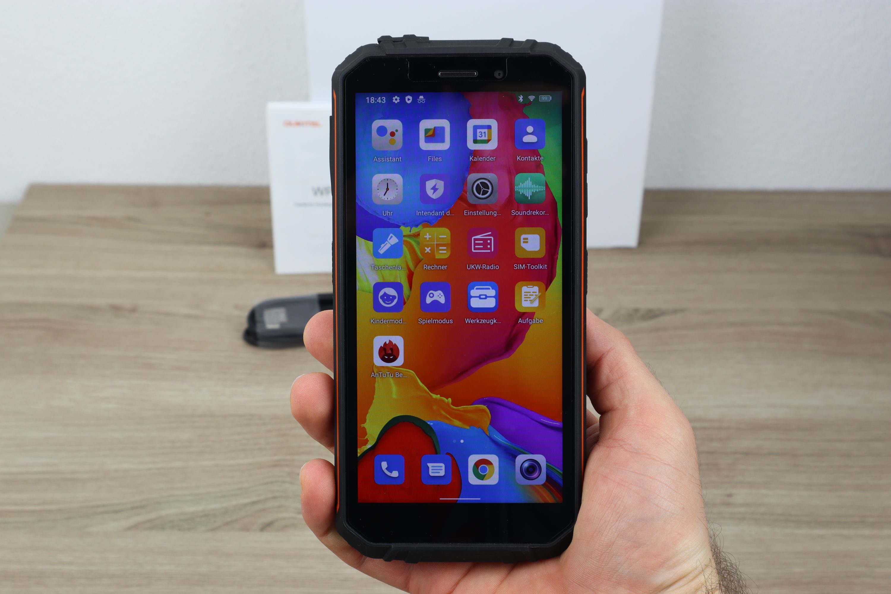 Auf dem Oukitel WP18 kommt Android 11 zum Einsatz. Das System kommt ohne App-Drawer, weswegen die Apps direkt auf dem Bildschirm abgelegt werden. Sonderfunktionen, Multitouch-Gesten und Gesichtserkennung sind mit an Bord. Die Gesichtserkennung wird natürlich über die Frontkamera realisiert und funktioniert souverän. Ein automatisches Aufwecken des Bildschirms beim Anheben ist allerdings nicht möglich.