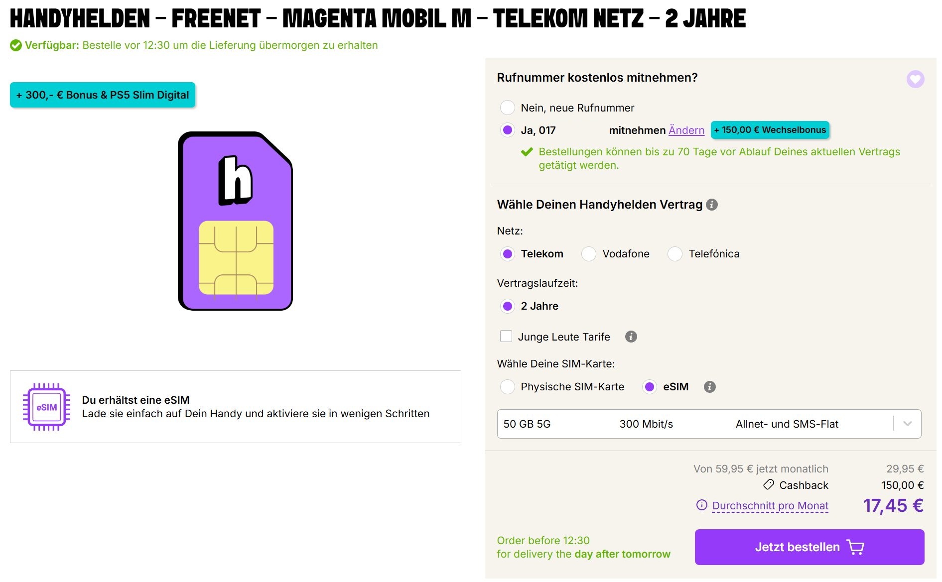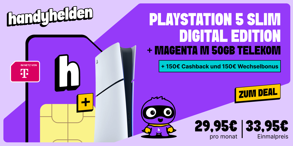 Ostern ist zwar vorbei, aber bei Handyhelden geht die Action jetzt erst richtig los. Wenn ihr auf der Suche nach einer PlayStation 5 Slim seid und gleichzeitig einen starken Tarif im besten Netz sucht, dann ist dieser Deal ein echter Volltreffer. Ihr bekommt die PlayStation 5 Slim (Digital Edition) zusammen mit dem Telekom Magenta M Tarif mit 50GB 5G-Datenvolumen zu einem rechnerisch negativen Preis. Im Folgenden rechnen wir euch diesen Deal im Detail vor.