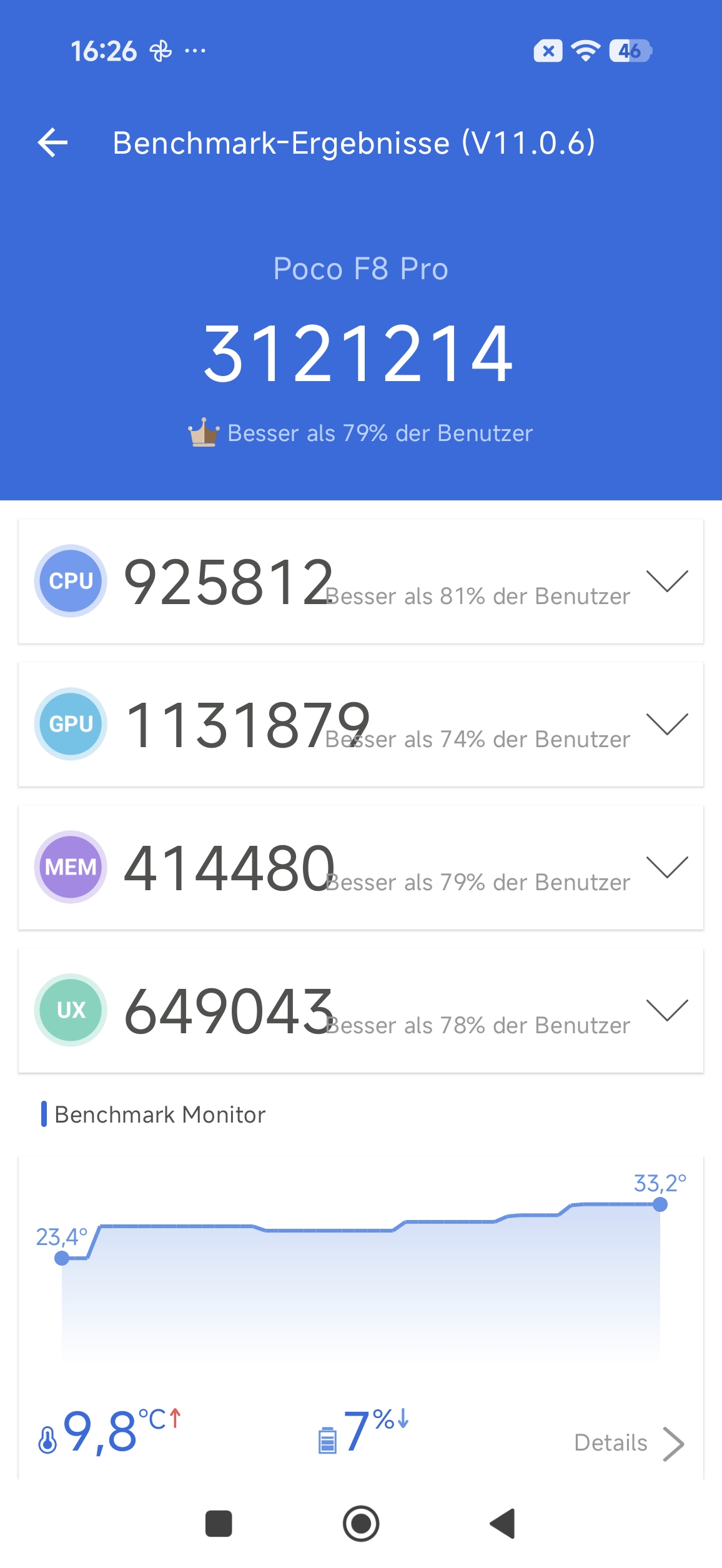 Selbst den Vergleich mit dem großen Bruder, dem Poco F8 Ultra, muss das Pro-Modell nicht scheuen. Zwar mag das Ultra in Nuancen oder bei der Kühlung durch das größere Gehäuse noch das letzte Quäntchen Performance herauskitzeln, im Alltag ist dieser Unterschied jedoch nicht spürbar. Ihr bekommt im Grunde die gleiche „Ultra-Leistung“ in einem handlicheren Format.