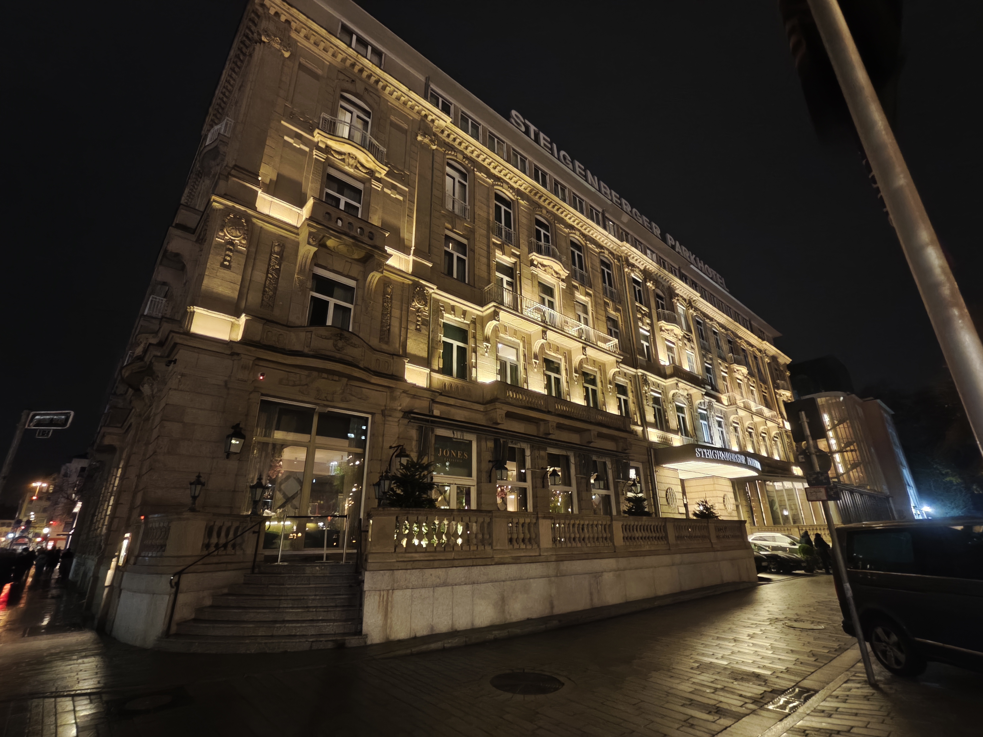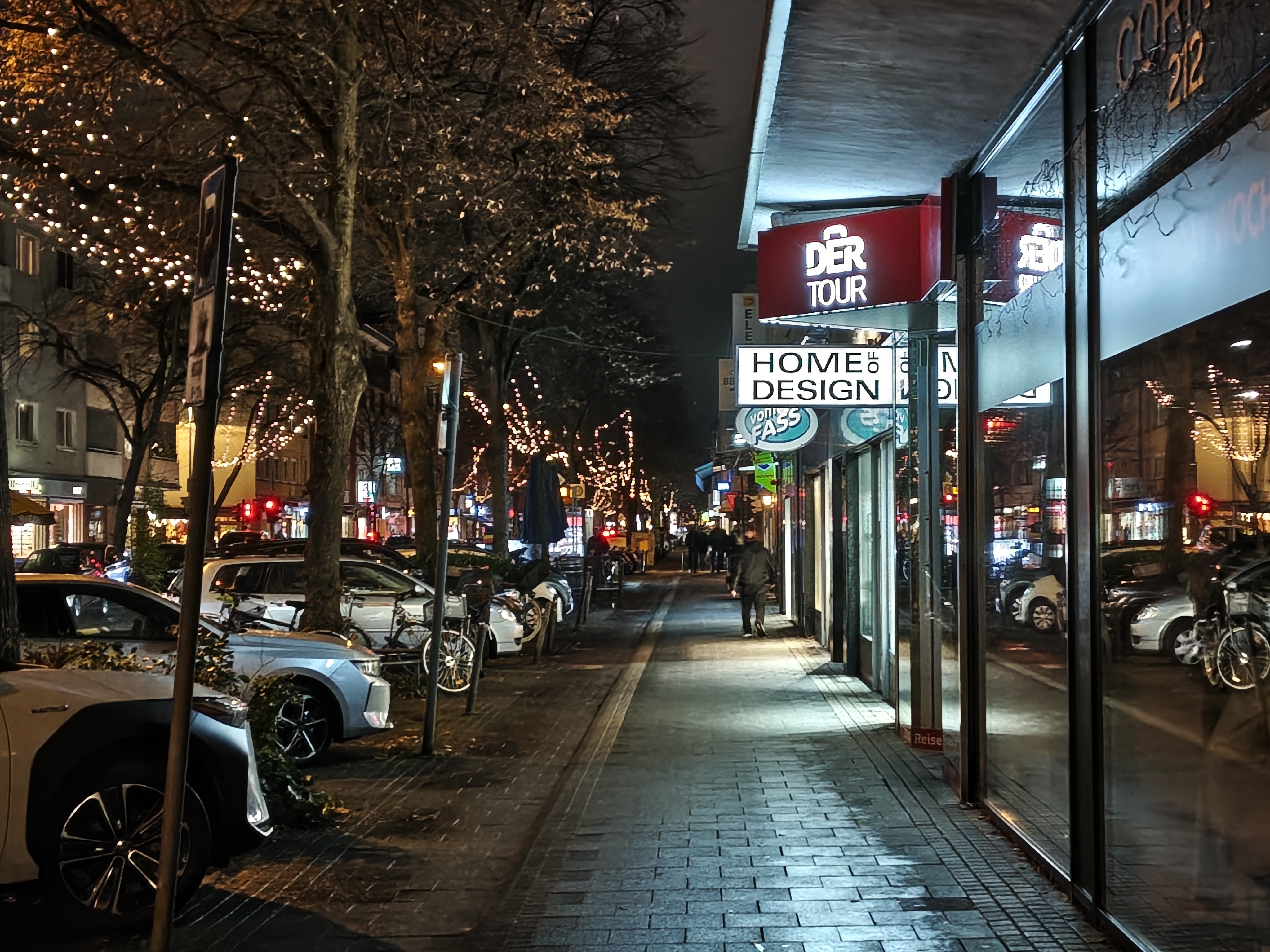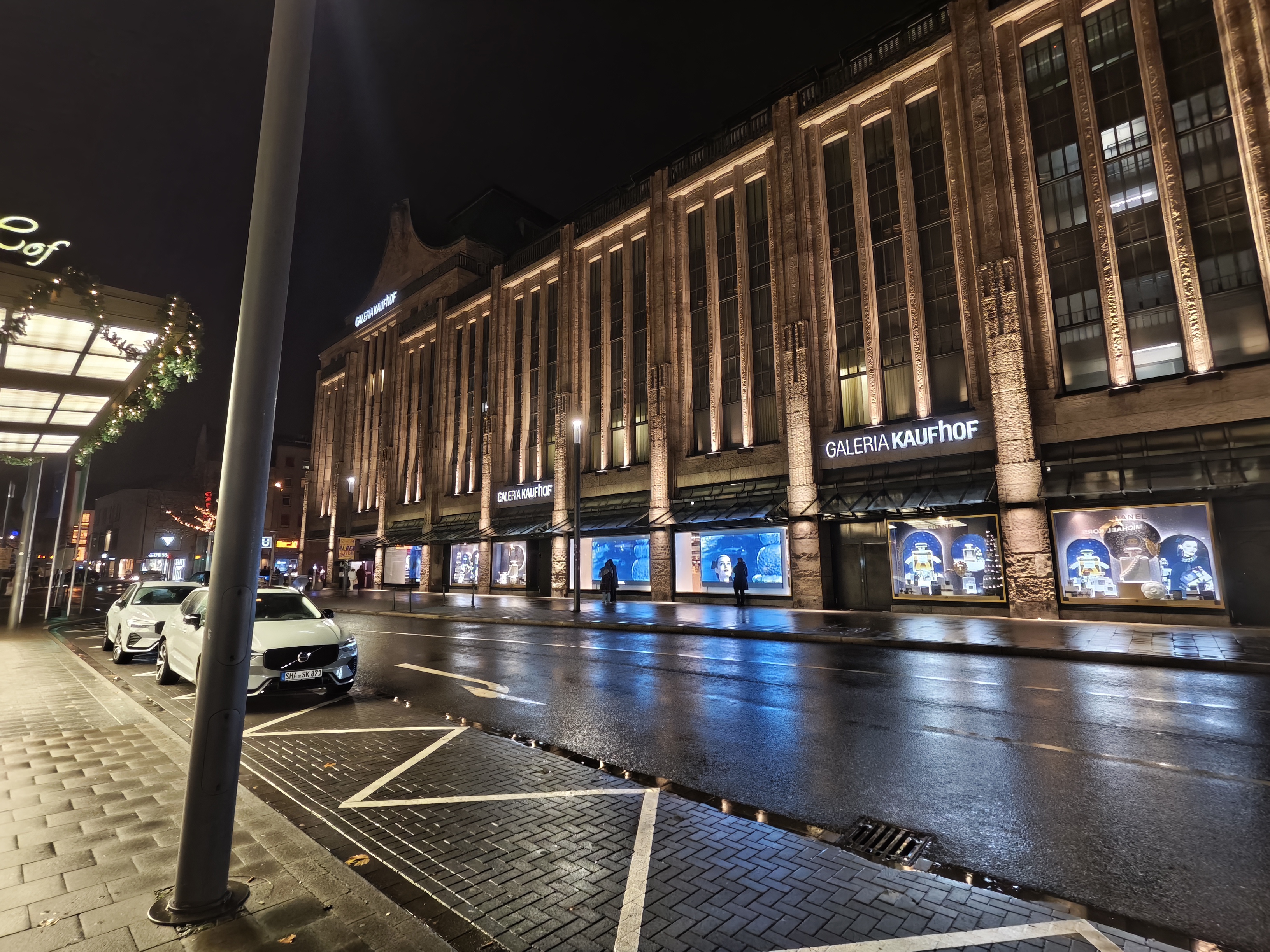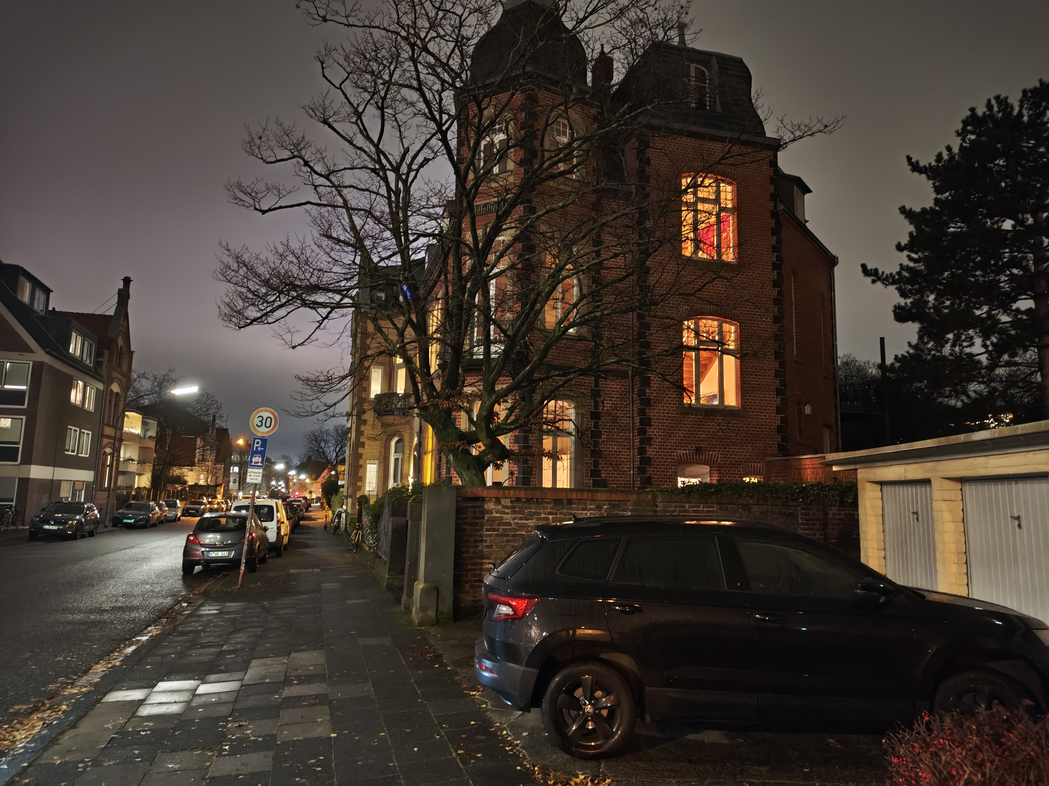 Sobald das Licht schwindet, zeigt sich ein gemischtes Bild. Positiv ist, dass die Aufnahmen scharf und sauber bleiben; Details gehen auch in den Ecken nicht verloren. Allerdings greift die Software beim Aufhellen der Schatten teilweise zu aggressiv ein, wodurch die Bilder etwas überbearbeitet wirken. Zudem haben wir einen deutlichen Gelbstich in vielen Nachtaufnahmen festgestellt, der die Atmosphäre etwas verfälscht.