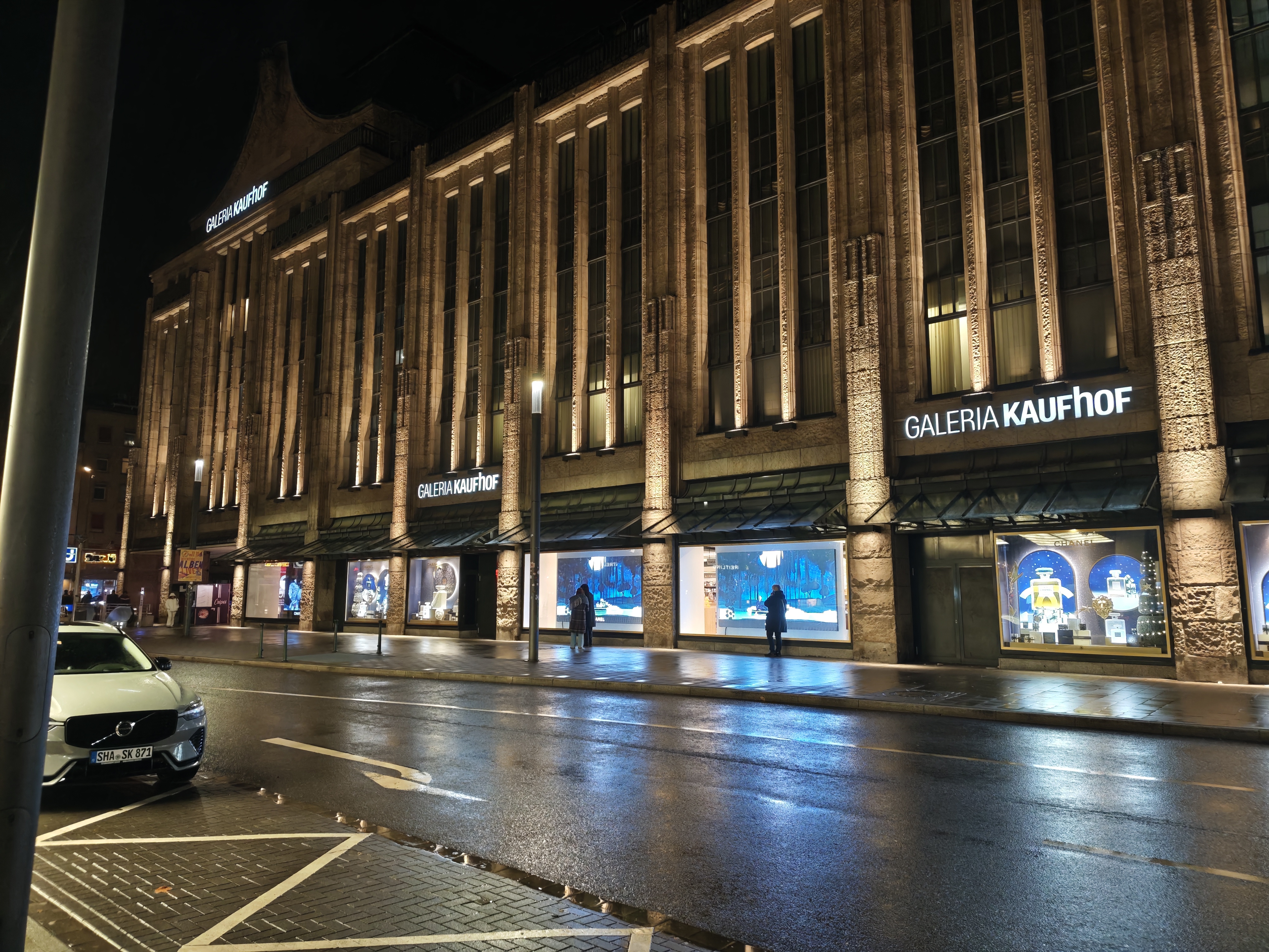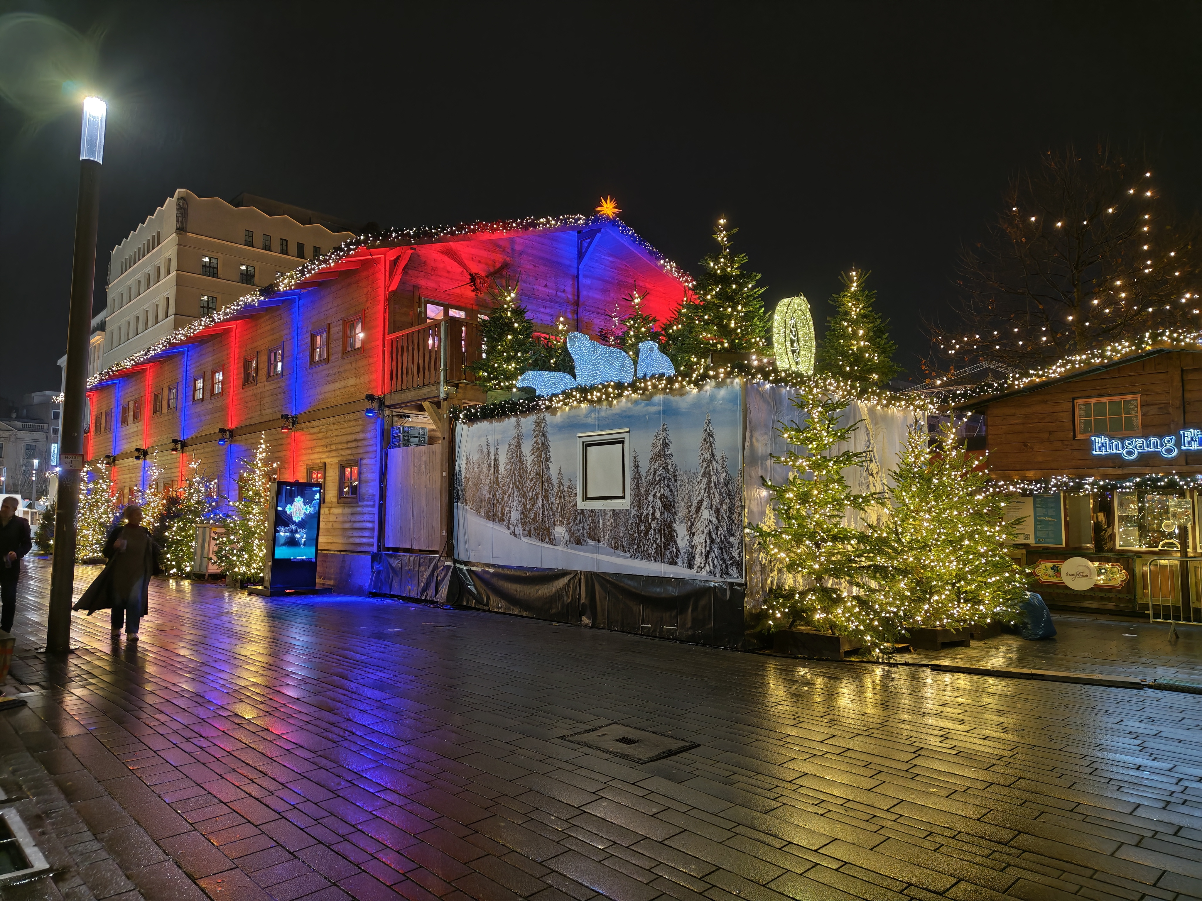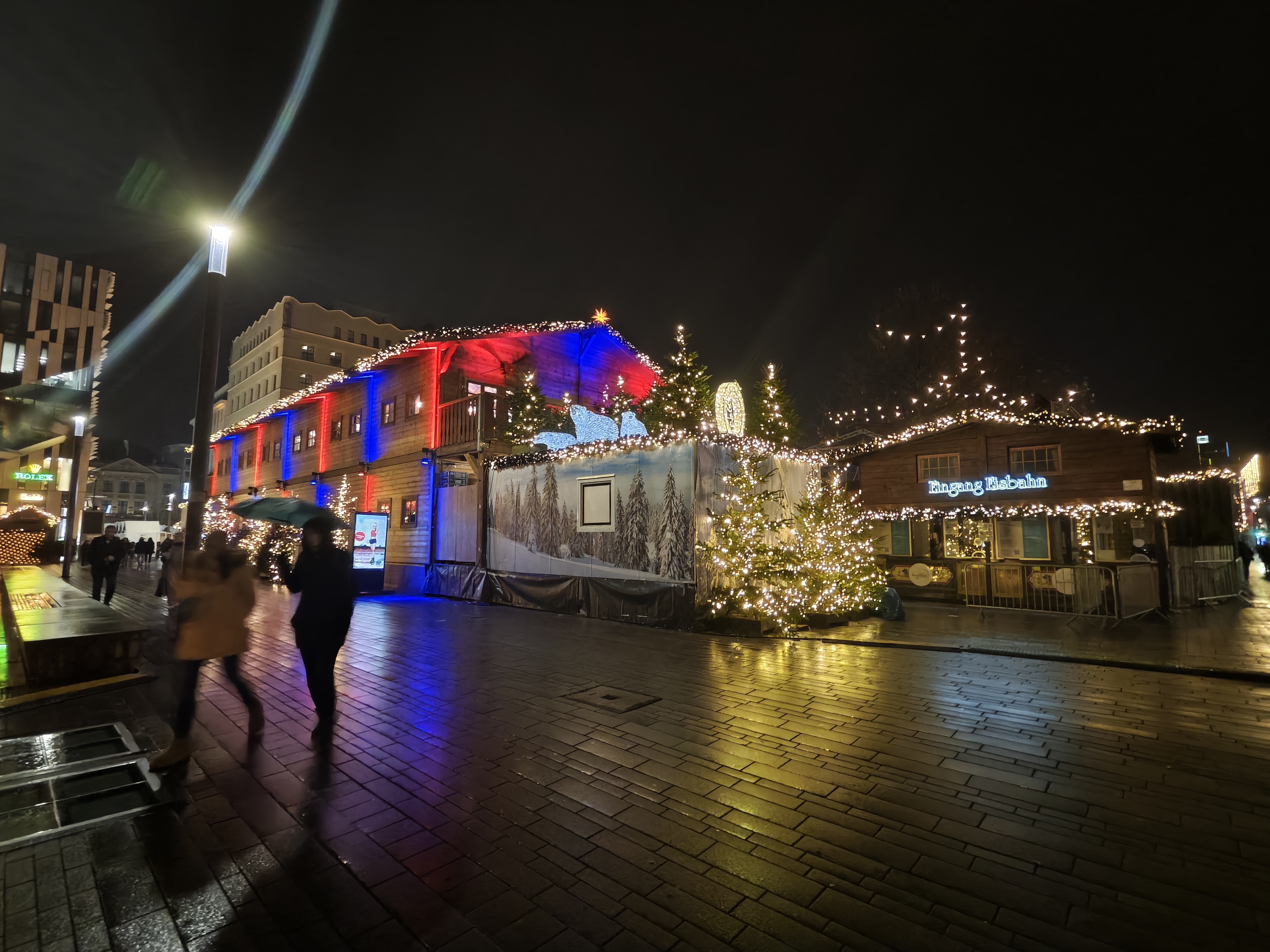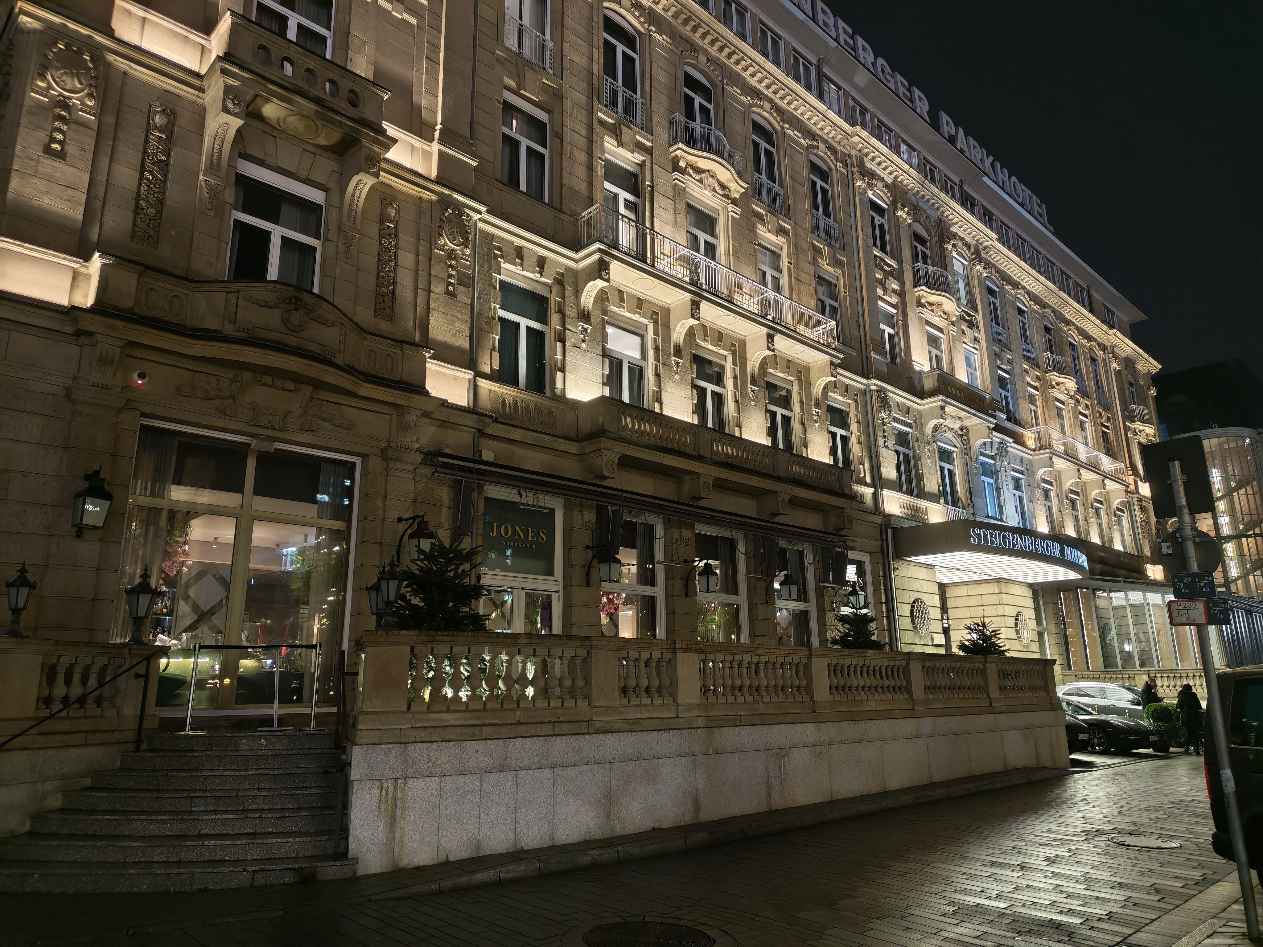 Sobald das Licht schwindet, zeigt sich ein gemischtes Bild. Positiv ist, dass die Aufnahmen scharf und sauber bleiben; Details gehen auch in den Ecken nicht verloren. Allerdings greift die Software beim Aufhellen der Schatten teilweise zu aggressiv ein, wodurch die Bilder etwas überbearbeitet wirken. Zudem haben wir einen deutlichen Gelbstich in vielen Nachtaufnahmen festgestellt, der die Atmosphäre etwas verfälscht.