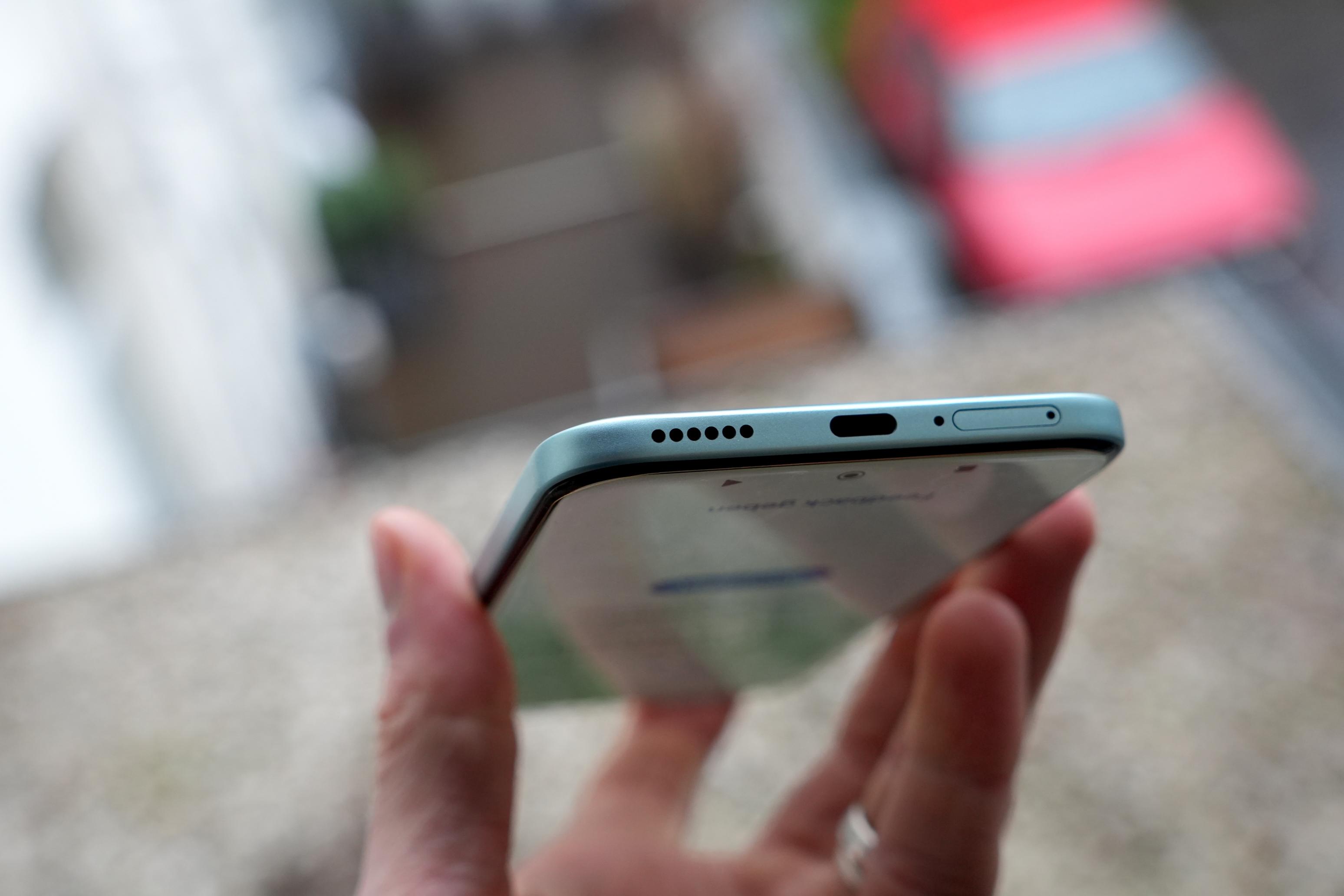 Das Kameramodul auf der Rückseite ist mittig platziert und enthält vier Linsen. Es ragt 3,5mm heraus, das Gerät wackelt aber erfreulicherweise kaum auf flachen Oberflächen. Vorne befindet sich die Selfie-Cam in einem kleinen, mittigen Punch-Hole von ca. 4mm. Unten am Gerät sitzt der USB-C 2.0 Anschluss. Der Kartenslot nimmt zwei SIM-Karten auf. Das Gerät ist im Gegensatz zum Redmi Note 15 Pro+ aber nicht eSIM-fähig.