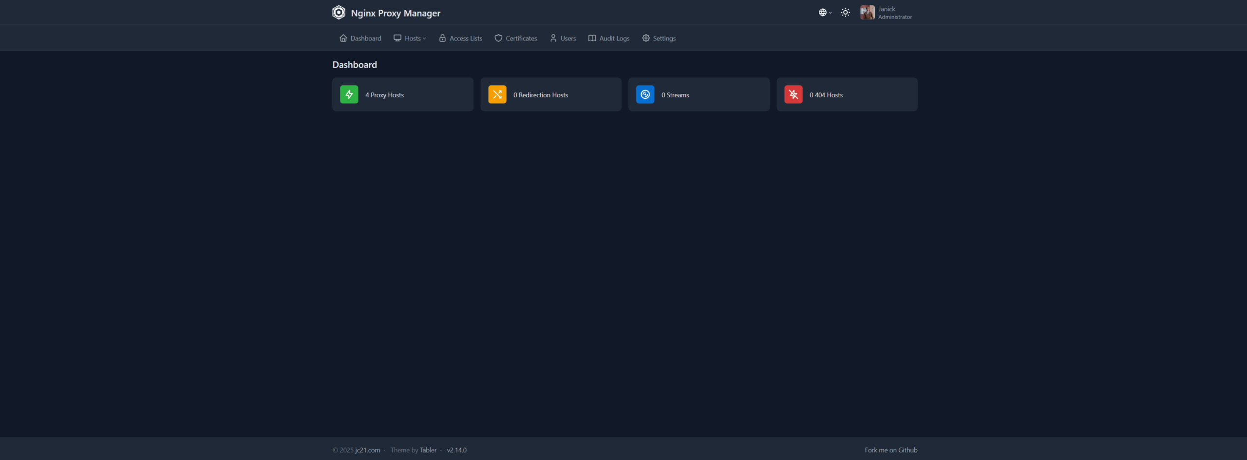 Nun solltet ihr eine NGINX-Testseite zu Gesicht bekommen, wenn ihr die interne IP-Adresse eures NAS mit dem Port 8080 aufruft. Wenn das funktioniert, wechseln wir zurück in das Admin-Interface des NGINX Proxy Manager auf unserem VPS. Dort erstellen wir einen Proxy Host für unsere Domain und leiten diese auf die Tailscale-IP unseres NAS weiter.