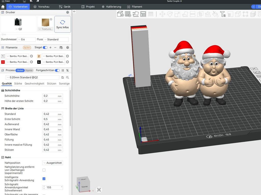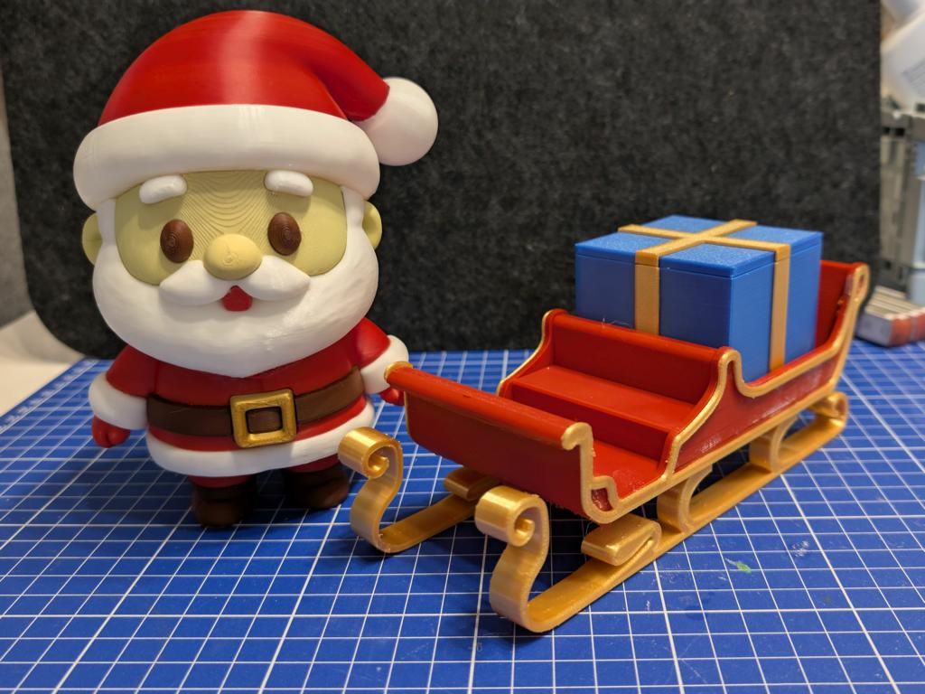 PLA ist für den QIDI Q2 eine leichte Aufgabe. Oberflächen sind sauber, Kanten scharf, Details klar erkennbar. Stringing tritt kaum auf. Auch längere Drucke laufen stabil durch. Für Alltagsdrucke liefert der Q2 konstant gute Ergebnisse. Lediglich bei einem Silk-Filament trat ein Fehler auf. Dies kann aber an meinen nicht für dieses Material optimierten Einstellungen liegen. Der Weihnachtsmann mit Schlitten besteht aus zusammengeklebten Einzeldrucken aus PLA und war absolut fehlerfrei.