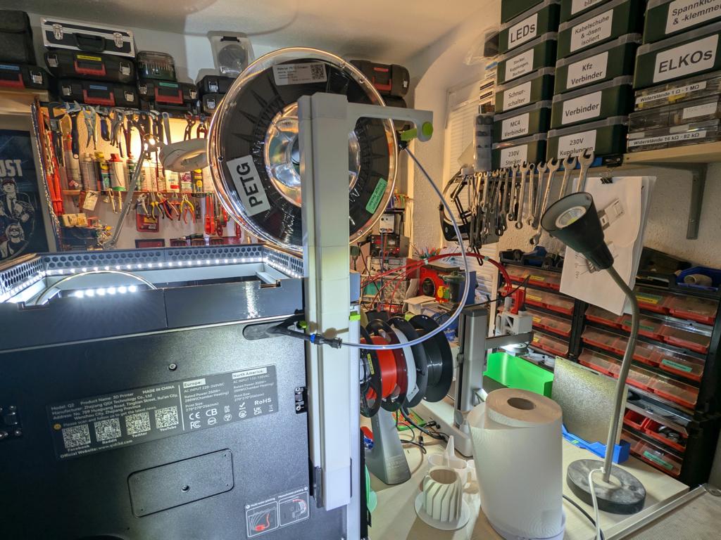 In der Praxis bleibt nur eine sinnvolle Lösung: Ihr solltet die serienmäßige Halterung durch eine externe, stabile Filamentführung ersetzen oder umbauen. Positiv ist, dass sich dieser Schwachpunkt leicht beheben lässt. Danach wirkt der QIDI Q2 deutlich runder.
