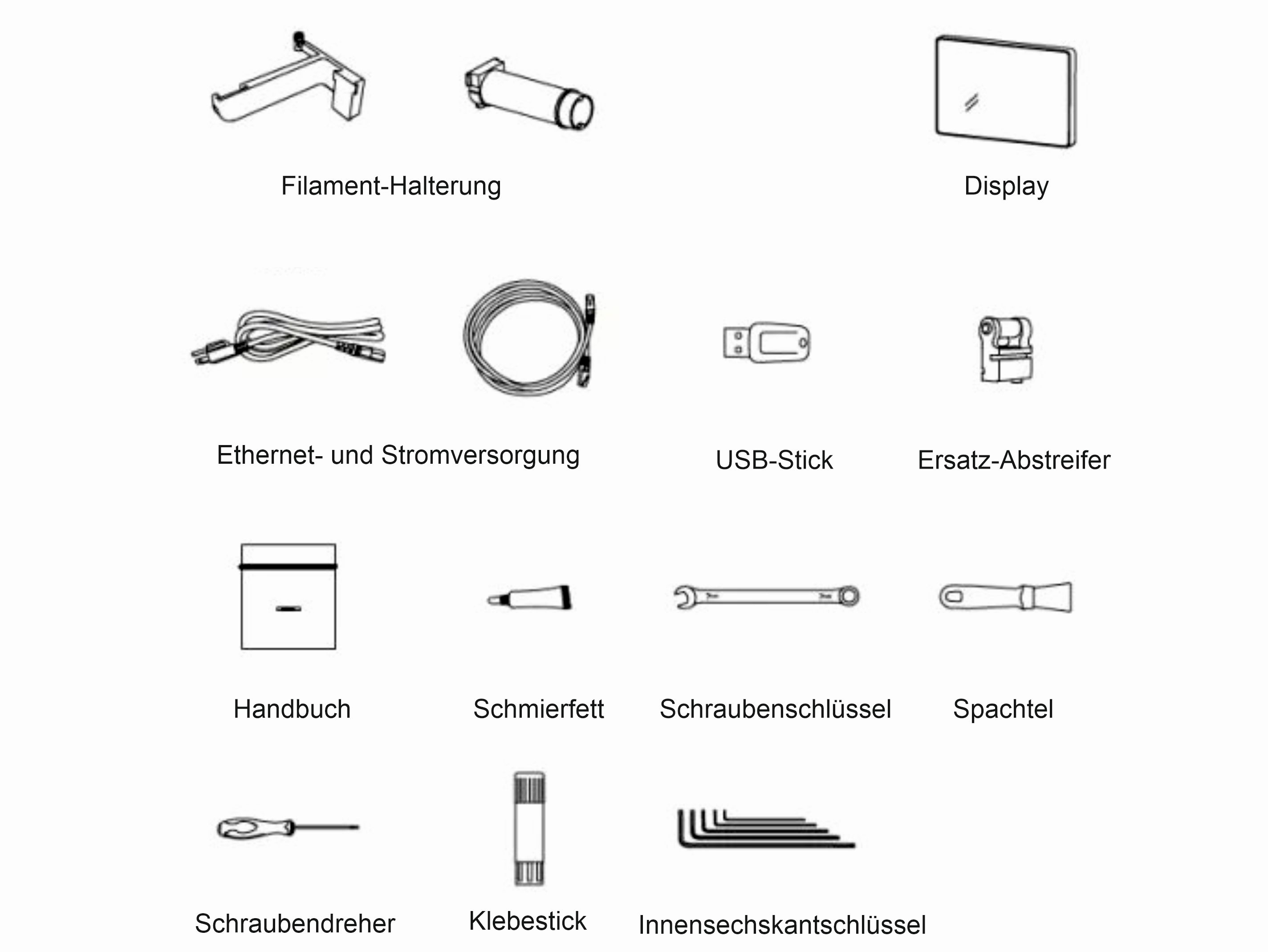 Der Lieferumfang ist praxisgerecht zusammengestellt. Neben dem weitgehend vormontierten Drucker liegen eine flexible PEI-Federstahlplatte, ein Werkzeugset für Wartung und Düsenwechsel, ein USB-Stick sowie eine kurze gedruckte Anleitung bei. Für den Start ist alles Notwendige vorhanden. Ihr könnt den Drucker nach dem Auspacken und Entfernen der Transportsicherungen direkt in Betrieb nehmen, ohne weiteres Zubehör beschaffen zu müssen.