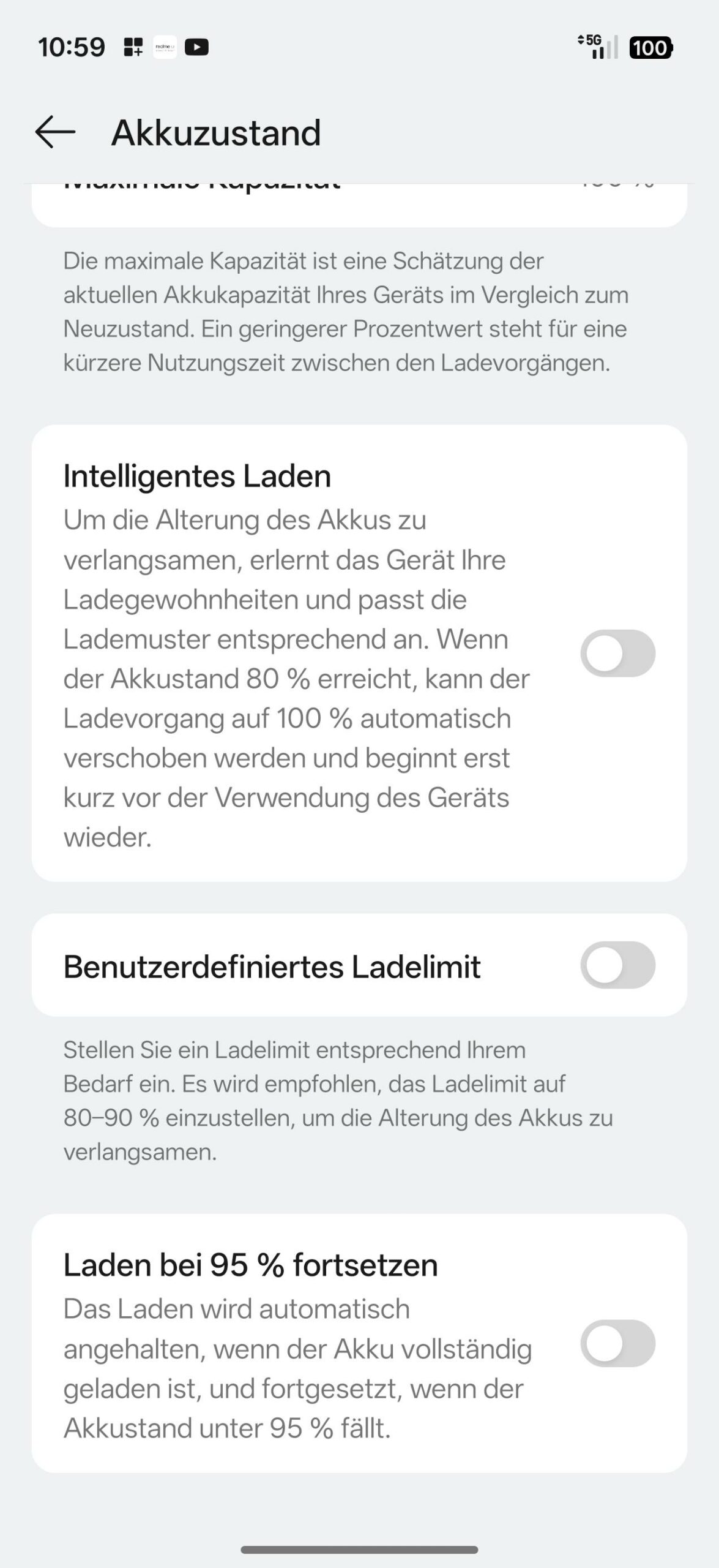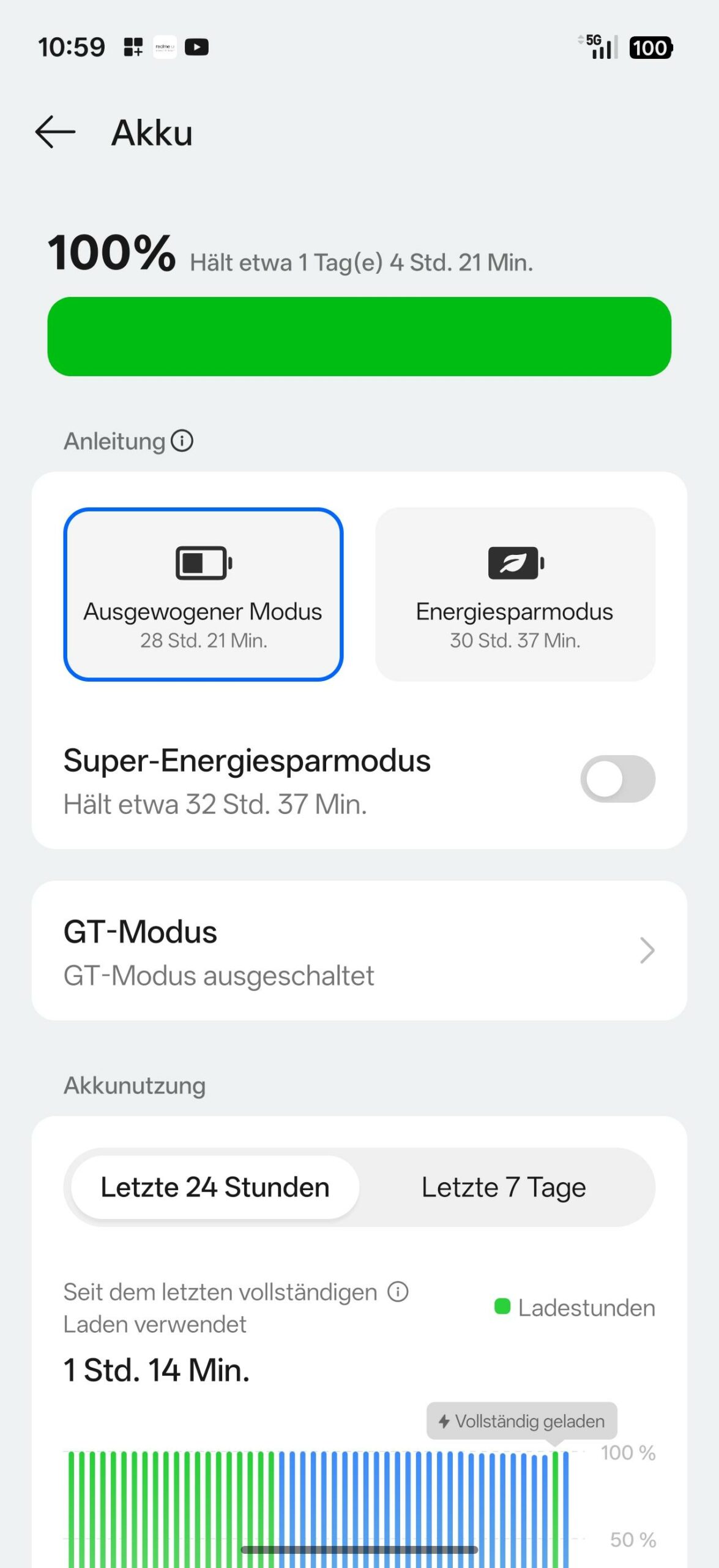 Auch das Realme 16 Pro profitiert von der neuen Akkutechnologie, und es ist immerhin ein 6500mAh großer Akku in der EU-Version verbaut. Damit ist dieser nur 500mAh kleiner als in der globalen Variante. Dieser sorgt im Alltag für exzellente Laufzeiten. Bei normaler Nutzung sind 3 Tage problemlos möglich. Insbesondere wenn ihr die Auflösung reduziert, steigert es die Laufzeit abermals. Eine Stunde YouTube verbraucht bei 200 Lux Helligkeit 4% Akku. Zwei Tage Laufzeit bei intensiver Nutzung mit rund 9 Stunden DOT sind kein Problem.