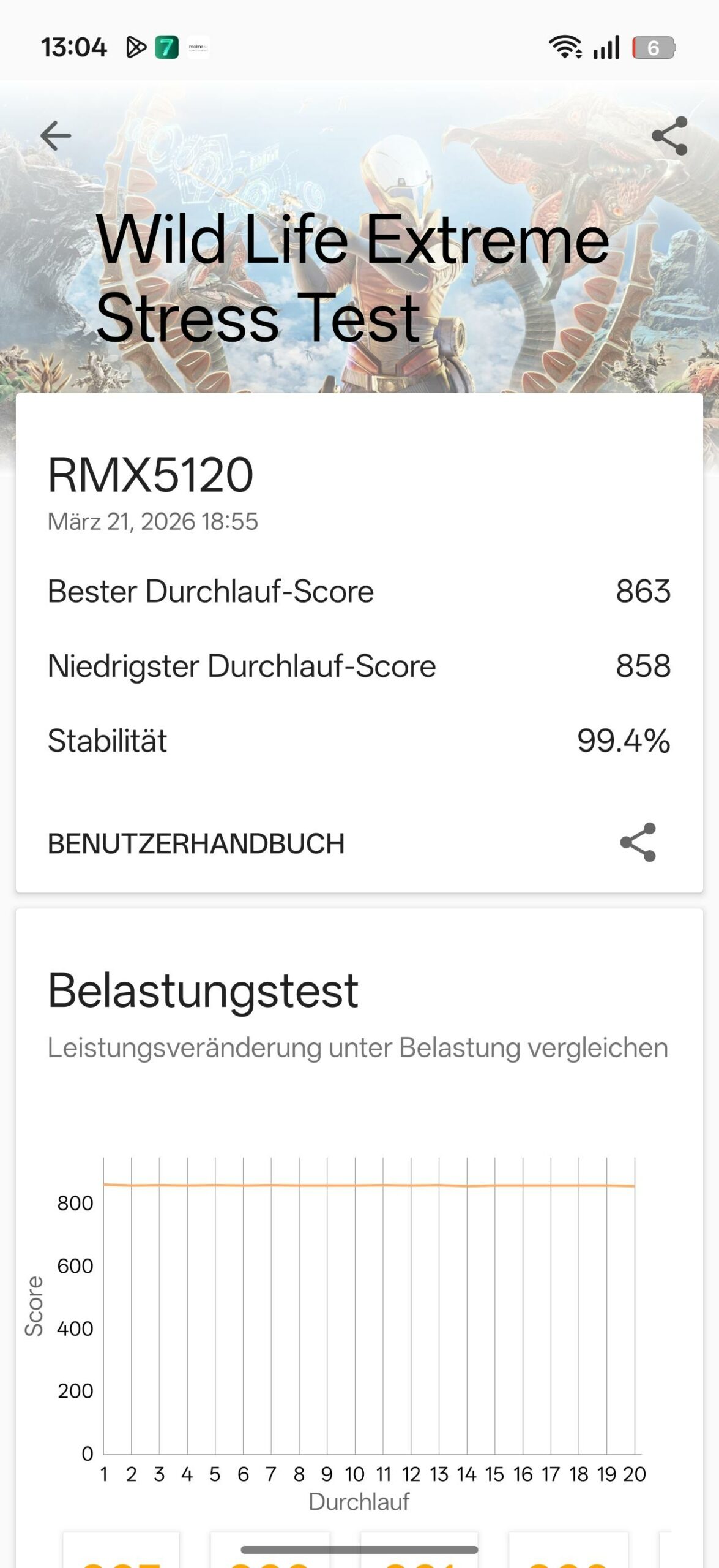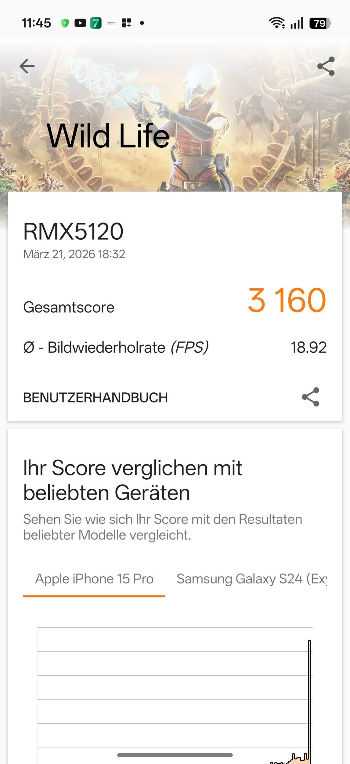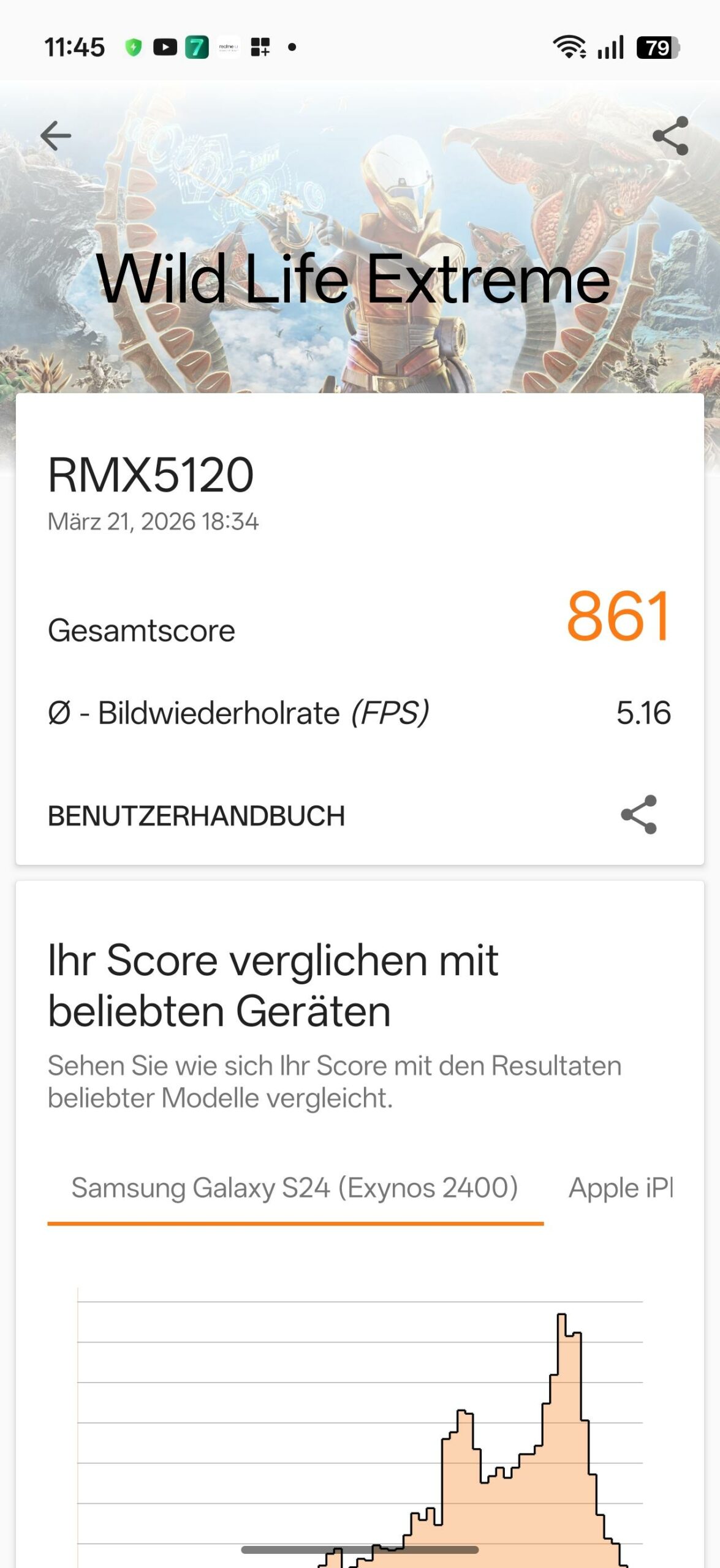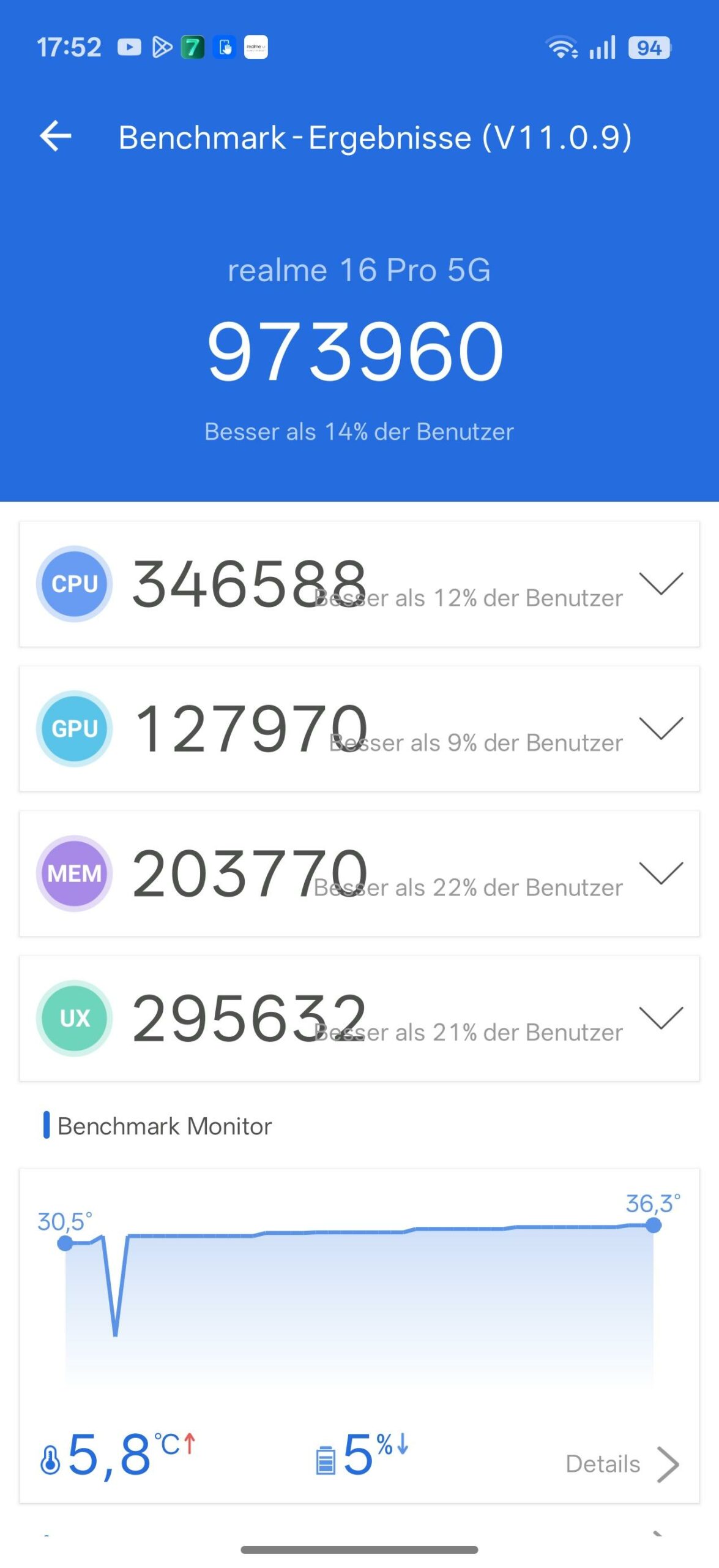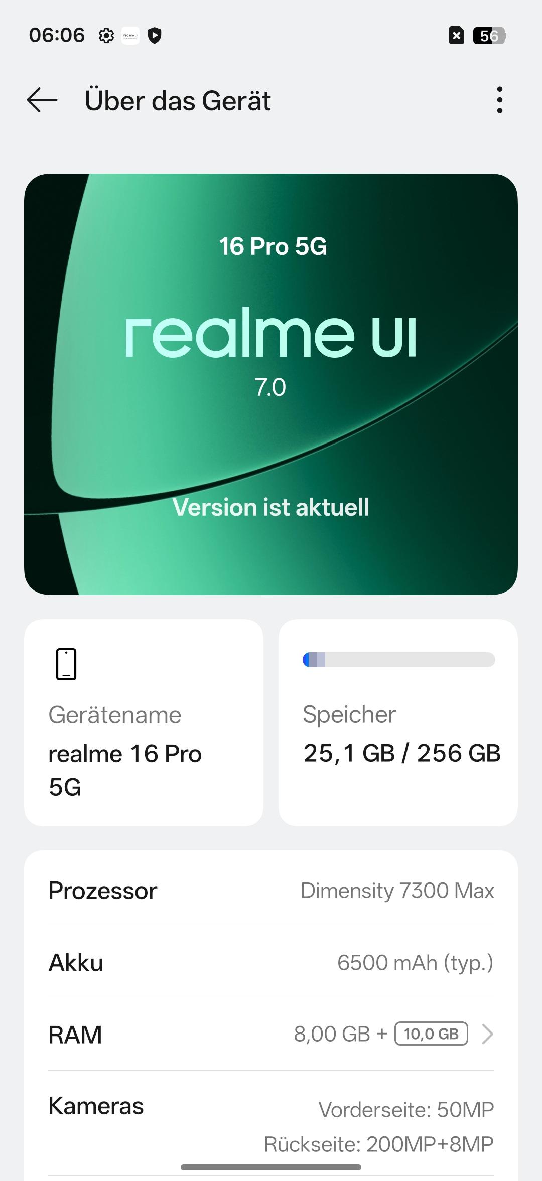 Der im Realme 16 Pro verbaute Mediatek Dimensity 7300 ist eine solide Wahl für die Mittelklasse und war schon im Realme 14 Pro verbaut. Lasst euch nicht vom Marketing von Realme verwirren, denn der Max-Zusatz ist überflüssig. Einen Dimensity 7300 Max gibt es schlicht nicht und auch die Prozessor-ID und Leistung deuten auf einen 7300 hin. Vier Leistungskerne im ARM-A78-Design werden mit vier Energiesparkernen im ARM-A55-Design gepaart. Die CPU wird in 4nm gefertigt und taktet maximal mit 2,5GHz. Die Bedienung fühlt sich bis auf komplexe Aufgaben flüssig an.