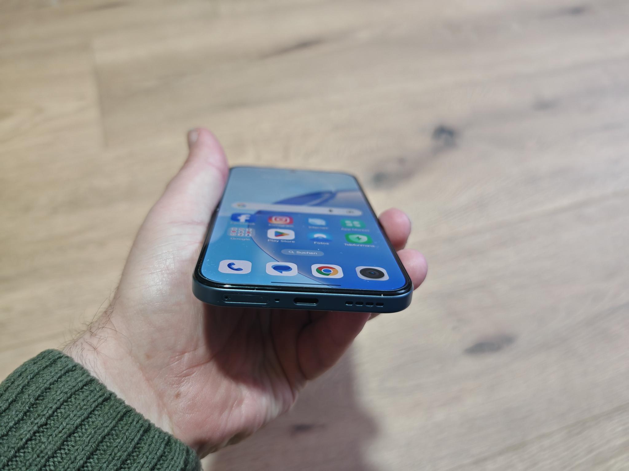 Als Erstes ist mir die Rückseite aufgefallen, mit dem Kameraplateau oben links. Optisch ganz ansprechend und aus Metall gefertigt, steht dieses rund 3mm aus dem Gehäuse hervor. Drei Sensoren und ein LED-Blitz sind dort zu finden. Der Realme-Schriftzug ergänzt die Rückseite. Das Smartphone kippelt ohne Hülle auf dem Tisch. Der Rest des Realme 16 Pro ist recht unspektakulär und ähnelt vielen anderen Modellen. Power-Button und Lautstärke-Wippe sind auf der rechten Seite verbaut, während sich unten ein Mikrofon, Dual-SIM-Slot, USB-C-2.0-Anschluss und ein Lautsprecher tummeln. Die Hörmuschel dient als zweiter Lautsprecher für den Stereosound.