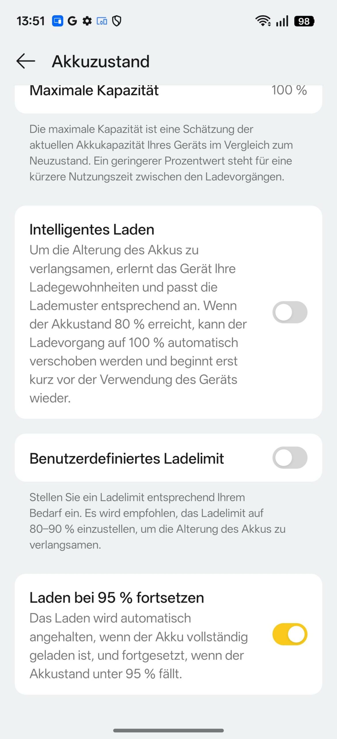 So verwundert der Spitzenplatz in den Benchmarks nicht, denn das Realme 16 Pro+ ist ein echter Langläufer. Eine Stunde Youtube-Konsum schlägt mit nur 4% des Akkus zu Buche. Nur beim Laden enttäuscht das Smartphone ein wenig, trotz 80 Watt maximaler Ladeleistung. 75 Minuten vergehen, bis der Akku wieder vollgeladen ist. Wie üblich nutzt das Realme SuperVooc als Ladetechnologie, mittels USB PowerDelivery PPS beträgt die maximale Ladeleistung 55W. Mit dem Novoo RG120 (zum Test) dauert es mit 85 Minuten nur unwesentlich länger. Wie üblich sind im System etliche Optionen vorhanden, um den Akku zu schonen, für eine lange Nutzungsdauer des Realme 16 Pro+.
