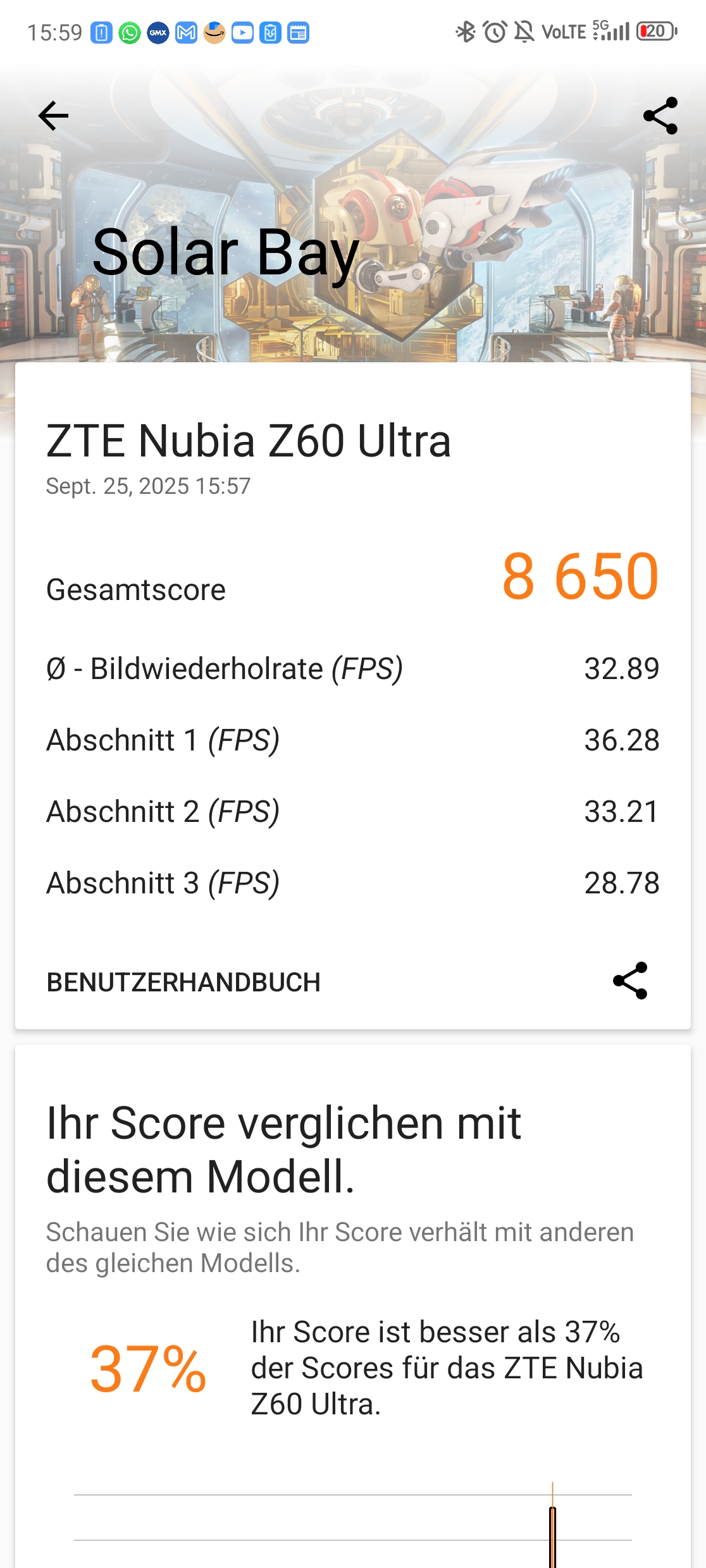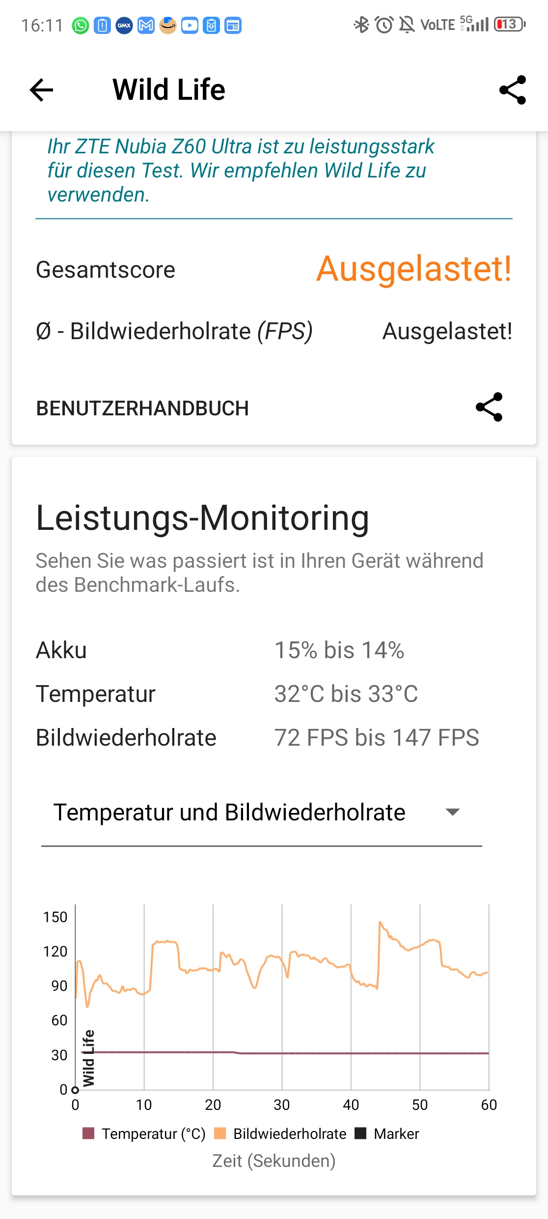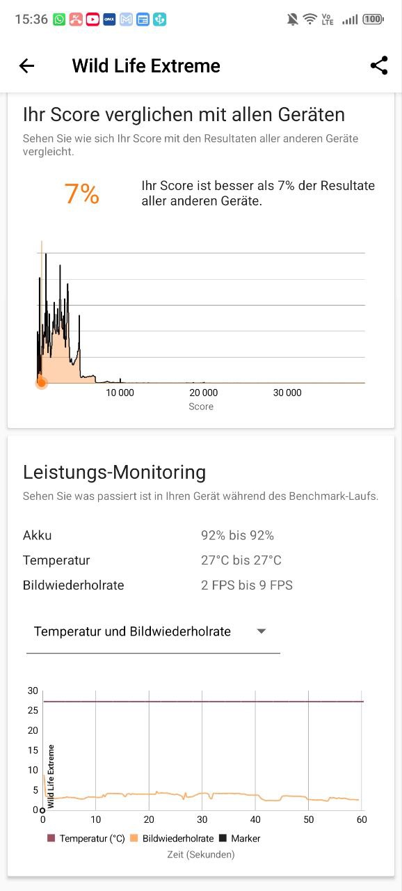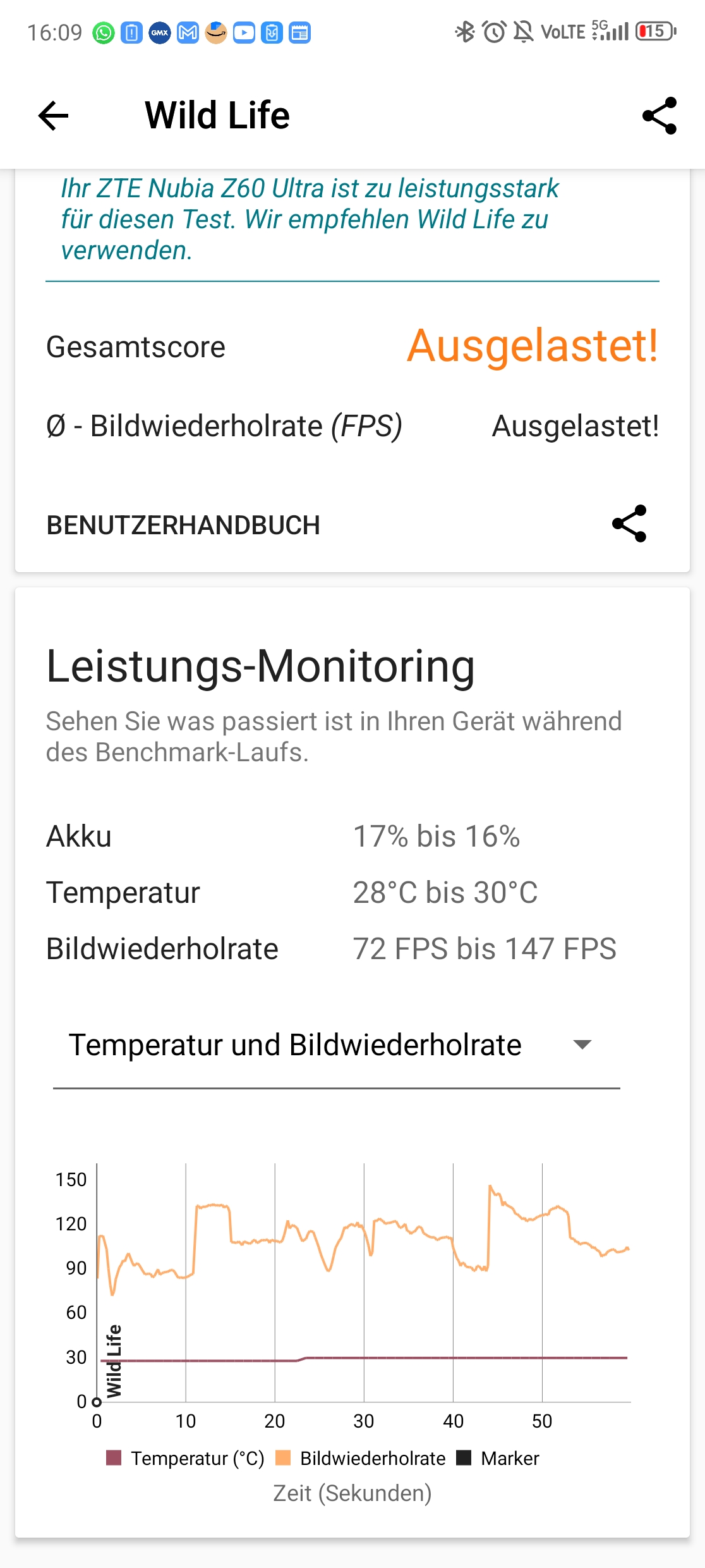 Auch beim Nubia Z60 Ultra fällt die Verbesserung nur marginal aus. Stellenweise gibt es minimal mehr FPS im Nachkommabereich und ein paar Punkte mehr im Score, die aber nicht der Rede wert sind. Selbst bei den Temperaturen tut sich wenig. Zwei bis drei Grad mögen im Grenzbereich ausschlaggebend sein, bei einem Mittel von 30°C kommt jedoch nicht mal die Hand ins Schwitzen, die das Gerät hält.