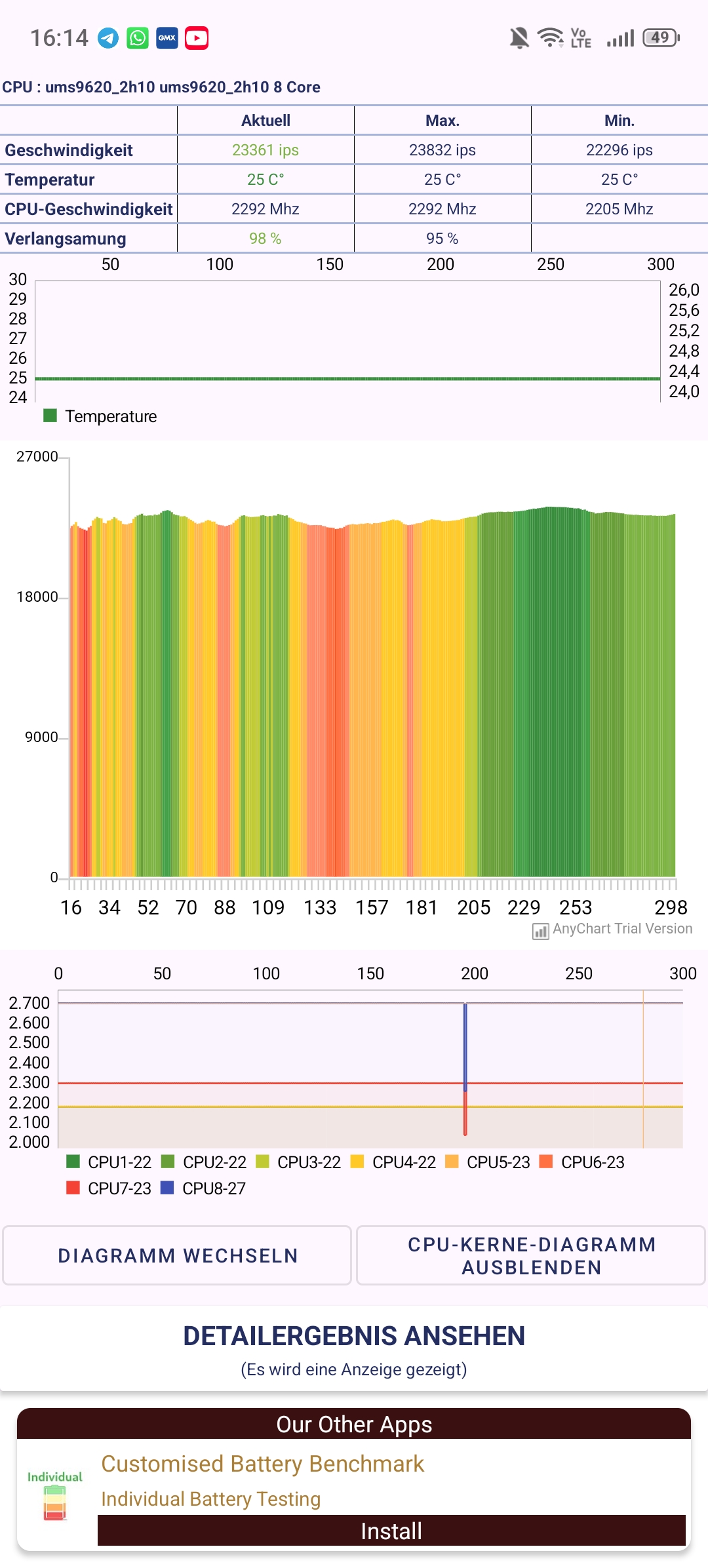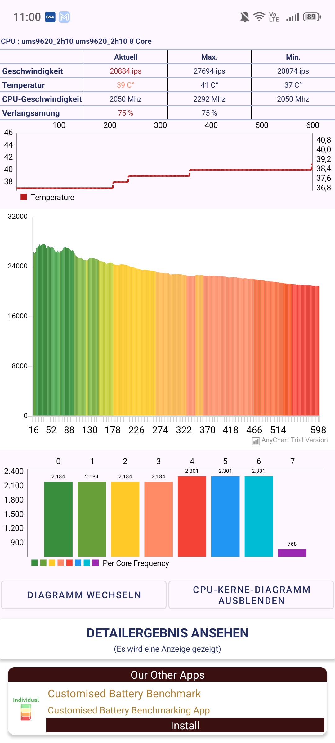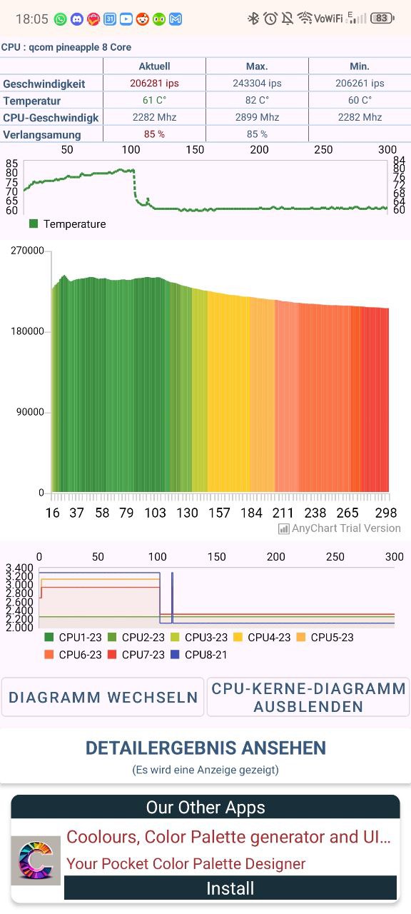 Beim Neo 3 GT 5G zeigt sich, dass der Unisoc T9100 keine Drosselung mehr aktivieren muss. Der Bereich unter dem Kühler ist eiskalt. Für den RedMagic Cooler 6 Pro ist die erzeugte Abwärme zu gering, er verharrt selbst jetzt noch bei -3°C. Die zweite Grafik zeigt, dass einzelne Kerne der CPU durchaus warm werden, sonst wäre der Graf komplett grün. Eine Maximaltemperatur von 25°C und ein Leistungsabfall von lediglich 2% sind jedoch kaum der Rede wert und eine deutliche Verbesserung gegenüber der Drosselung um 25% im ersten Bild. Im zweiten CPU-Belastungstest konnten wir gar keine Drosselung mehr nachweisen, eine Steigerung von 7%, wobei die Belastung an sich offensichtlich auch geringer ausfiel.