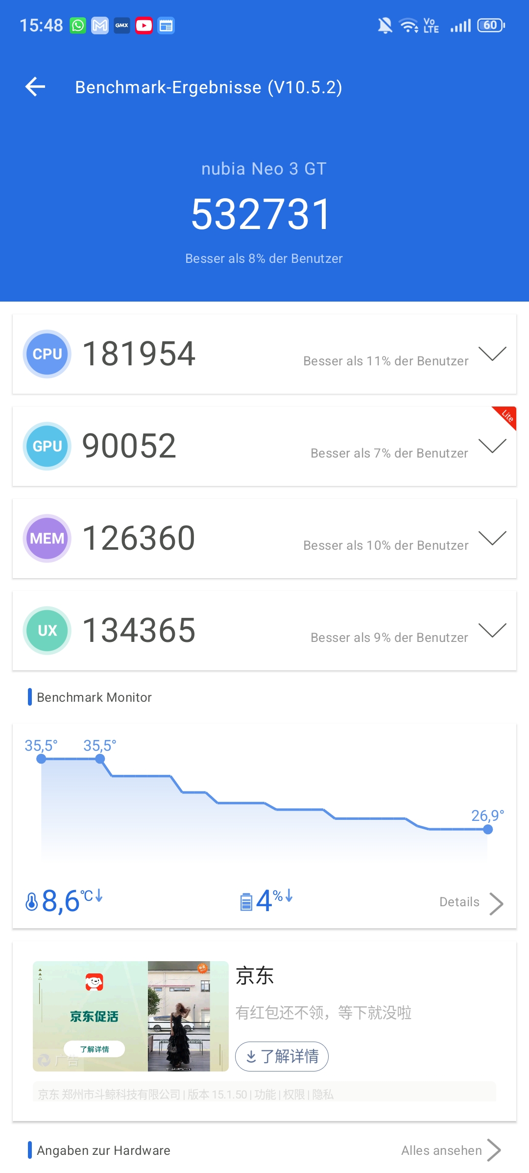 Weg vom reinen Drosselungstest, hin zu bekannteren Benchmarks wie Antutu und 3D-Mark. Los geht’s wieder mit dem Nubia Neo 3 GT 5G. Bei Antutu liegen 530.150 Punkte ohne Kühlung an. Mit Kühlung kann das Gerät seine Werte um immerhin 2.581 Punkte steigern. Das reicht jedoch nicht, um sich viele Plätze im Ranking nach oben zu schieben. Bei Wild Life Extreme steigert sich die Punktzahl nur marginal und die Temperatur sinkt um rund drei Grad, ansonsten gibt es kaum Leistungssteigerungen. Die normalen Benchmarks sind in ihrer Belastung dafür zu kurz.