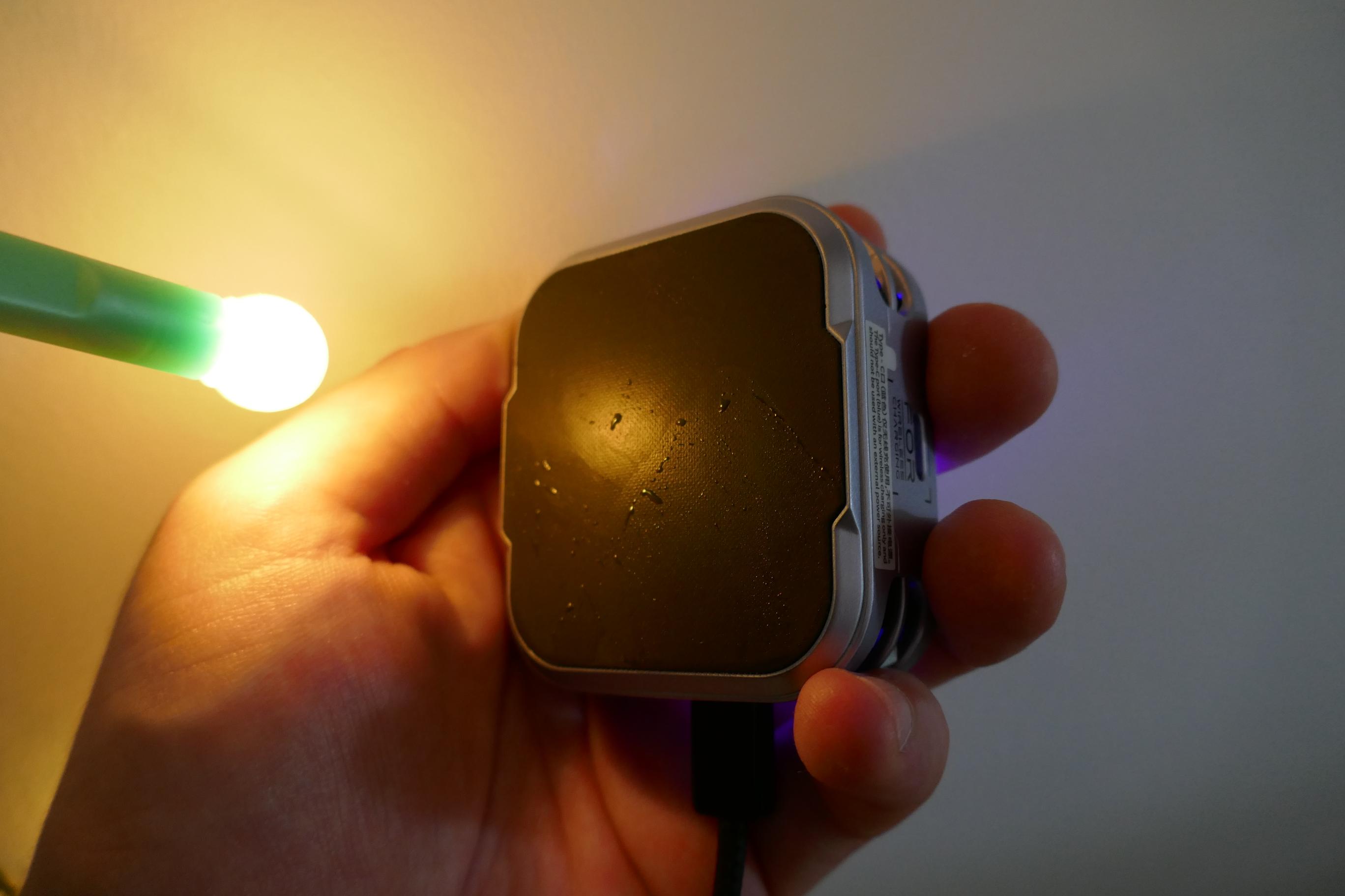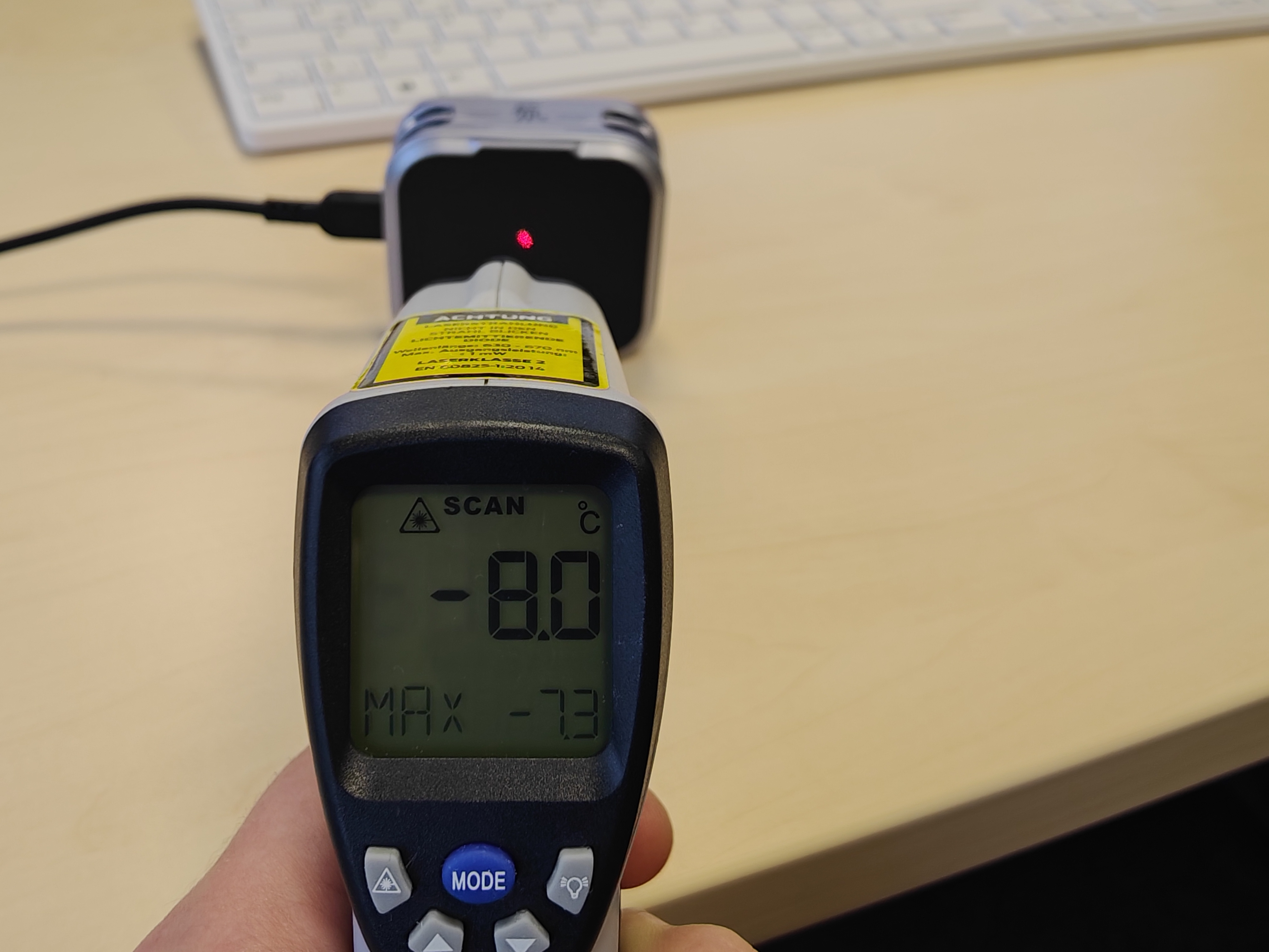 Diese Kombination erreicht am Gerät selbst eine Temperatur von -8°C, wenn der Lüfter auf einem Holztisch liegt. In der Luft schafft er laut internem Sensor grob -3°C. Wenn ihr die Kühlfläche mit einem Laser-Messgerät anleuchtet, könnt ihr diese Temperaturen bestätigen. Wer es immer noch nicht glaubt, dem hilft ein Antippen mit dem Finger.