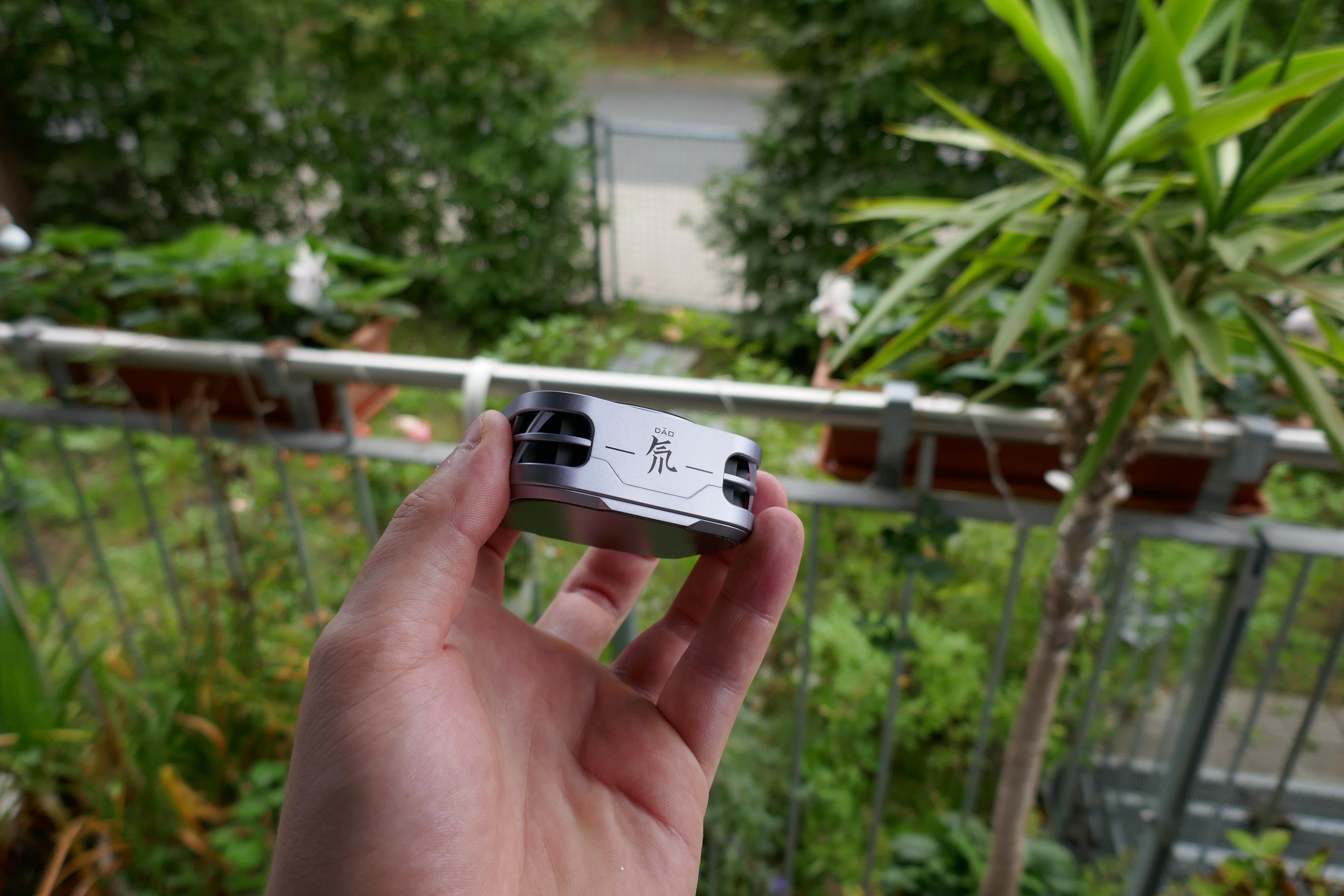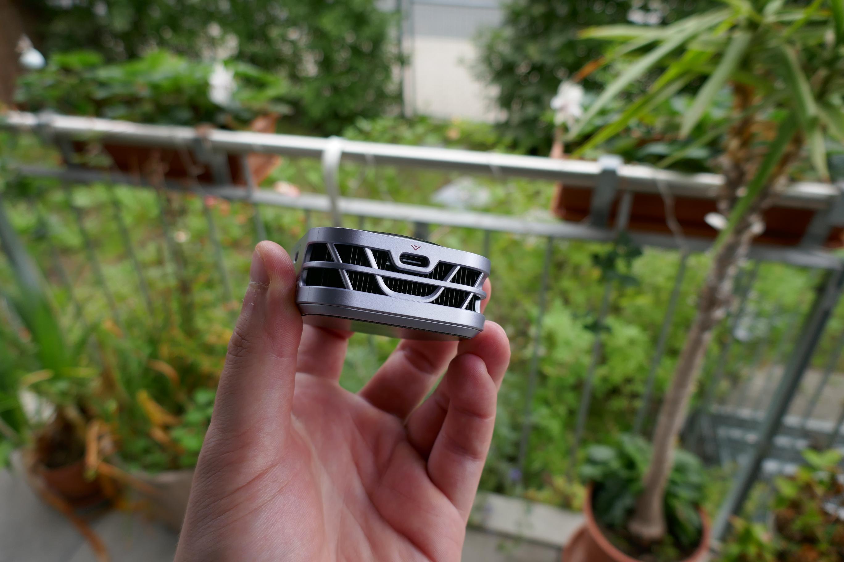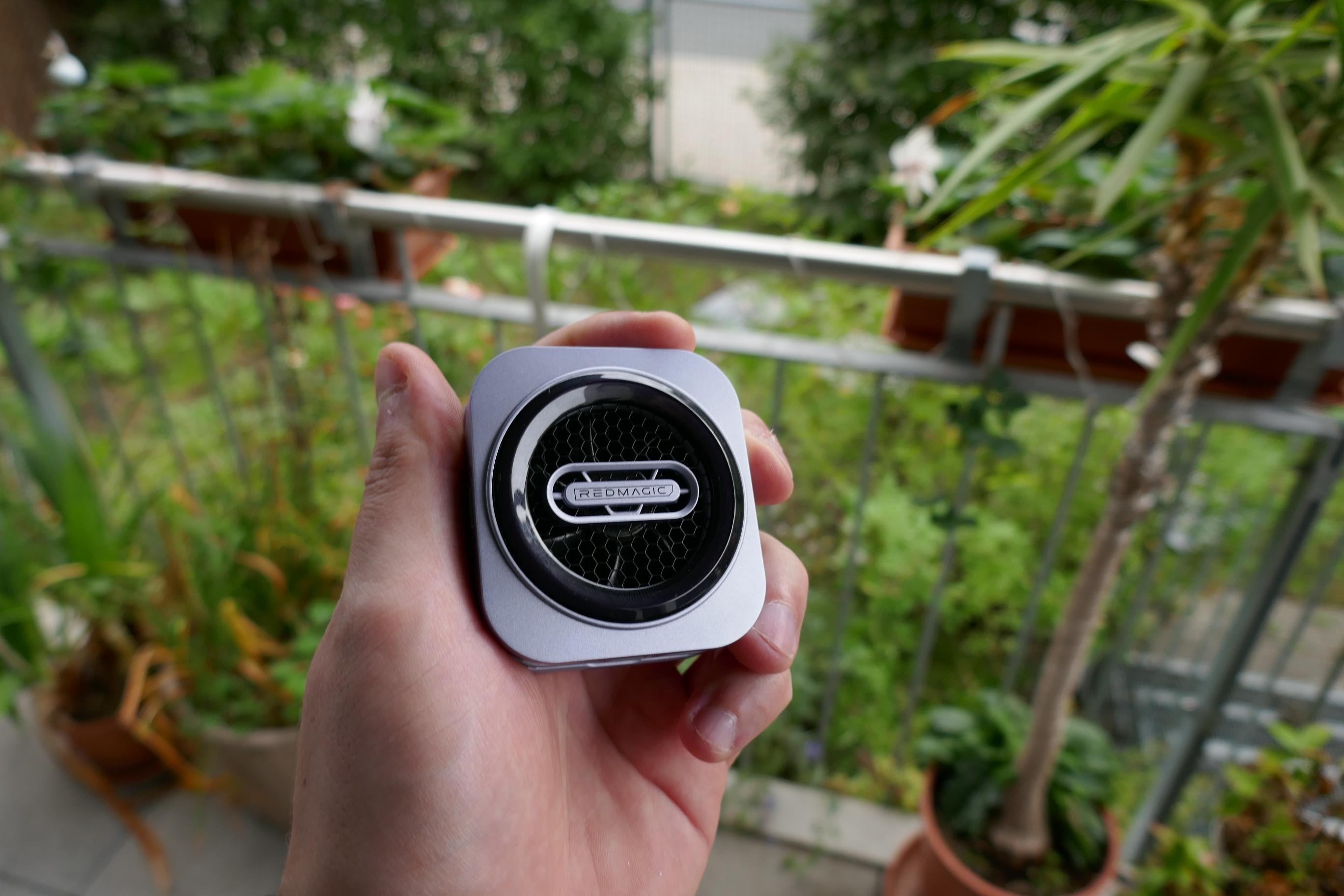 Wenn ihr den RedMagic Cooler 6 Pro auspackt, haltet ihr einen Block mit den Abmessungen 64 x 59 x 24 Millimeter und einem Gewicht von 110 Gramm in der Hand. Die Oberseite gibt durch ein Aluminiumgitter den Blick auf den Lüfter frei, der von einem LED-Ring umgeben ist. Seitlich befinden sich Schlitze für die Abluft. An der Vorderseite ist ein einzelner Schieberegler platziert, mit dem ihr das Gerät aktiviert. Auf der gegenüberliegenden Seite befindet sich der USB-C-Anschluss, denn ohne Strom funktioniert auch hier nichts. Der Schriftzug „DAO“ deutet auf die Gaming-Accessory-Serie von RedMagic hin, ähnlich wie bei den RedMagic Cyberbuds Dao TWS (zum Test). An dessen gegenüberliegender Flanke befindet sich ein weiterer USB-C-Anschluss. Ein ausdrücklicher Hinweis weist darauf hin, dass ihr über diesen Anschluss nur ein induktives Ladepad betreiben sollt. Dieses könnt ihr ebenfalls als Zubehör erwerben (allerdings bisher nur als China-Import) und es fügt sich dann nahtlos an den Kühler an. So könnt ihr das Handy gleichzeitig kühlen und laden.