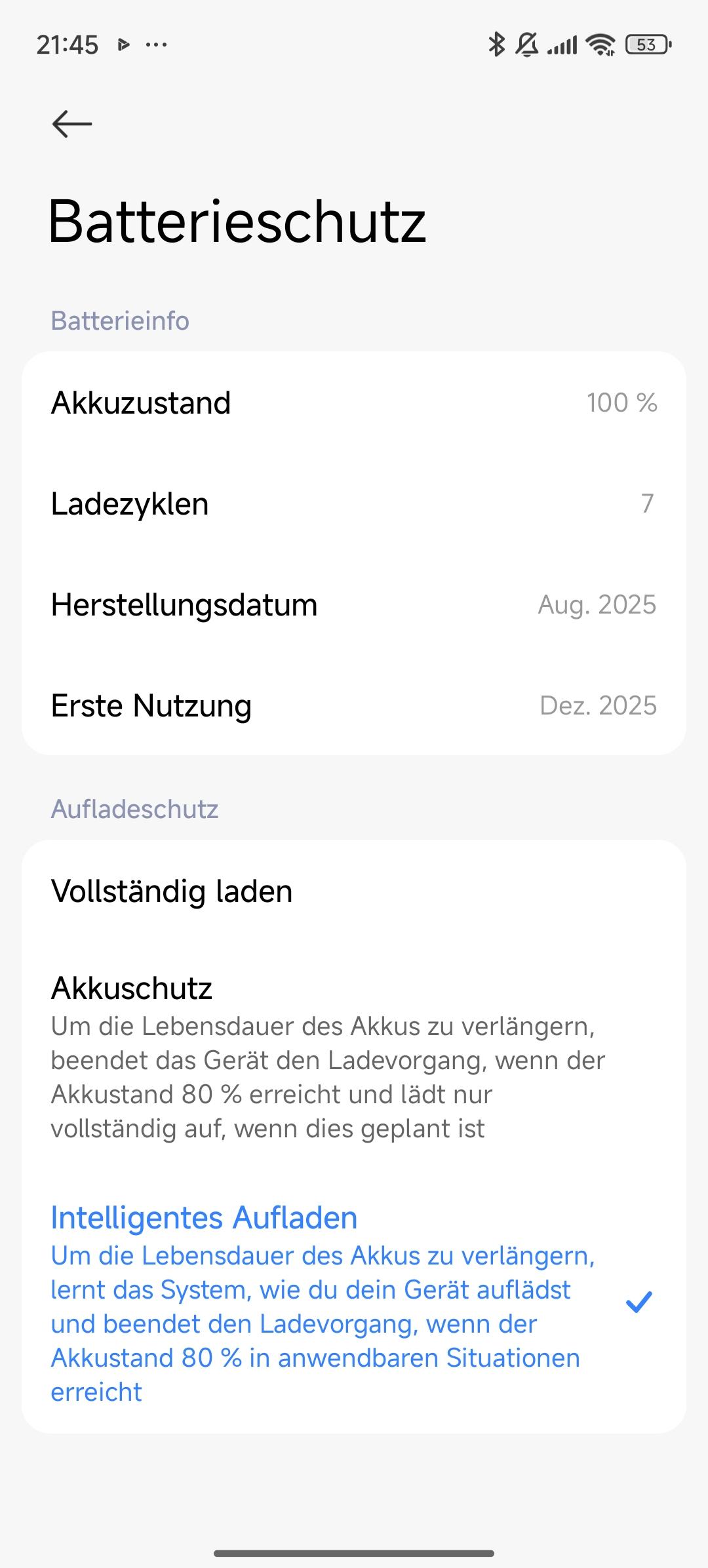 Wer auf einen riesigen Akku im Redmi Note 15 5G gehofft hat, wird ein wenig enttäuscht sein. So müssen 5520mAh Kapazität reichen. Dafür ist das Smartphone aber angenehm leicht und die Laufzeit enttäuscht trotzdem nicht. Zum Schutz der Batterie muss der schnellste Modus erst freigeschaltet werden und im System finden sich Funktionen zum Schutz des Akkus.