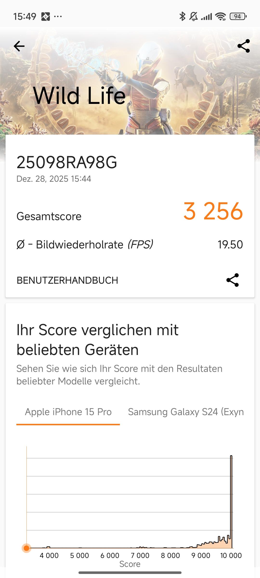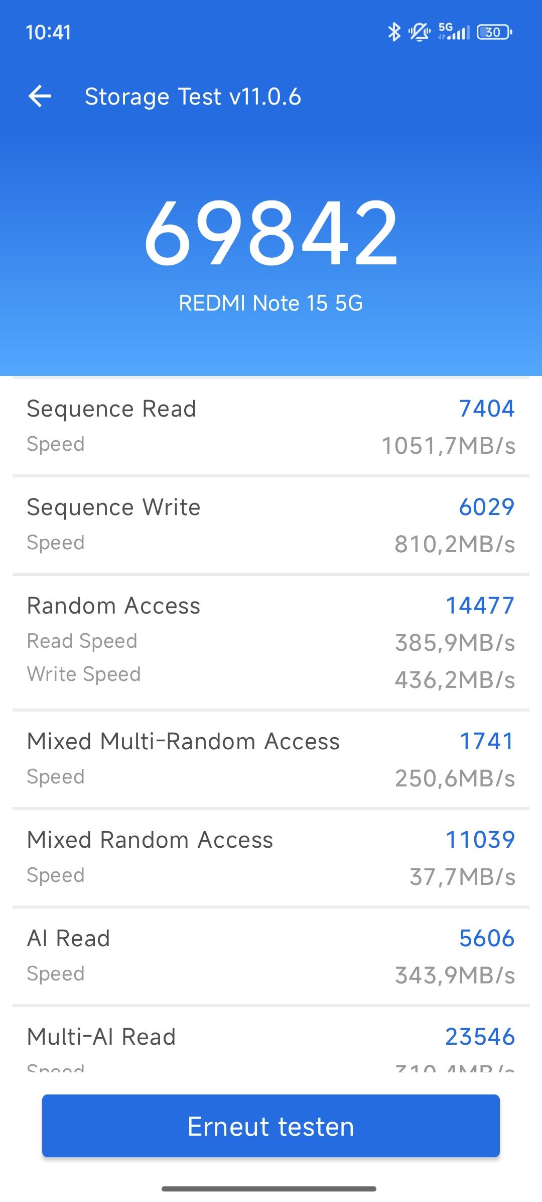 Wie zu erwarten ist die Leistung nur ausreichend und mit Rucklern im System müsst ihr leben können. Wer ein reaktionsschnelles Smartphone sucht, muss sich eine Preisklasse höher umschauen. Auch eine wirkliche Mehrleistung gegenüber dem Vorgänger ist nur marginal wahrnehmbar. Den Einstieg bilden 6GB LPDDR5X RAM und 128GB UFS-2.2-Speicher. Weiterhin gibt es noch eine Variante mit 8GB RAM und 256GB Speicher. Der Festspeicher kann mittels einer microSD-Speicherkarte erweitert werden, solange ihr auf die zweite SIM-Karte verzichten könnt. Die verbaute Adreno 710 als GPU ist für einfache Spiele ausreichend. Bei Reduzierung der Details lassen sich auch aktuelle Spiele wie Fortnite zocken. In der Summe ist die Leistung des Redmi Note 15 5G für die alltäglichen Dinge ausreichend, auch wenn sich das Smartphone gelegentlich eine kleine Denkpause leistet.