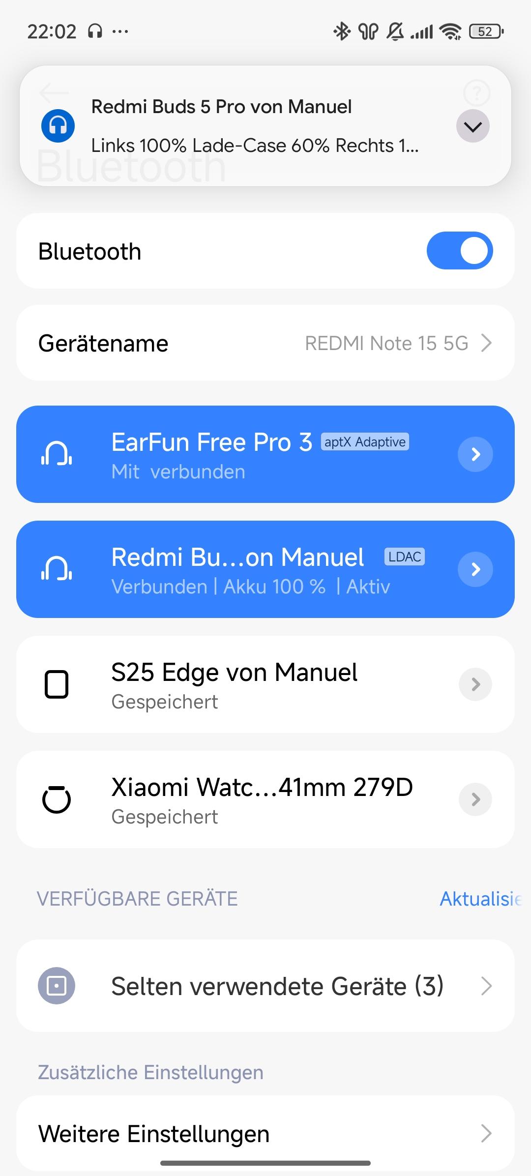 Mit dem Redmi Note 15 5G habt ihr auch ein Stück abseits vom Router noch Empfang, verzichtet dabei auf eine Top-Übertragungsrate. Das verbaute Bluetooth 5.3 ist funktionell und alle meine externen Geräte ließen sich problemlos koppeln. Als Codecs stehen euch SBC, AAC, aptX, LDAC und LHDC zur Verfügung. Auch die Reichweite liegt auf dem Niveau der Konkurrenz. Einen 3,5-mm-Klinkenanschluss hat das Redmi Note 15 5G nicht, dafür müsst ihr den USB-C-Anschluss nutzen, der ebenfalls OTG unterstützt. Oder ihr nutzt den Stereolautsprecher, der überraschend laut wird, aber kaum Tiefgang hat.