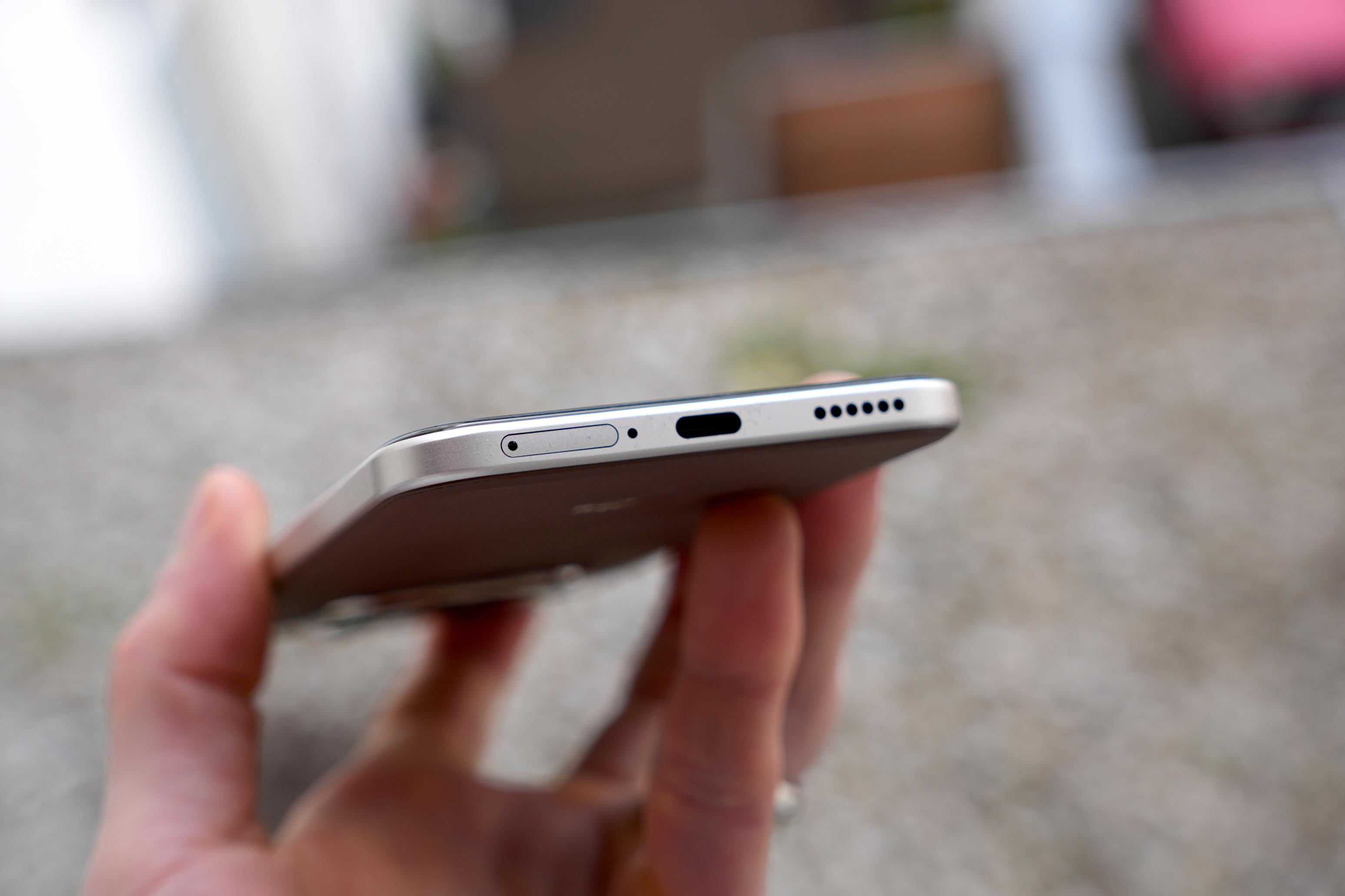 An der Unterseite finden wir den USB-C-Anschluss, der nur mit USB-2.0-Standard arbeitet. Das ist typisch für die Mittelklasse, für ein „Pro+“ Modell aber schade. Der SIM-Slot fasst zwei physische SIM-Karten, unterstützt alternativ aber auch eSIM.