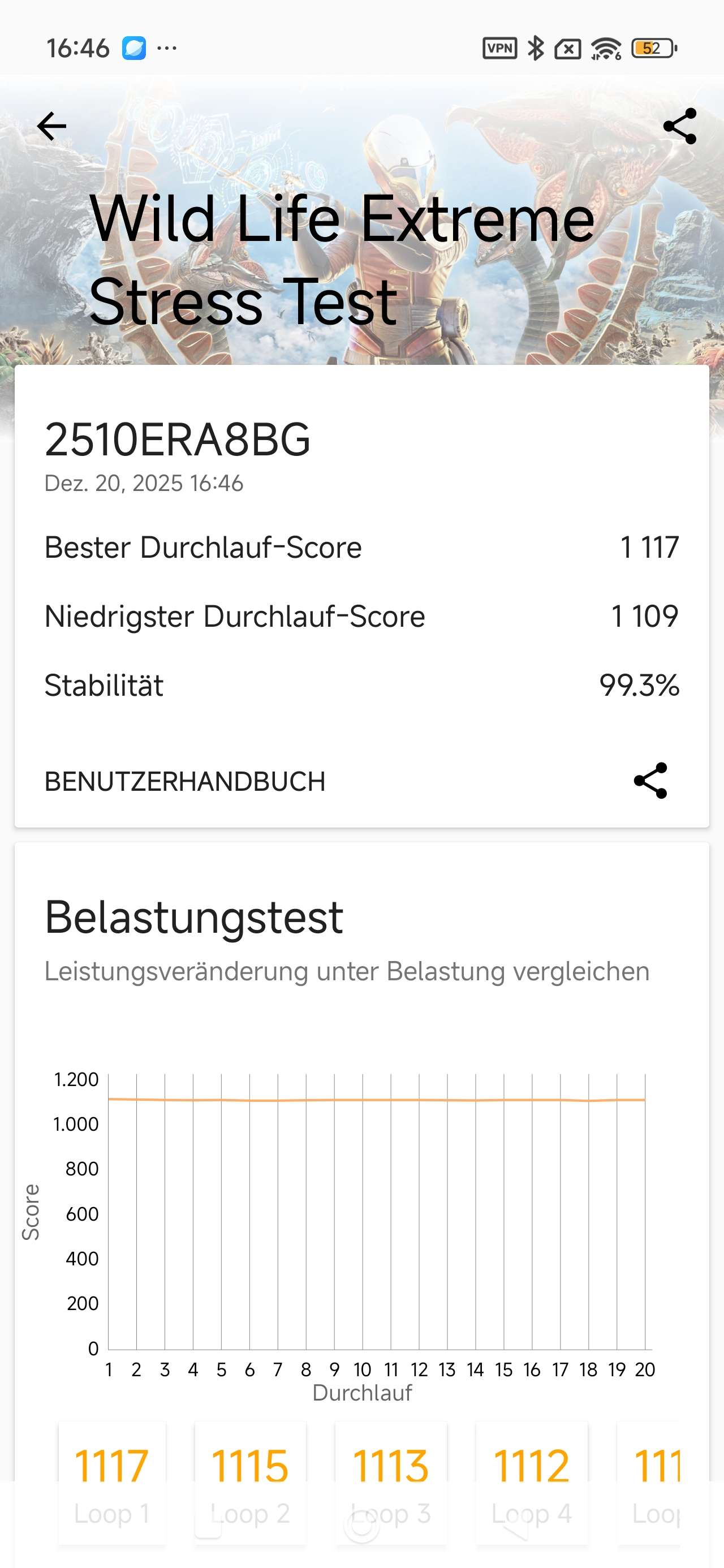Die Akkulaufzeit ist schlichtweg phänomenal. Wir sprechen hier von einem echten 2- bis 3-Tage-Smartphone. Selbst bei intensiver Nutzung ist es praktisch unmöglich, den Akku an nur einem Tag in die Knie zu zwingen. Zwei Tage Laufzeit sind auch für Power-User problemlos machbar. Das bestätigen auch unsere Messungen: Eine Stunde YouTube-Streaming bei 200 Lux Helligkeit verbraucht gerade einmal 5%. Im PC-Mark Akkutest zeigt sich auch, dass der Snapdragon-Prozessor noch etwas effizienter arbeitet als das Mediatek-Pendant im normalen Redmi Note 15 Pro 5G.