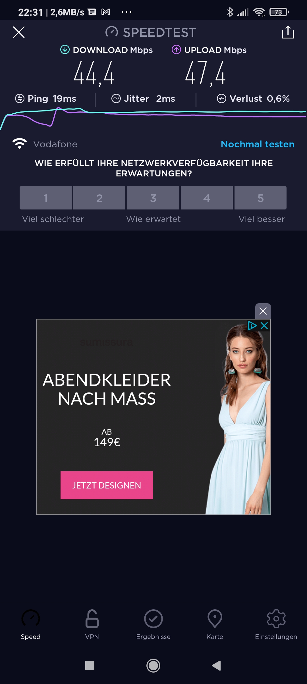 Das Targeting von der Abendkleid-Werbung ist gewöhnungsbedürftig, Maßhemden passen da schon eher zu mir. Aber darum soll es nicht gehen. Das Ergebnis ist ziemlich eindeutig: Im Upload reizt der Rock Space AC1200 die mir zur Verfügung stehende Bandbreite aus – das ist gut! Die Download-Geschwindigkeit ist hingegen merklich langsamer und scheint bei ungefähr 50 Mbit/s begrenzt zu sein.