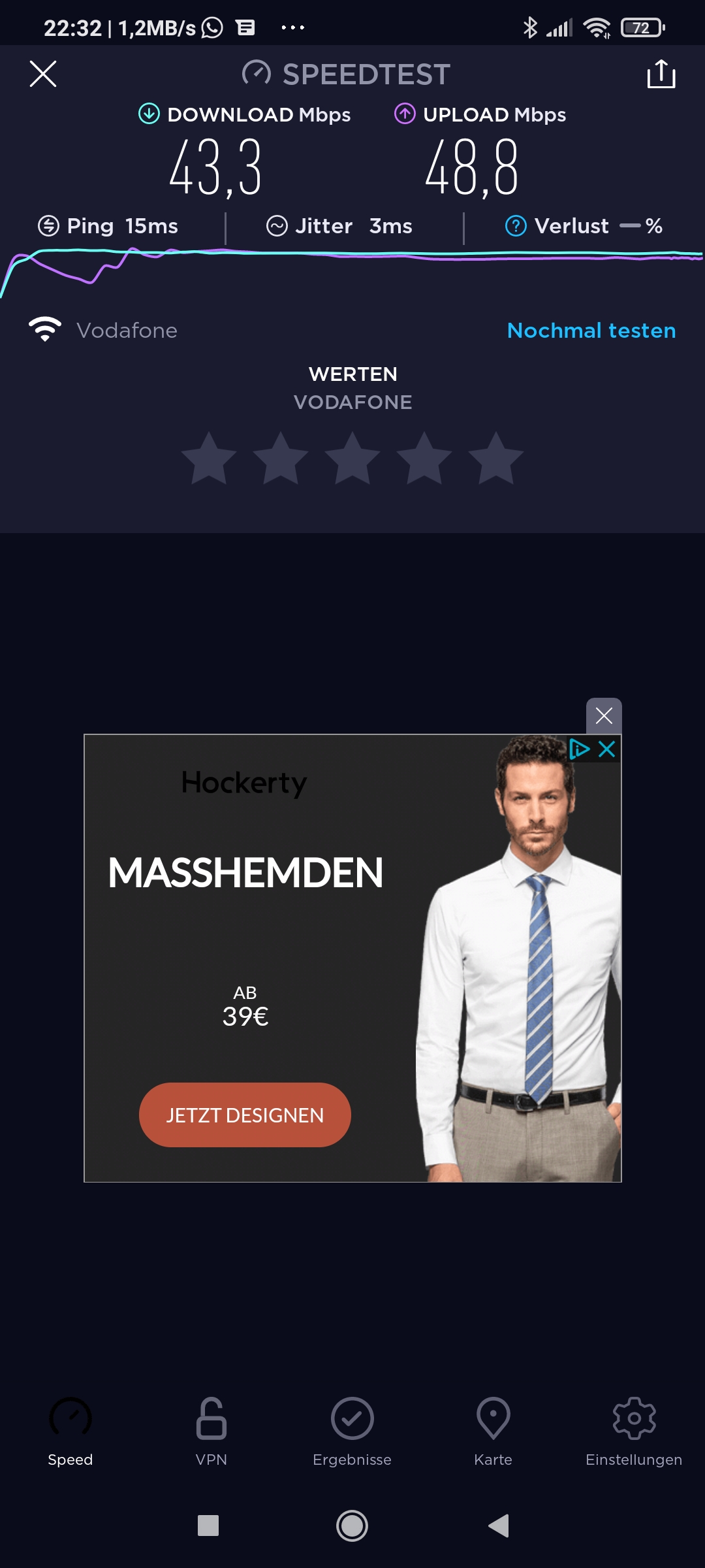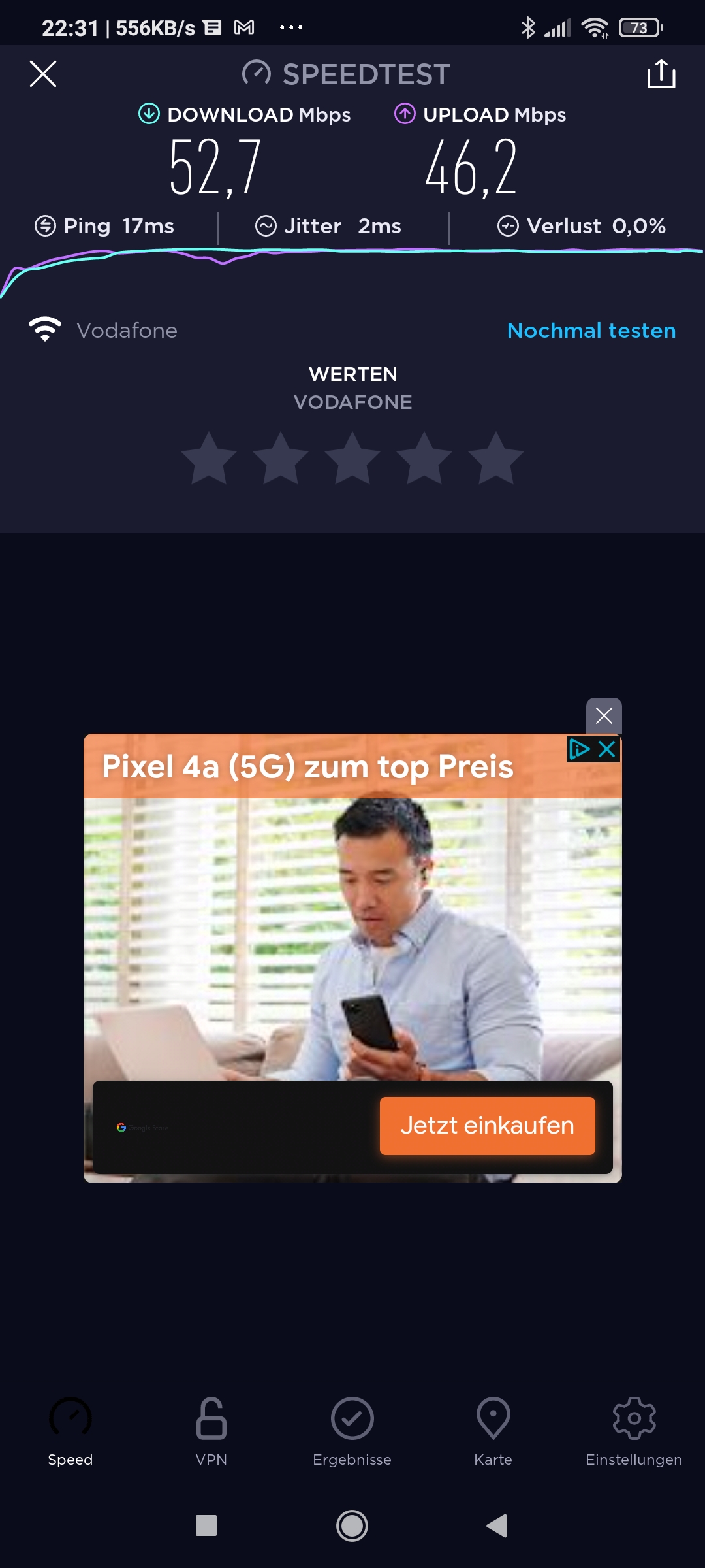 Die Differenz zwischen den drei Messungen ist erstaunlich – danke Vodafone! Immerhin sind der Ping und die Upload-Geschwindigkeit ziemlich gut. Nun folgen drei Messungen in derselben Testumgebung mit meinem Smartphone direkt neben dem Rock Space AC1200: