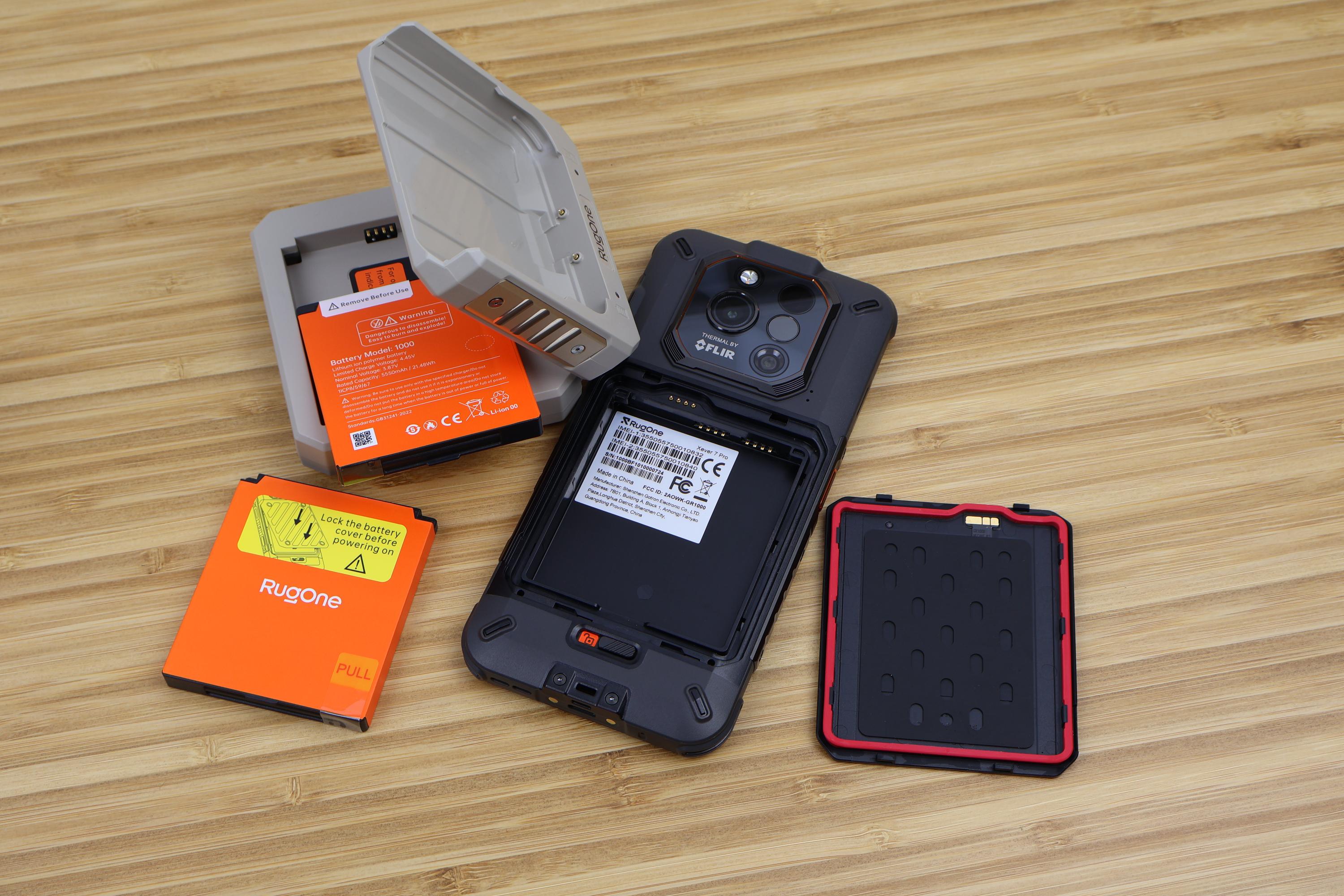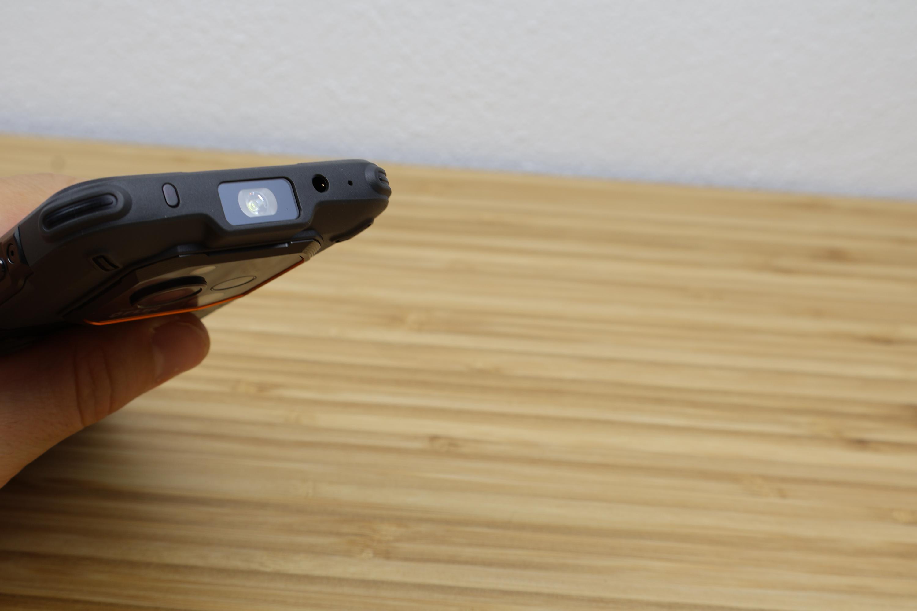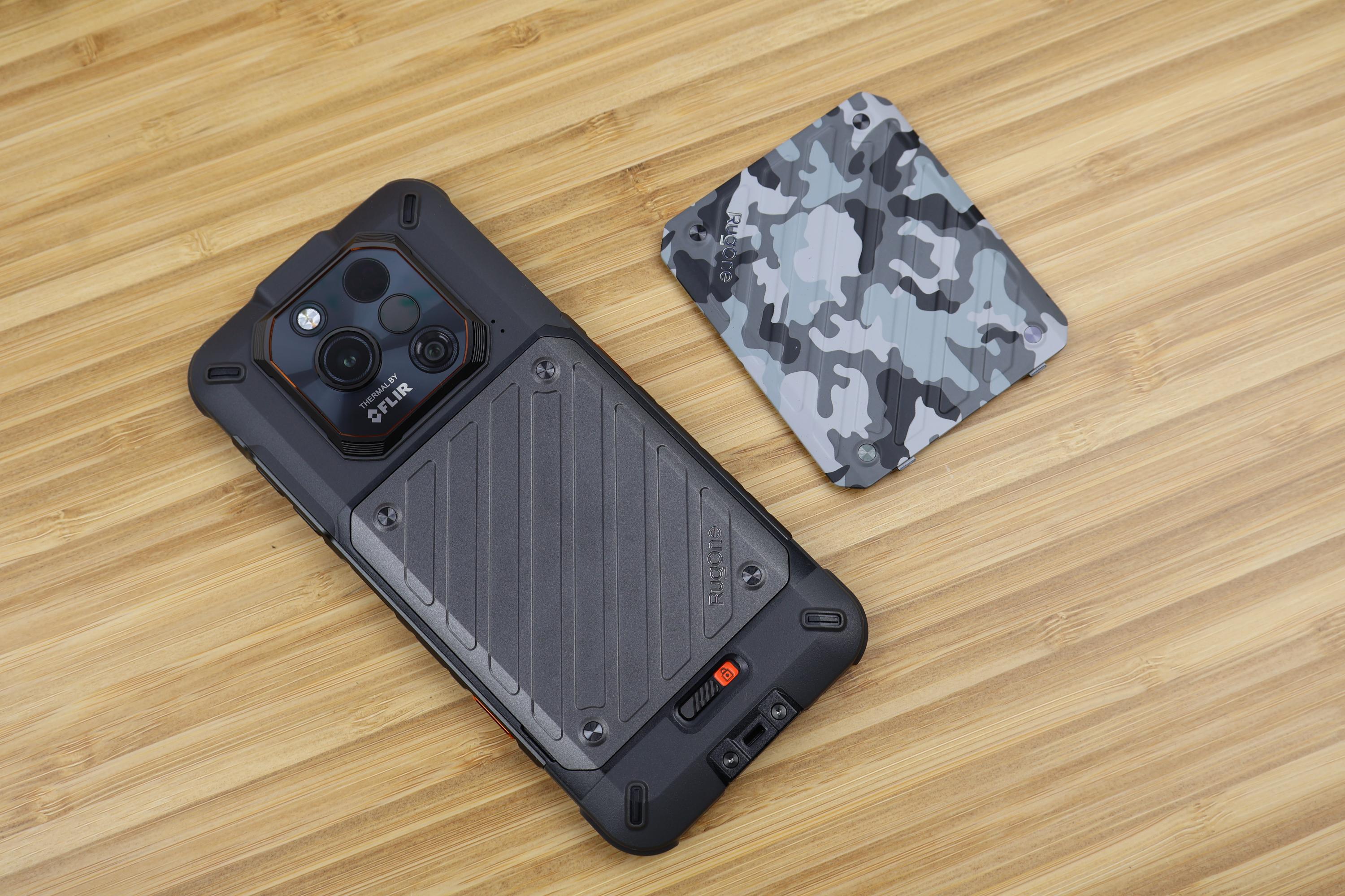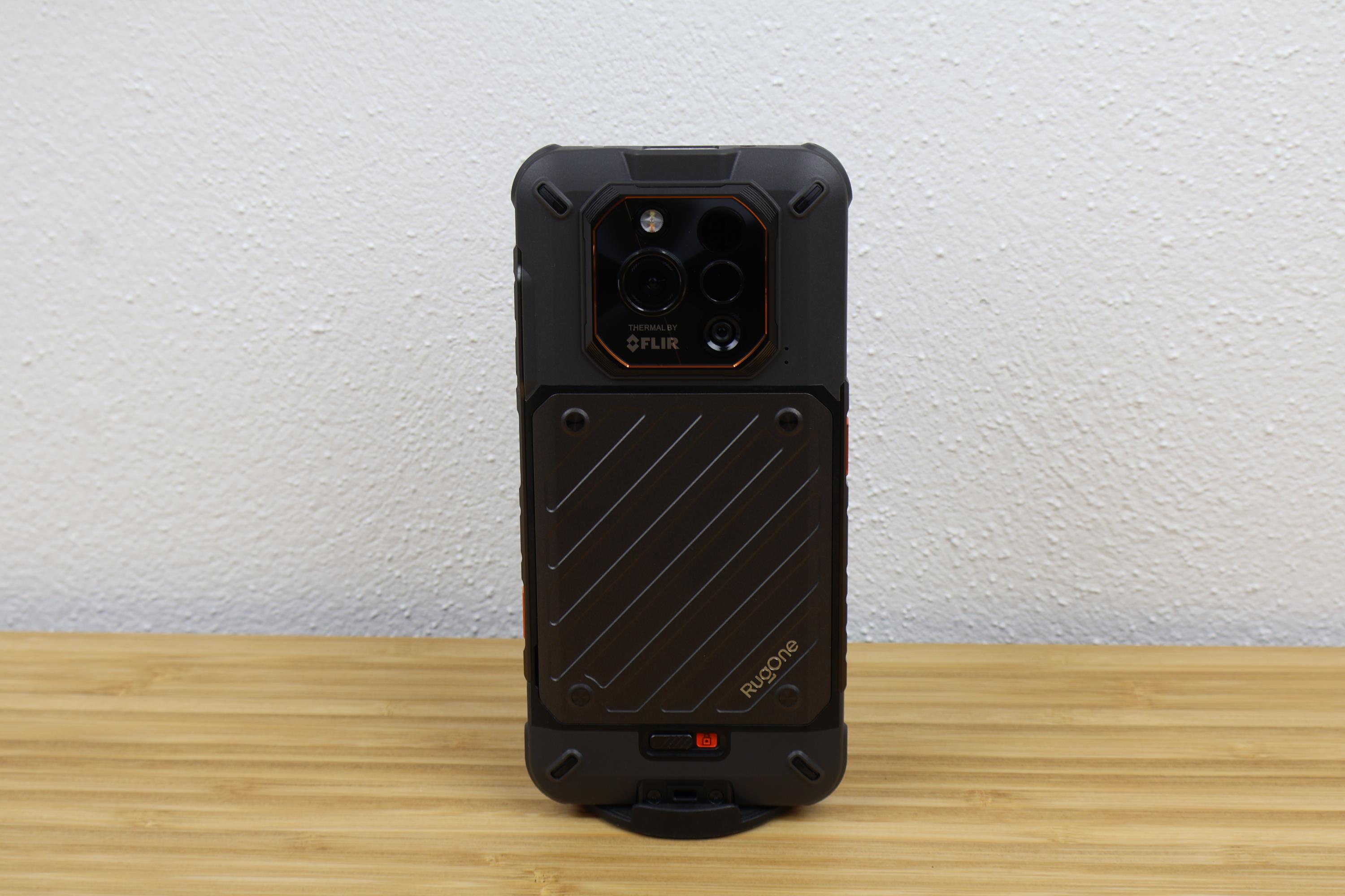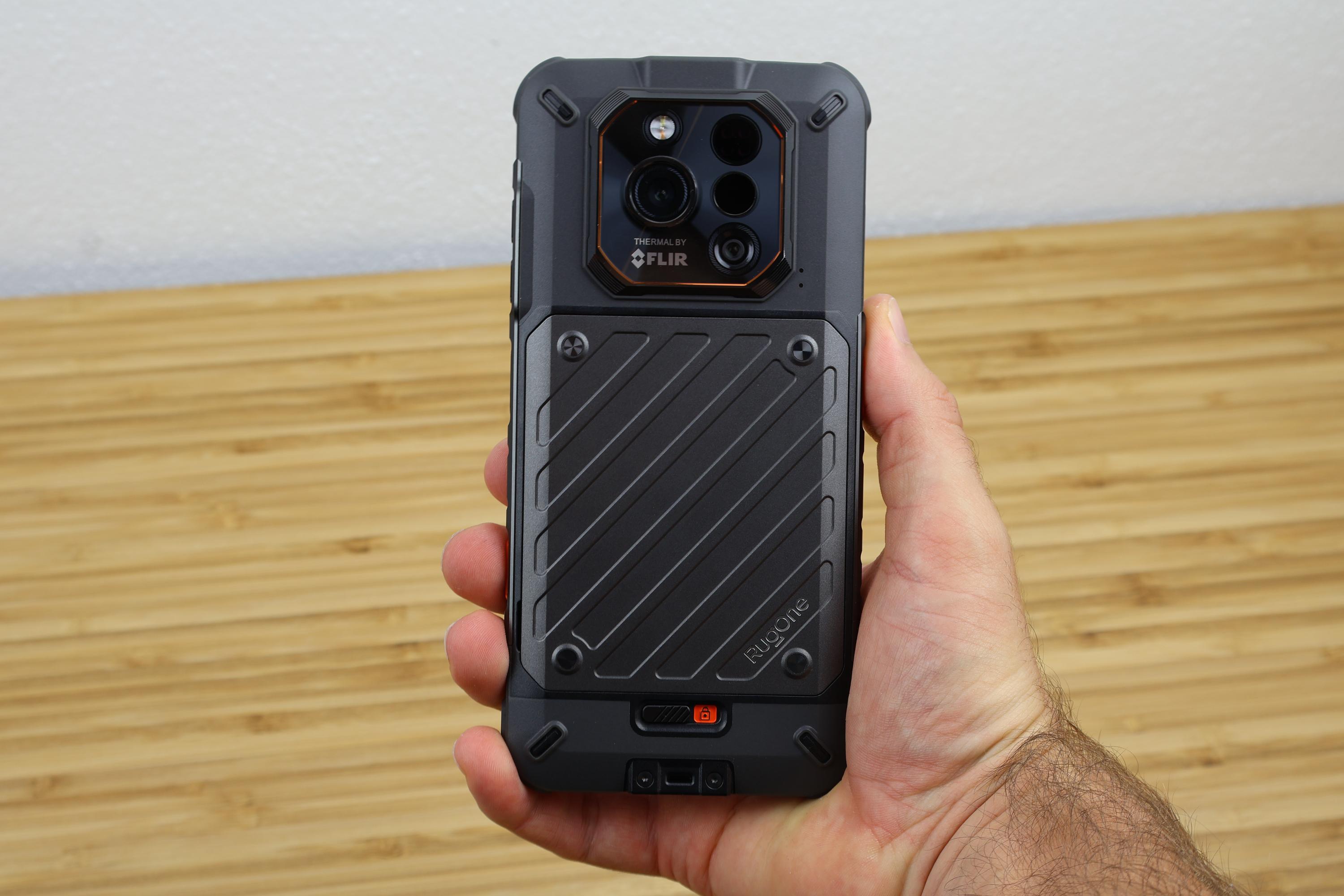 Viel spannender ist die Rückseite des Rugone Xever 7 Pro, denn hier verbirgt sich die Batterieabdeckung, die durch einen Schiebeschalter gesichert wird. Dieser ist sicher genug fixiert, um nicht aus Versehen die Abdeckung zu lösen. Die Abdeckung ist nur aus Kunststoff gefertigt. Beeindruckend ist, dass das Smartphone trotzdem nach IP68/69K wasserdicht ist. Ein Bad oder ein Unterwasserfoto hat das Rugone Xever 7 Pro ohne Probleme überstanden. Das Kameramodul umfasst neben dem LED-Flash, noch die Hauptkamera, Nachtsichtkamera, IR-LED und Wärmebildsensor und steht 2mm aus dem Gehäuse hervor. Durch die zentrale Anordnung wackelt das Smartphone auf dem Tisch nicht. Sämtliche Elemente werden durch Glas gesichert, genauso wie die Front-LED für die Taschenlampe.