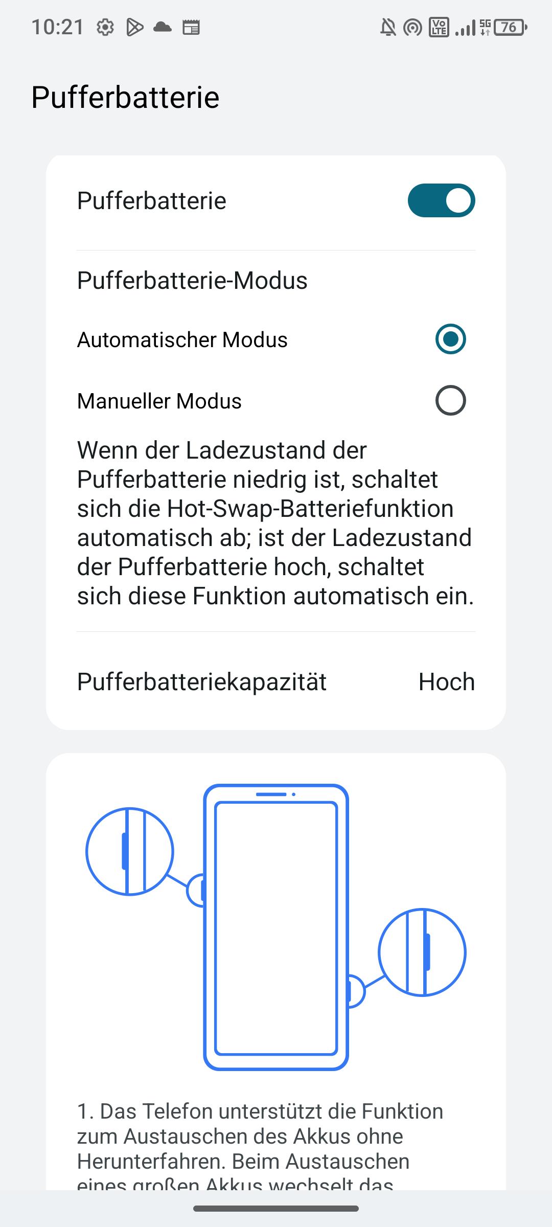 Der Tausch des Akkus ist im laufenden Betrieb möglich. Im Smartphone selbst ist eine kleine Pufferbatterie verbaut, die aktiviert wird, sobald die Batterieabdeckung entfernt wurde. Dann bleiben 180 Sekunden Zeit, um den Akku zu tauschen. Sobald der Deckel wieder geschlossen ist, kehrt das Smartphone automatisch in den regulären Modus zurück. Realistisch benötigt ihr nur rund 30 Sekunden für den Tausch.